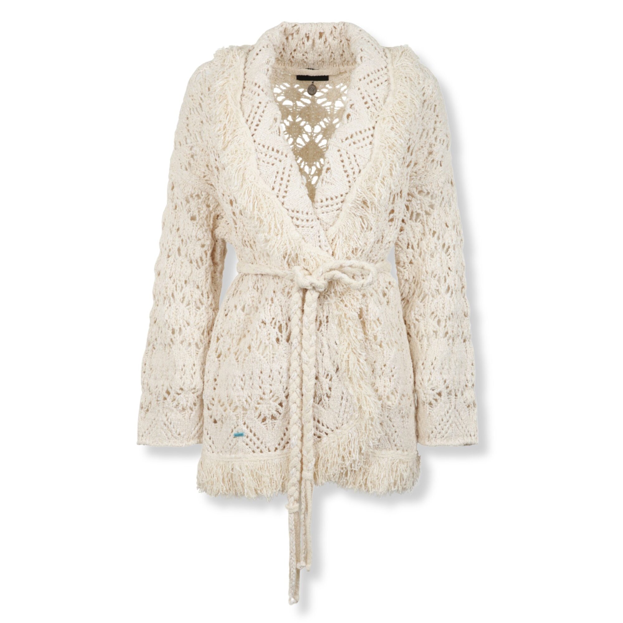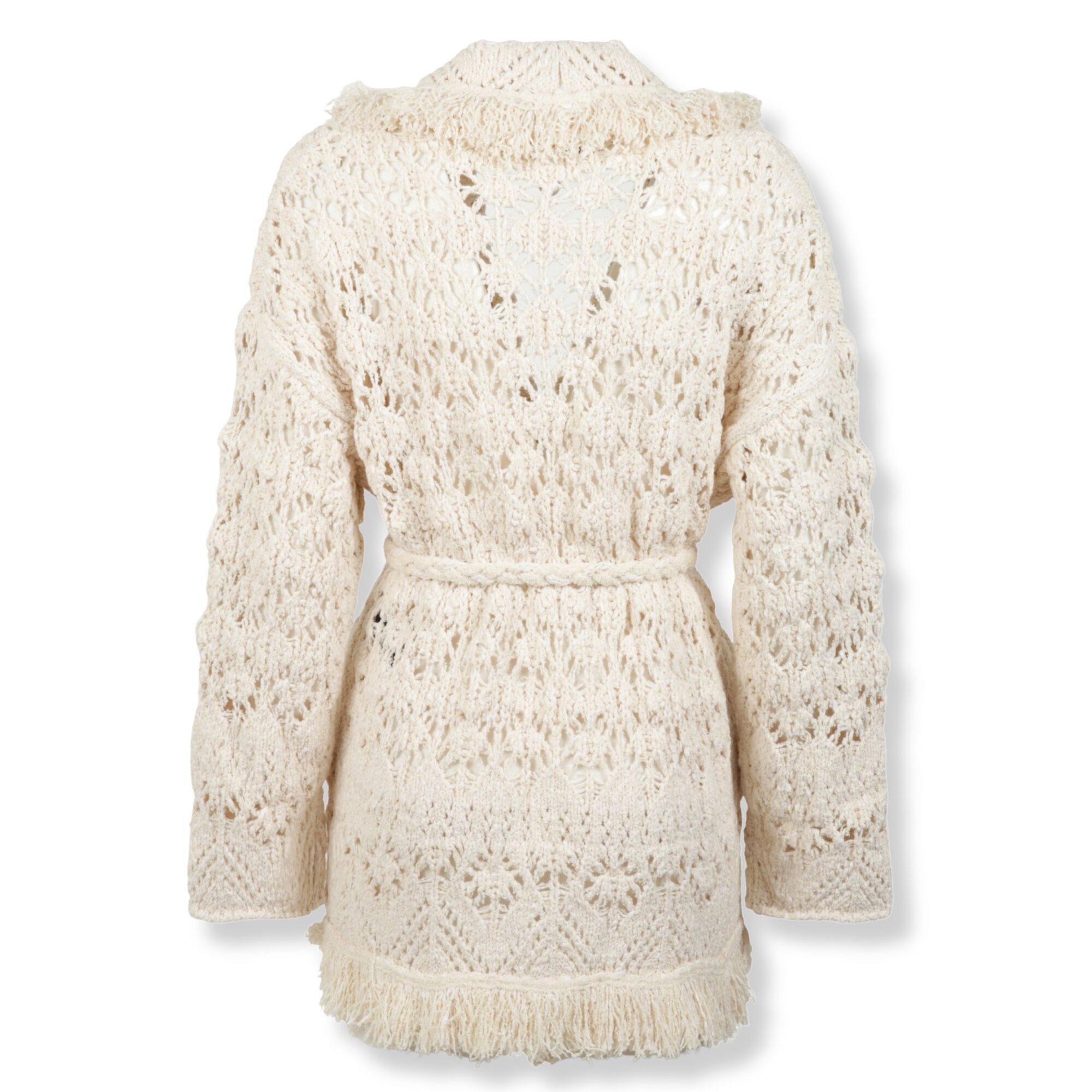 Lagoon Romance Cardigan Alanui. Iconico design a maglia traforata, rifinito con bordi sfrangiati e chiusura con cintura torchon coordinata.