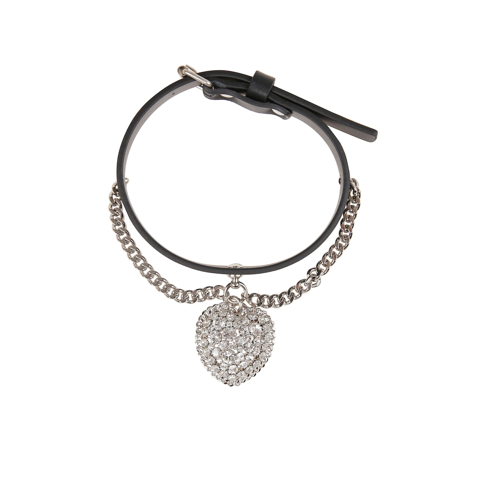 Collana girocollo in pelle e catenina metallica. Pendente a cuore, con pavé di cristalli, applicato alla catenina metallica. Chiusura a fibbia.