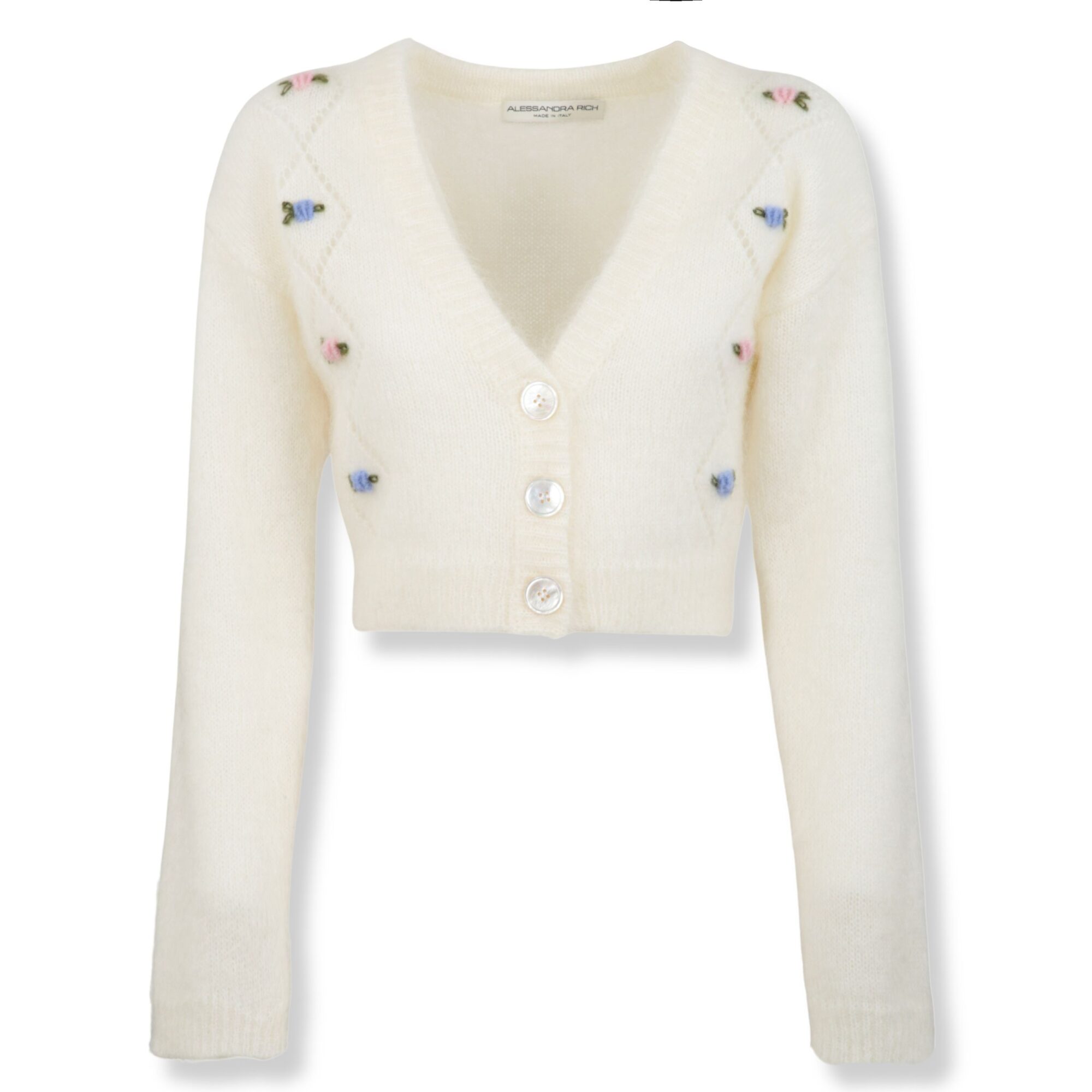 Carded Mohair Cardigan Alessandra Rich. Taglio corto e scollo a V, chiusura frontale con bottoni. Delicati motivi floreali ricamati.