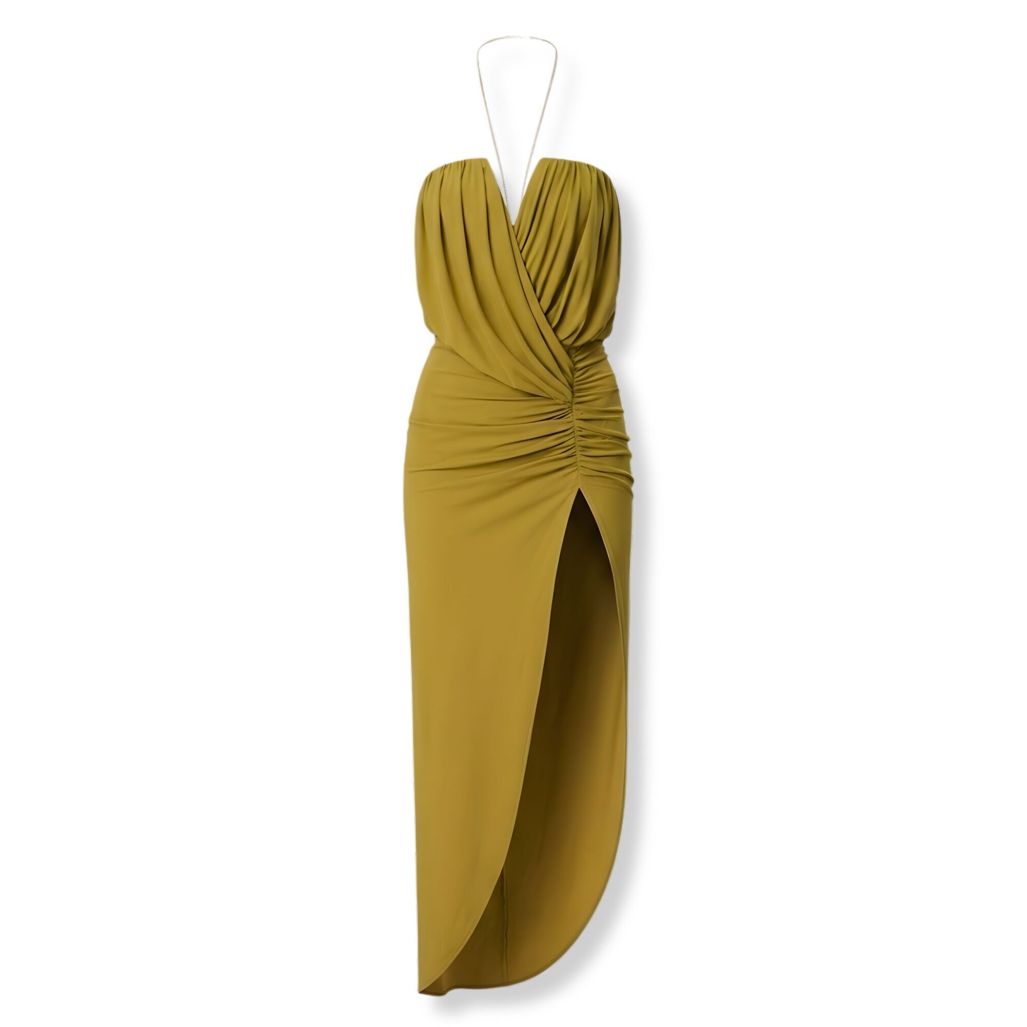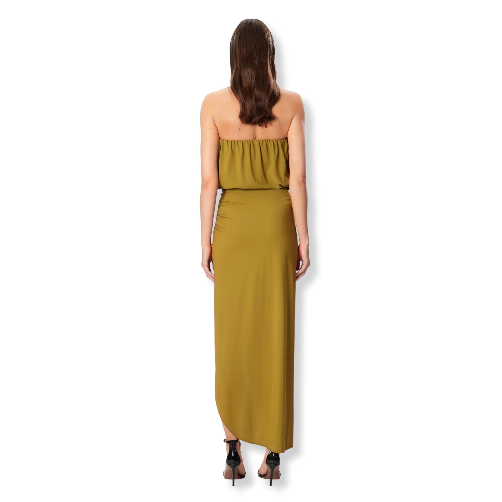 Giselle Dress Amazuìn. Corpetto drappeggiato e allacciatura al collo, spalle scoperte. Gonna con spacco alto e orlo arrotondato.