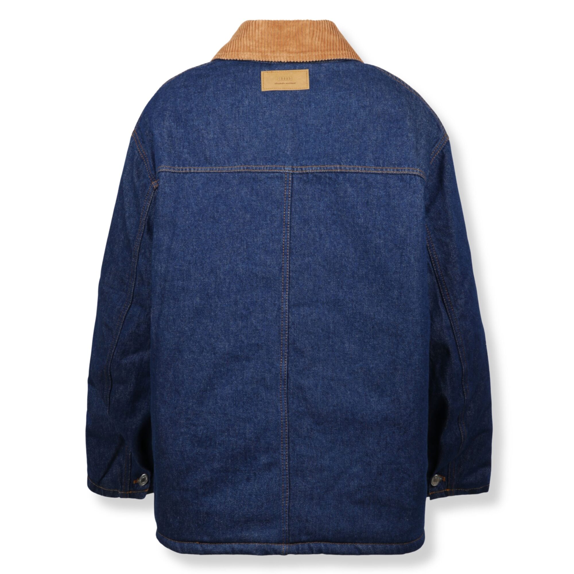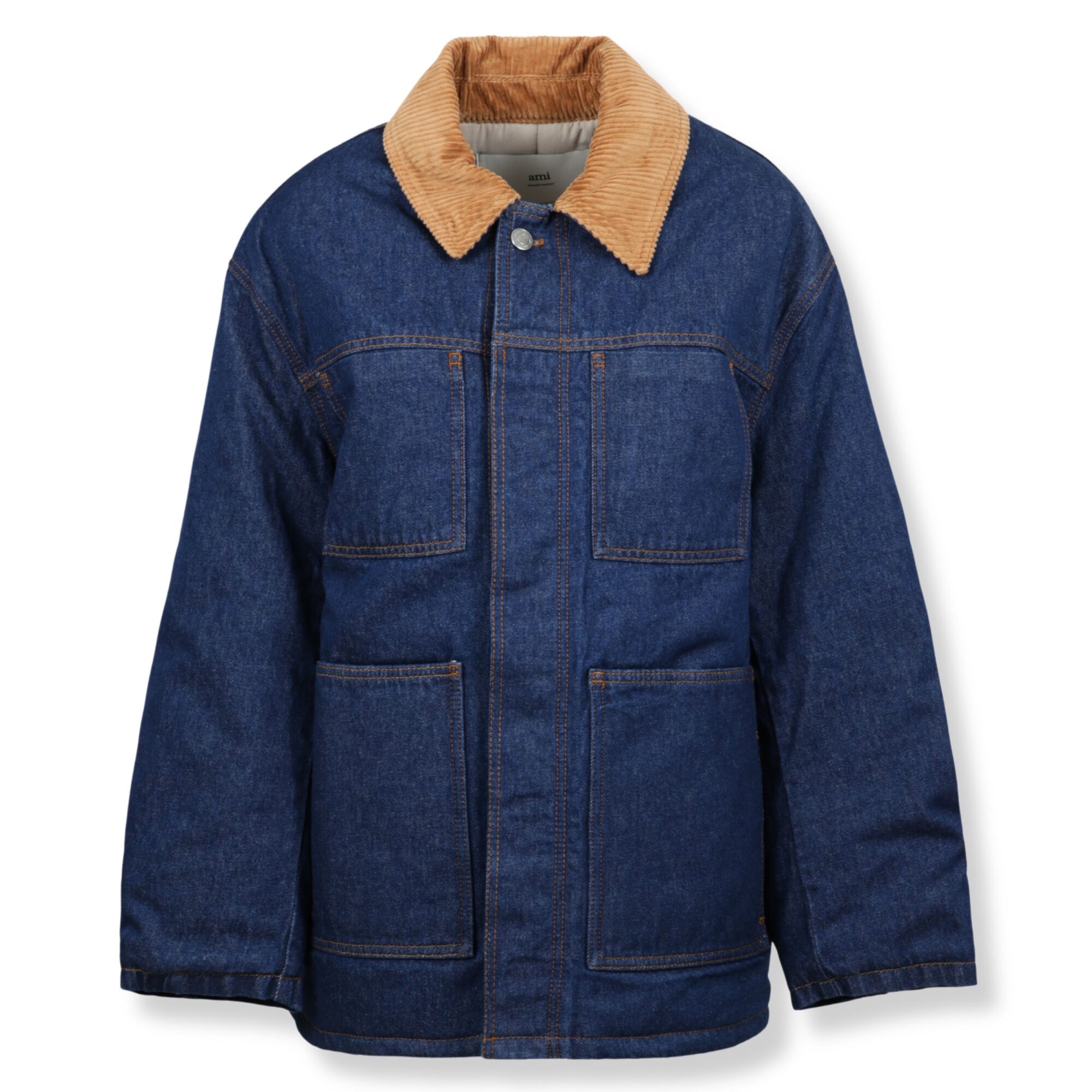 Giacca worker imbottita Ami Paris. Design in denim con impunture a vista e collo in velluto a coste. Chiusura frontale nascosta e polsini con bottoni.