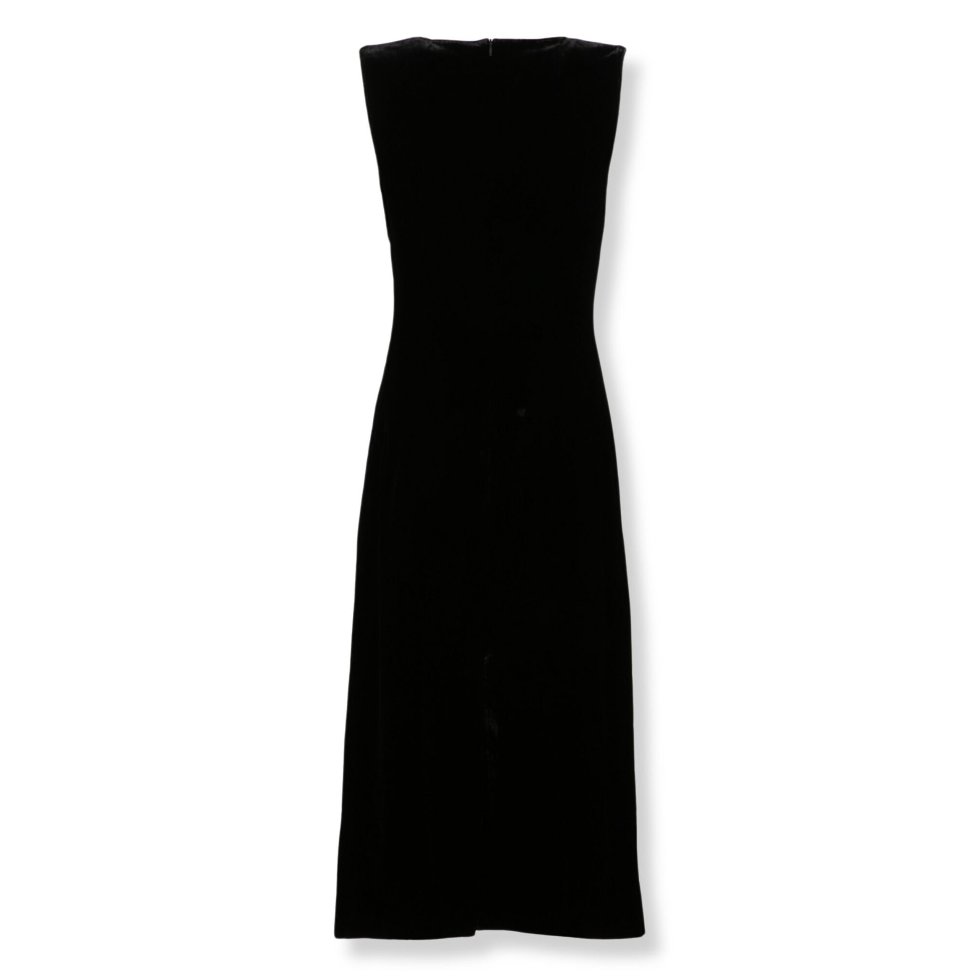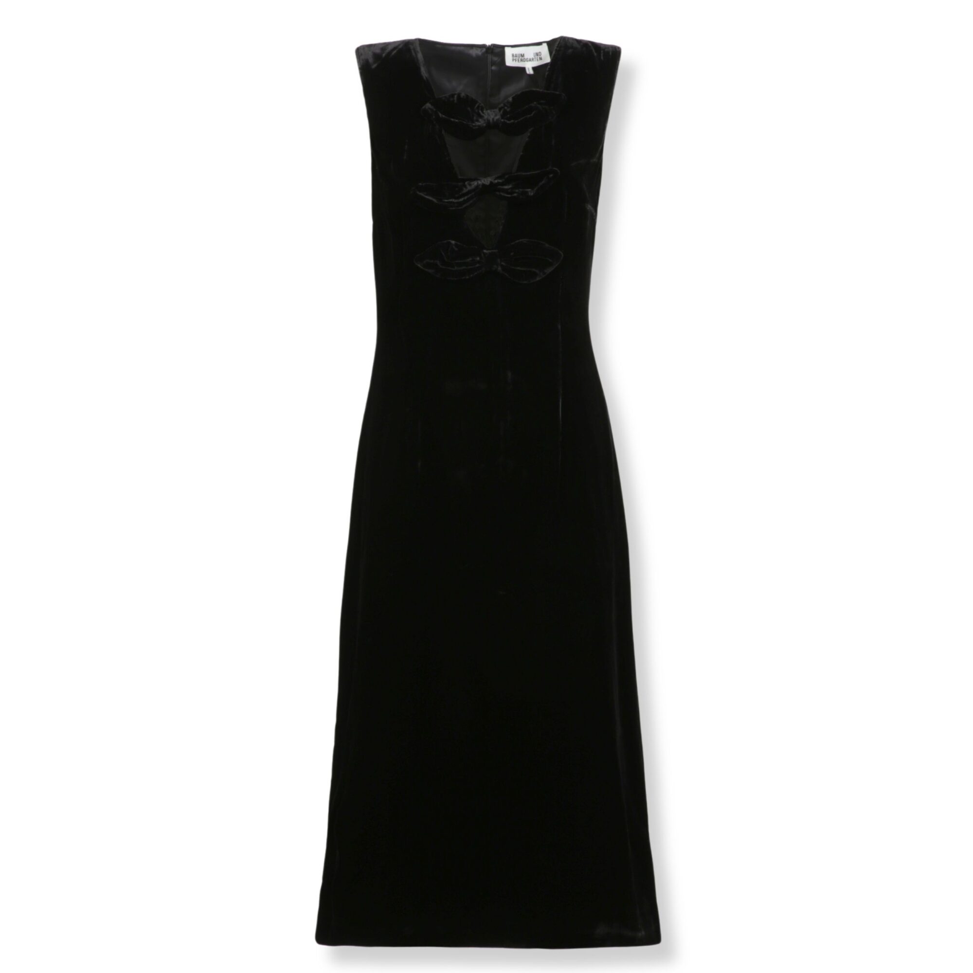 Abito Ajka Bam und Pfergarten. Design gonna lunga, smanicato, con scollo a V decorato con fiocchi sul petto.