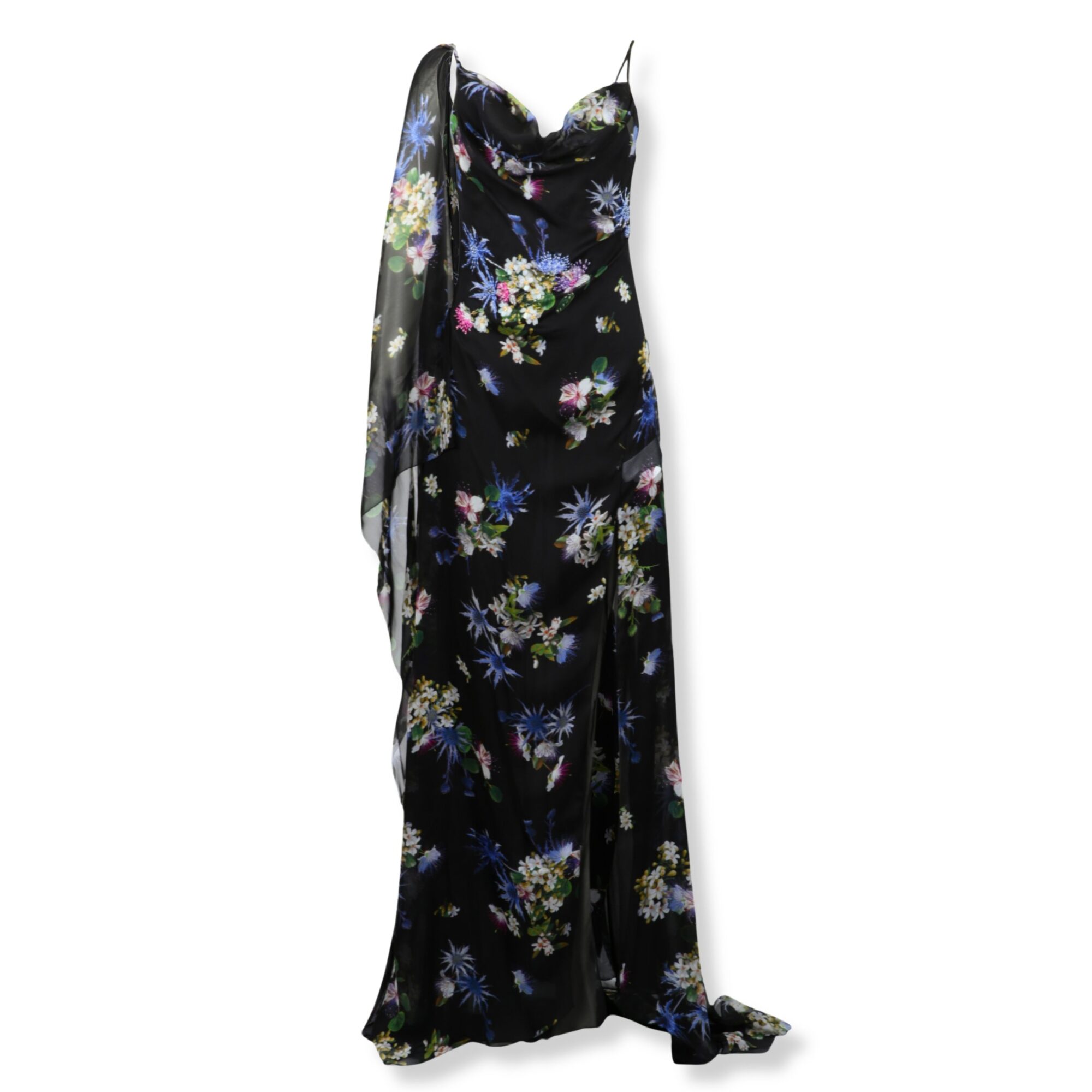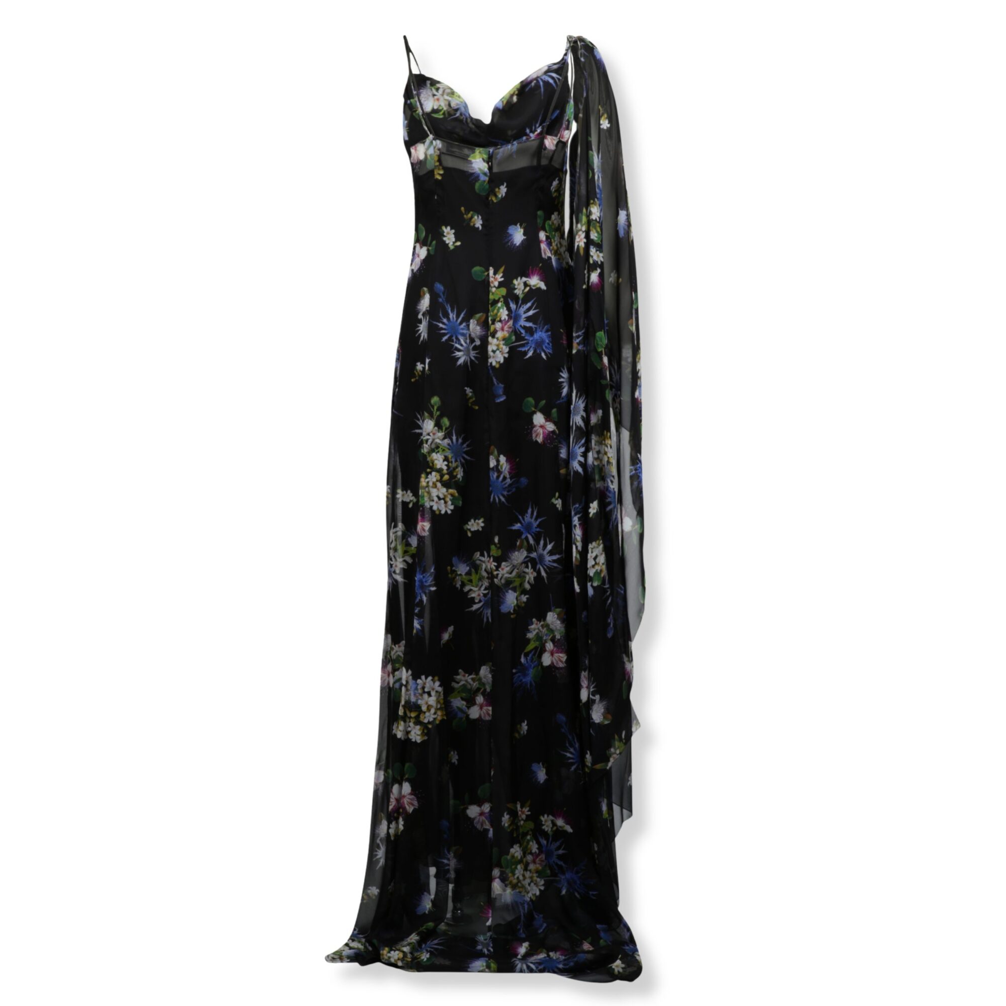 Abito Blumarine. In chiffon di seta con stampa floreale. Spalline sottili, scollatura a cappuccio con sciarpa che scende sul retro. Gonna profonda con spacco laterale.