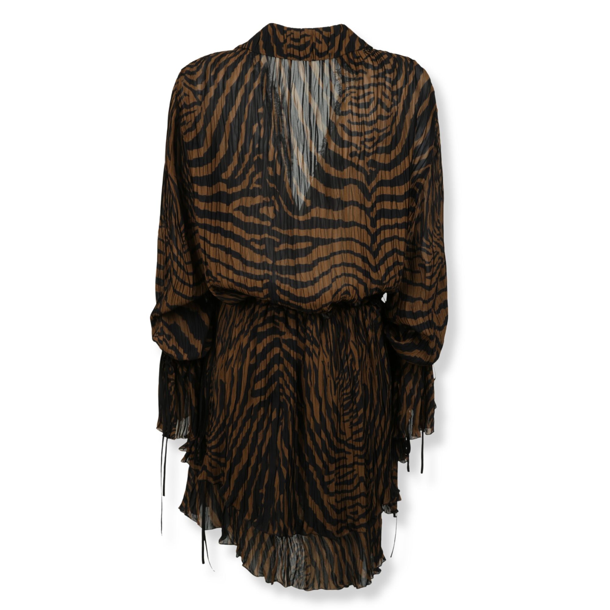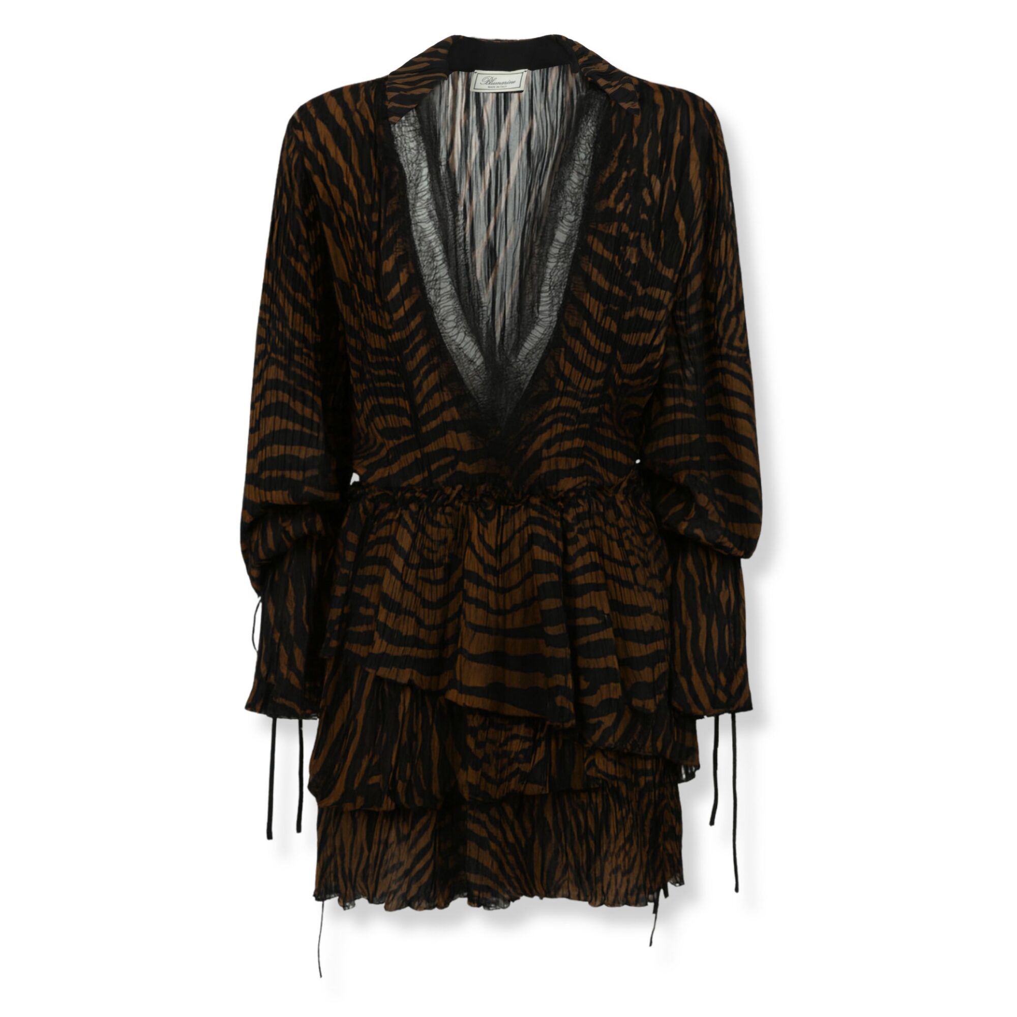 Mini abito Blumarine. Design in chiffon di viscosa plissé con motivo bicolore su tutta la superficie. Ampio scollo a V rifinito con inserti in pizzo, polsini e gonna a volant con sottili lacci decorativi.
