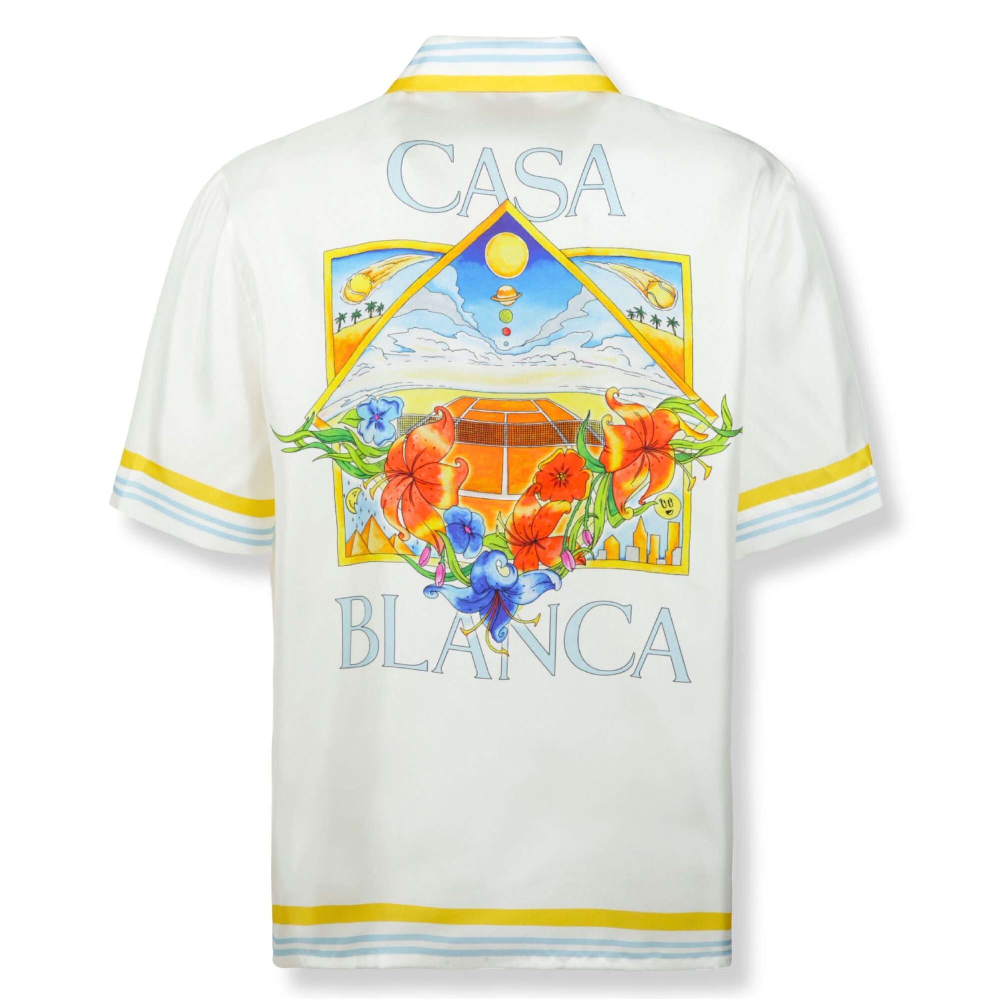 Camicia Casablanca. Colletto cubano e chiusura frontale con bottoni coperti, motivo a righe multicolore sui bordi. Maxi-stampa sul retro e su taschino sul petto.