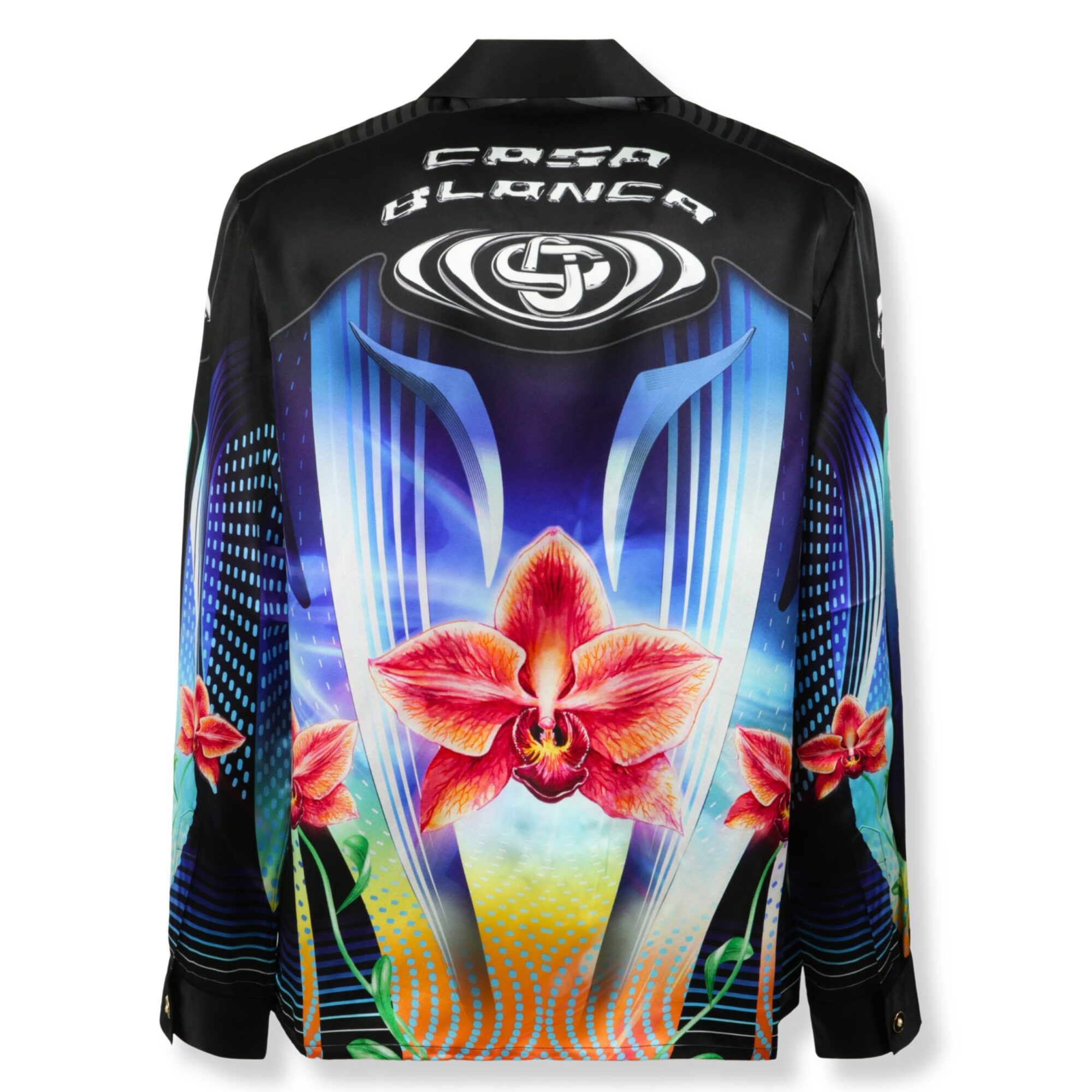 Orchid Racer Shirt Casablanca. Stampa su tutto il corpo e taschino sul petto, colletto cubano e abbottonatura coperta.
