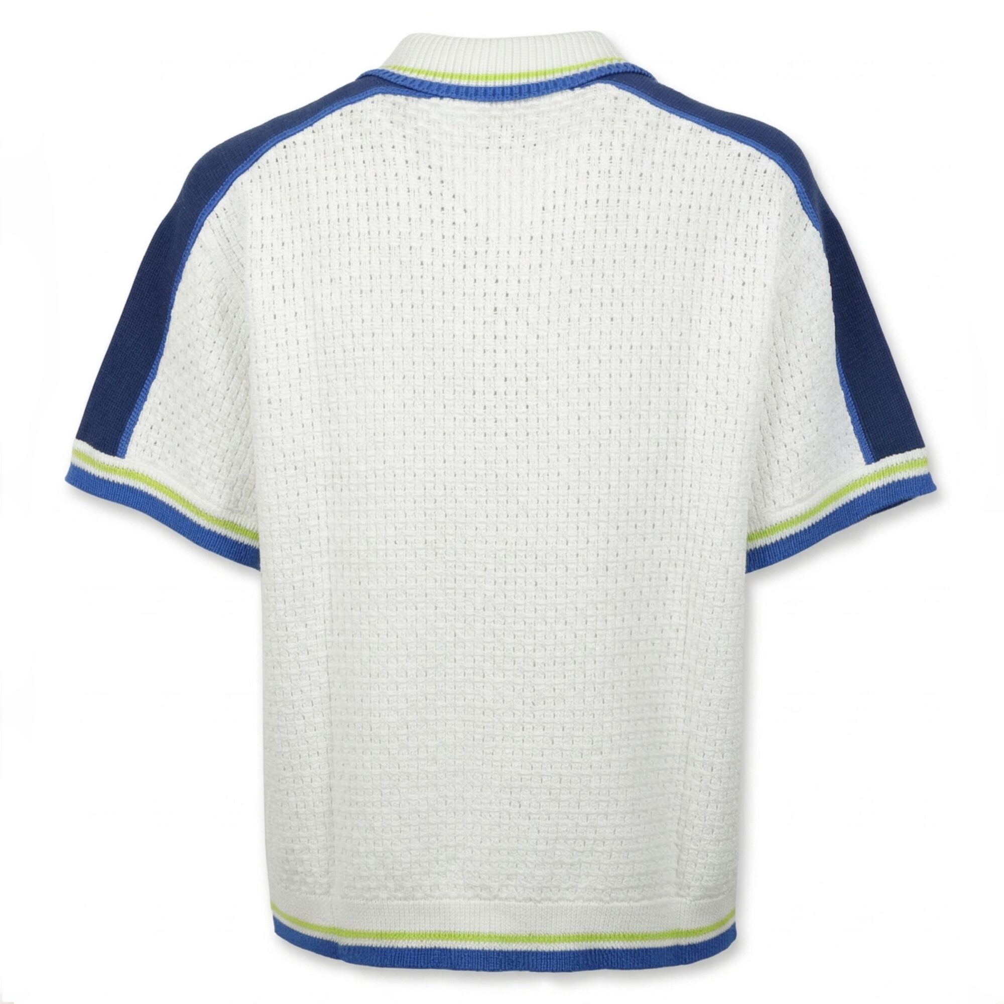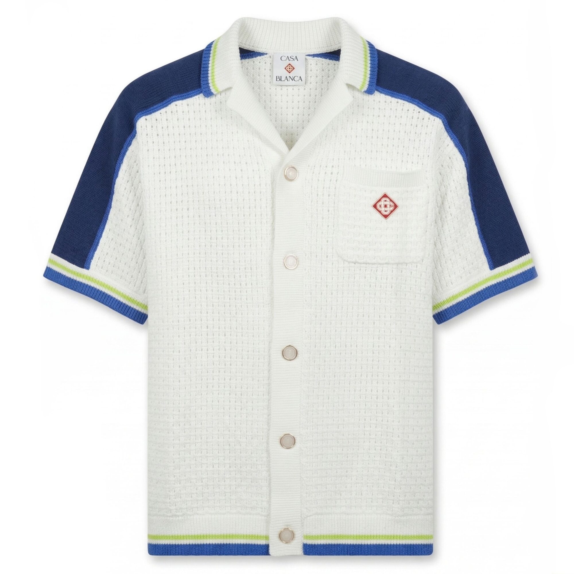 Short Sleeve Crochet Shirt Casablanca. Spalle e maniche con dettagli a strisce, colletto cubano, taschino sul petto con logo del brand.