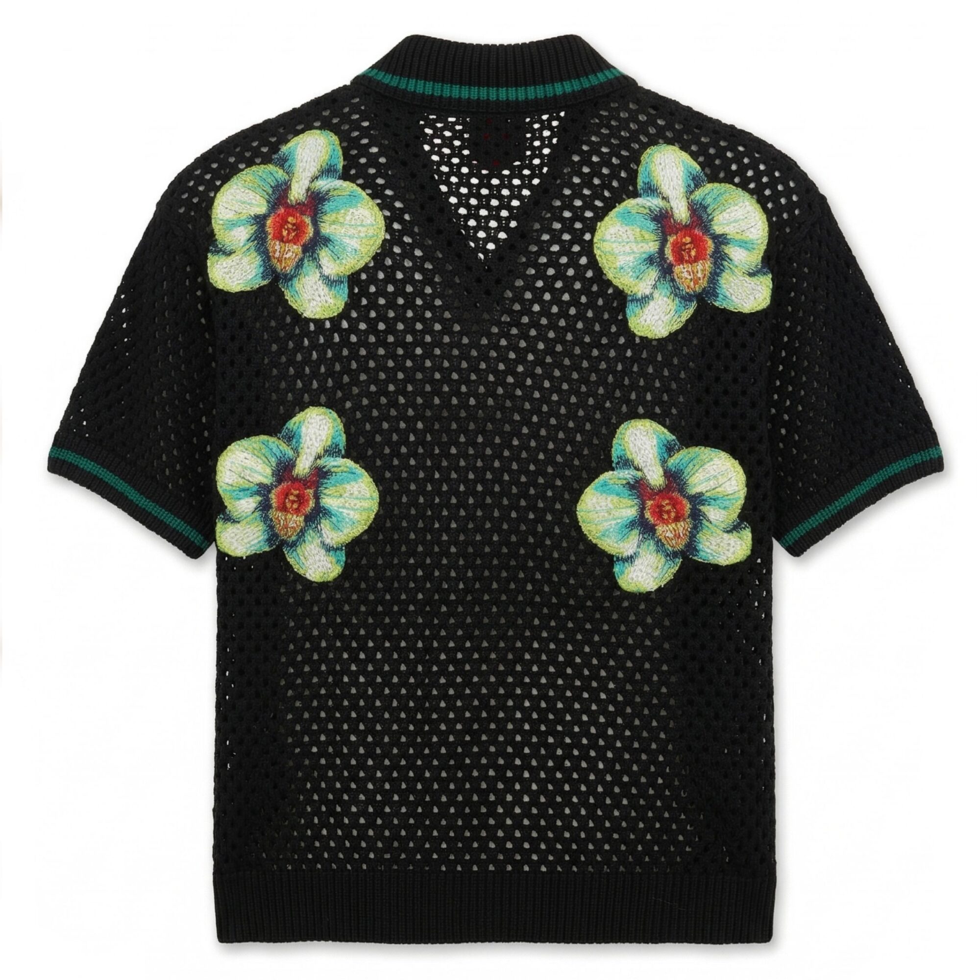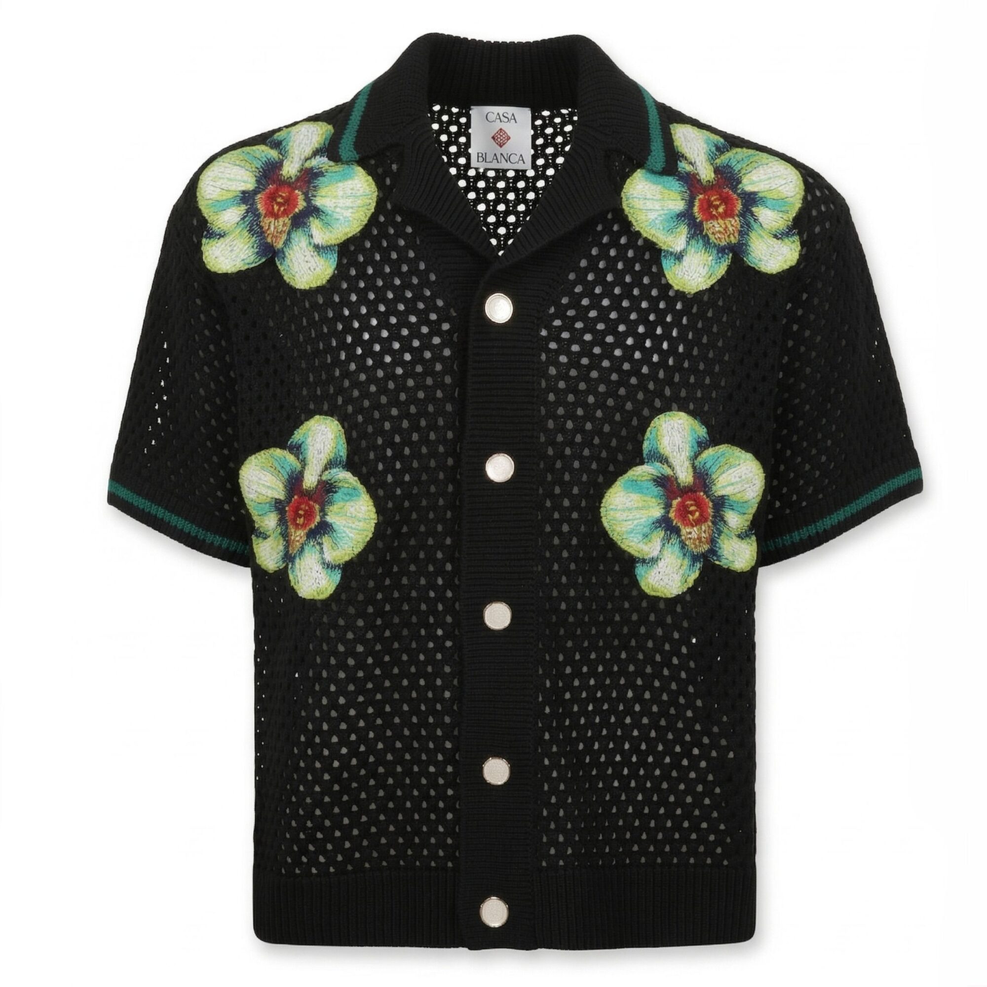 Short Sleeve Crochet Shirt Casablanca. Stampa Glitch Orchid del brand, colletto cubano e bordi rifiniti a costine.