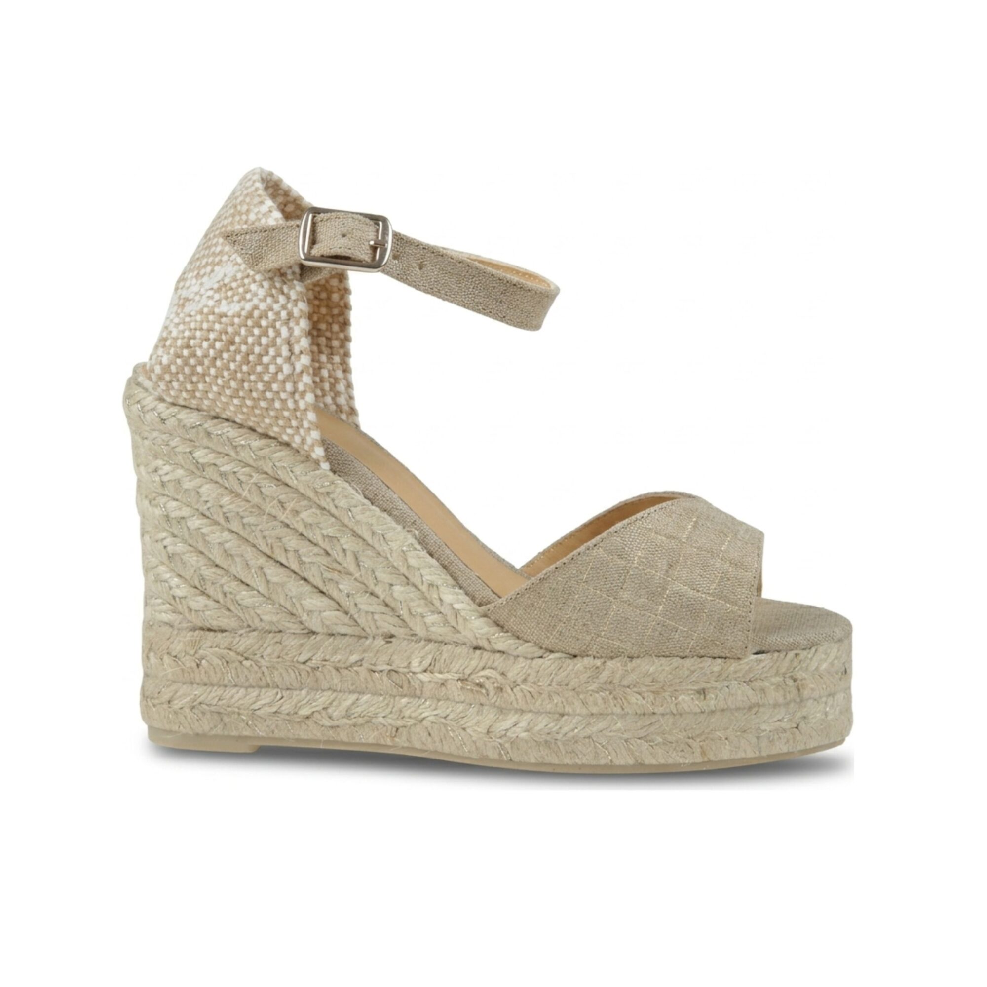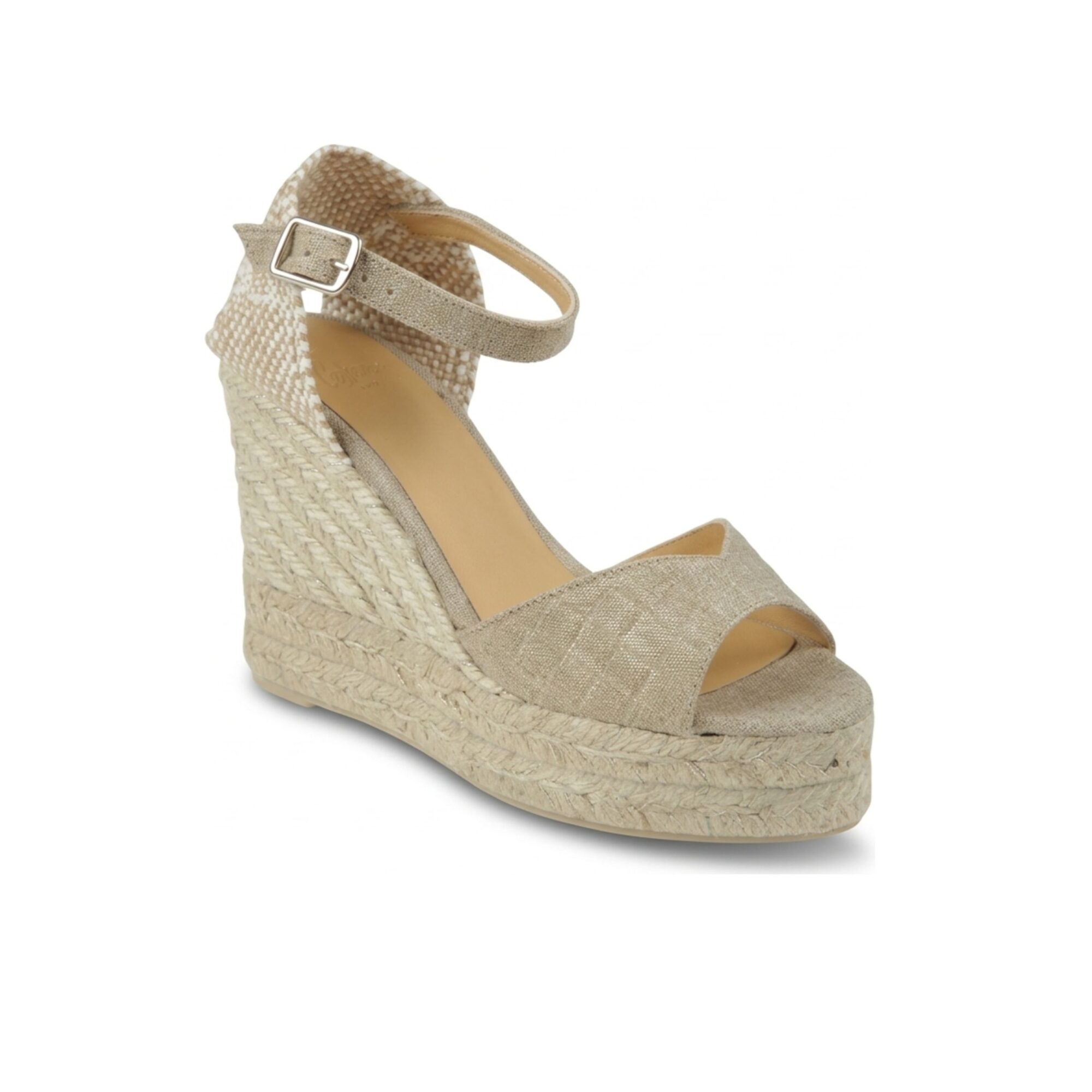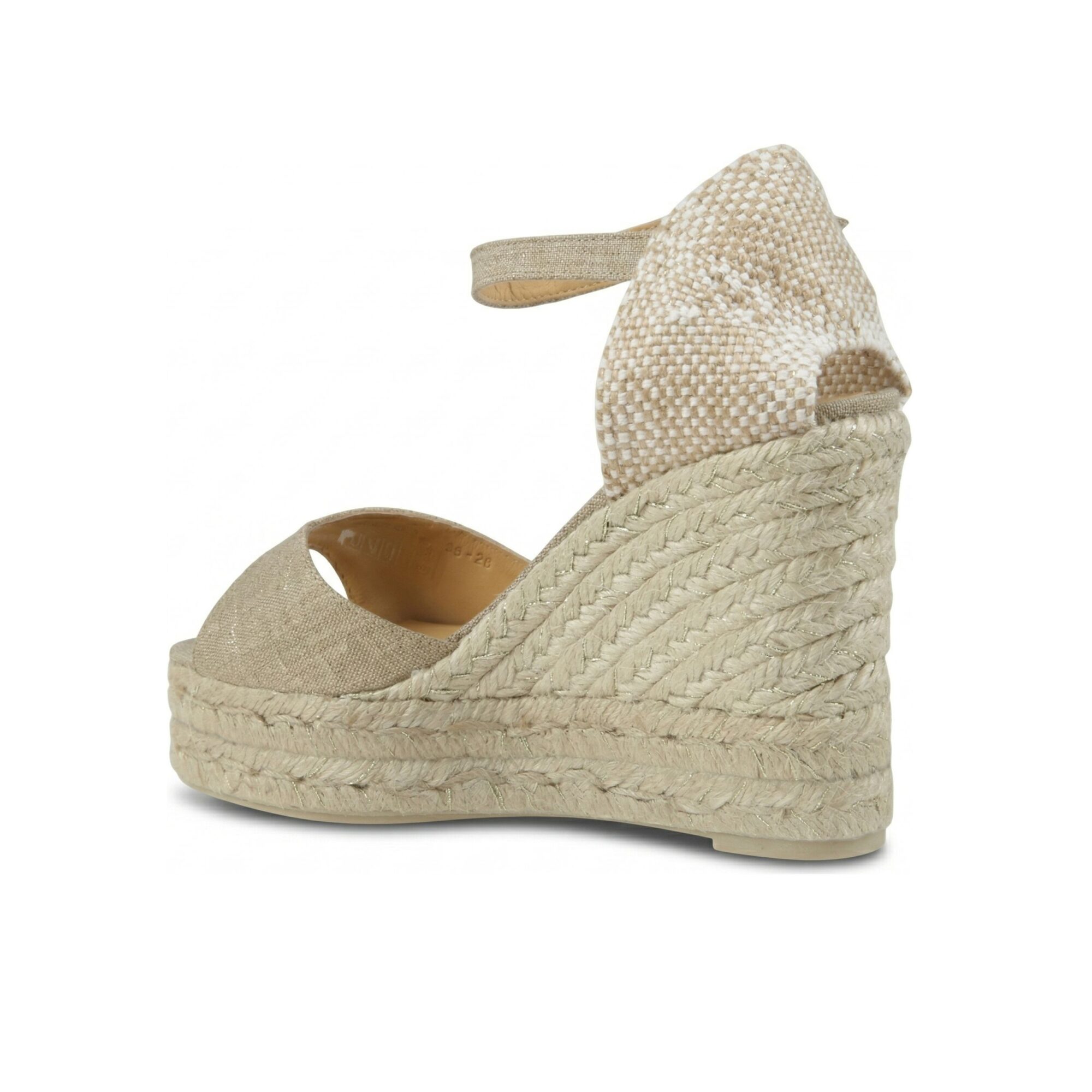 Sandali Blaudi Castaner. Tomaia in lino metallizzato trapuntato, cinturino alla caviglia, zeppa in juta intrecciata con filo lurex.