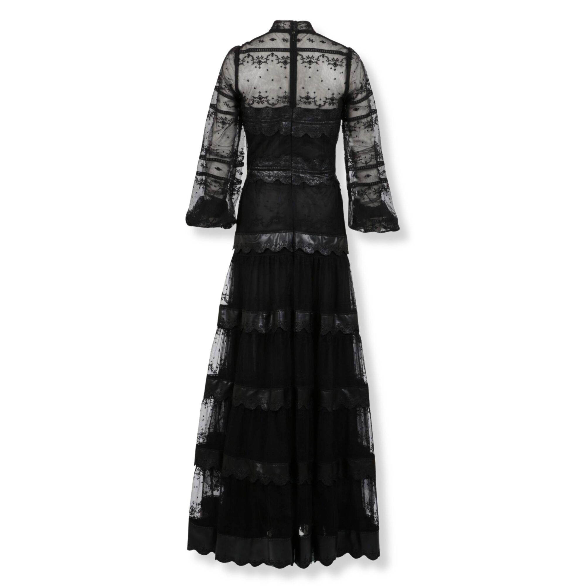Jacey Embroidered Tulle Faux Leather Gown Costarellos. Desing stratificato, in tulle finemente ricamato. Scollo alto e maniche voluminose in blouson.
