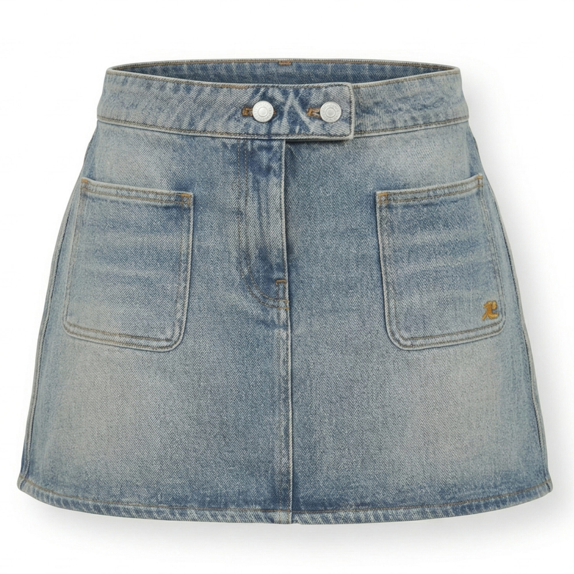 Signature Denim Mini Skirt. Vita alta, chiusura con due bottoni, tasche applicate sul davanti.