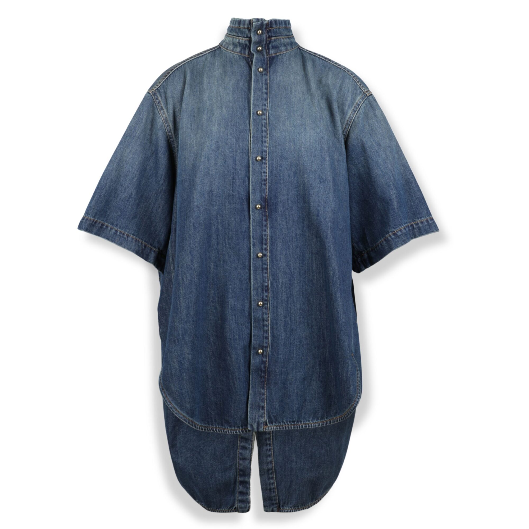 Roberta Denim Shirt Darkpark. Vestibilità rilassata, spalle scese e maniche corte. Colletto alto e chiusura a bottoni frontale, orlo inferiore a profilo asimmetrico con coda posteriore e spacco centrale.