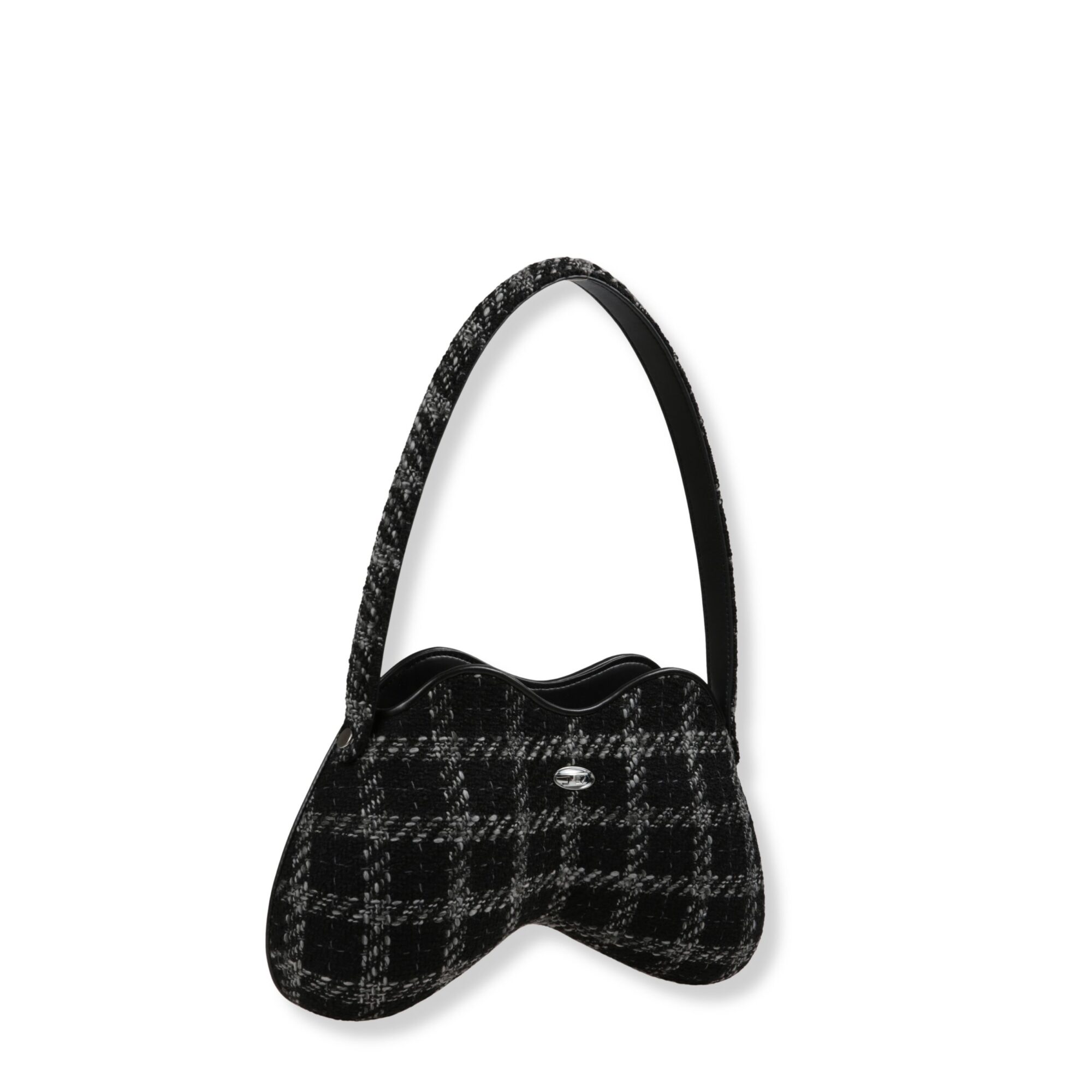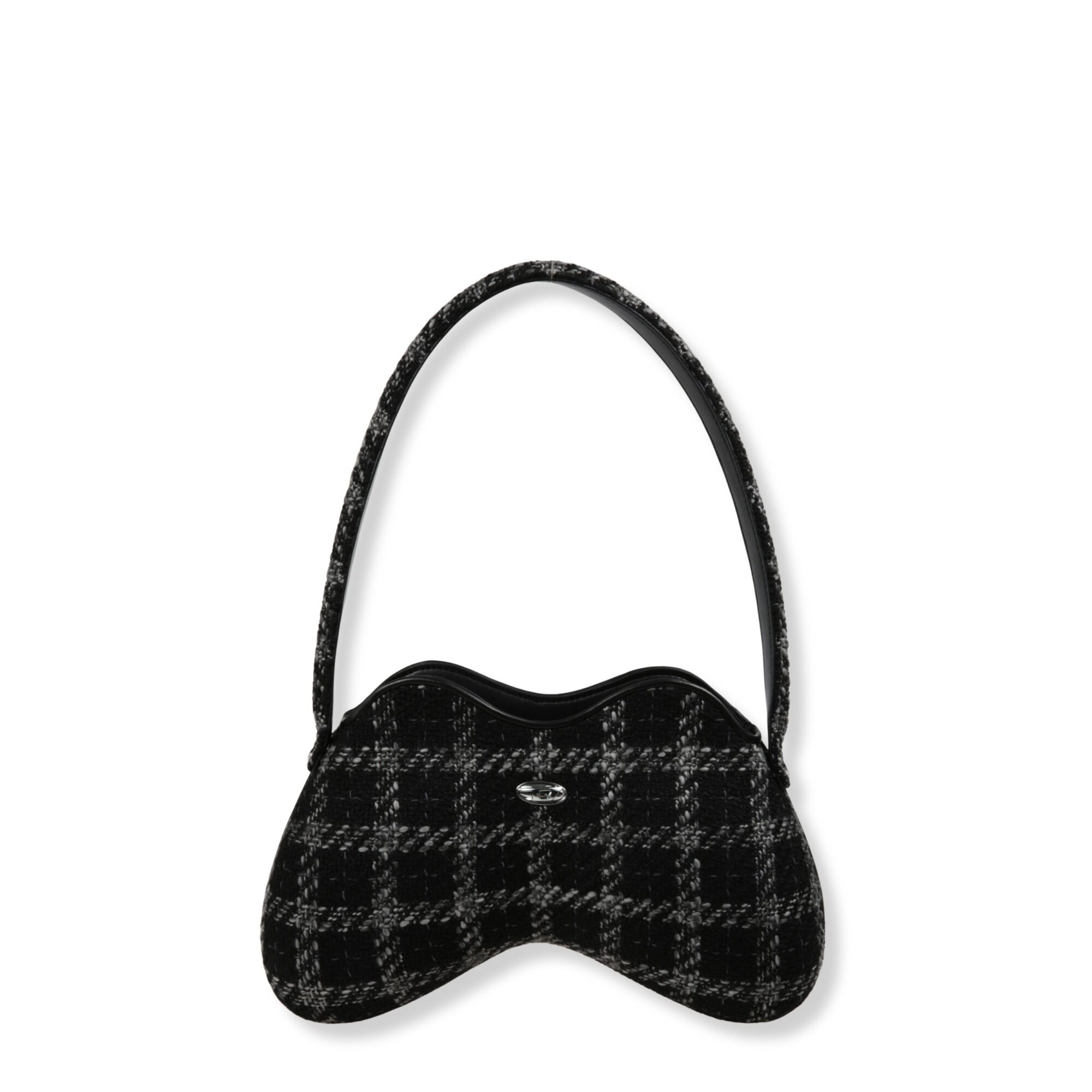 Double-D Shoulder Diesel. Modello iconico, rivestito in tessuto pied-de-poule bianco e nero. Tracolla fissa e logo Oval D del brand in metallo sul davanti.