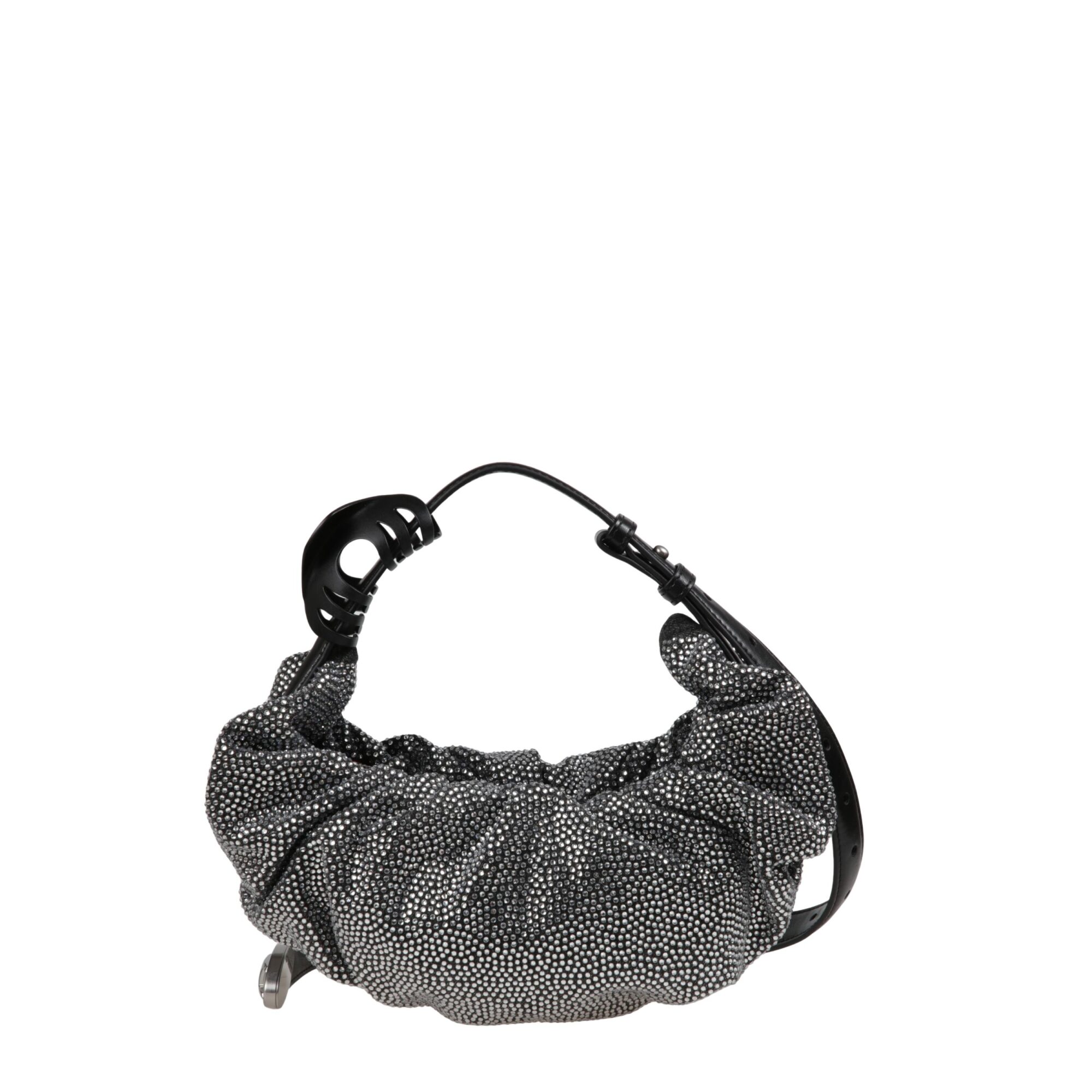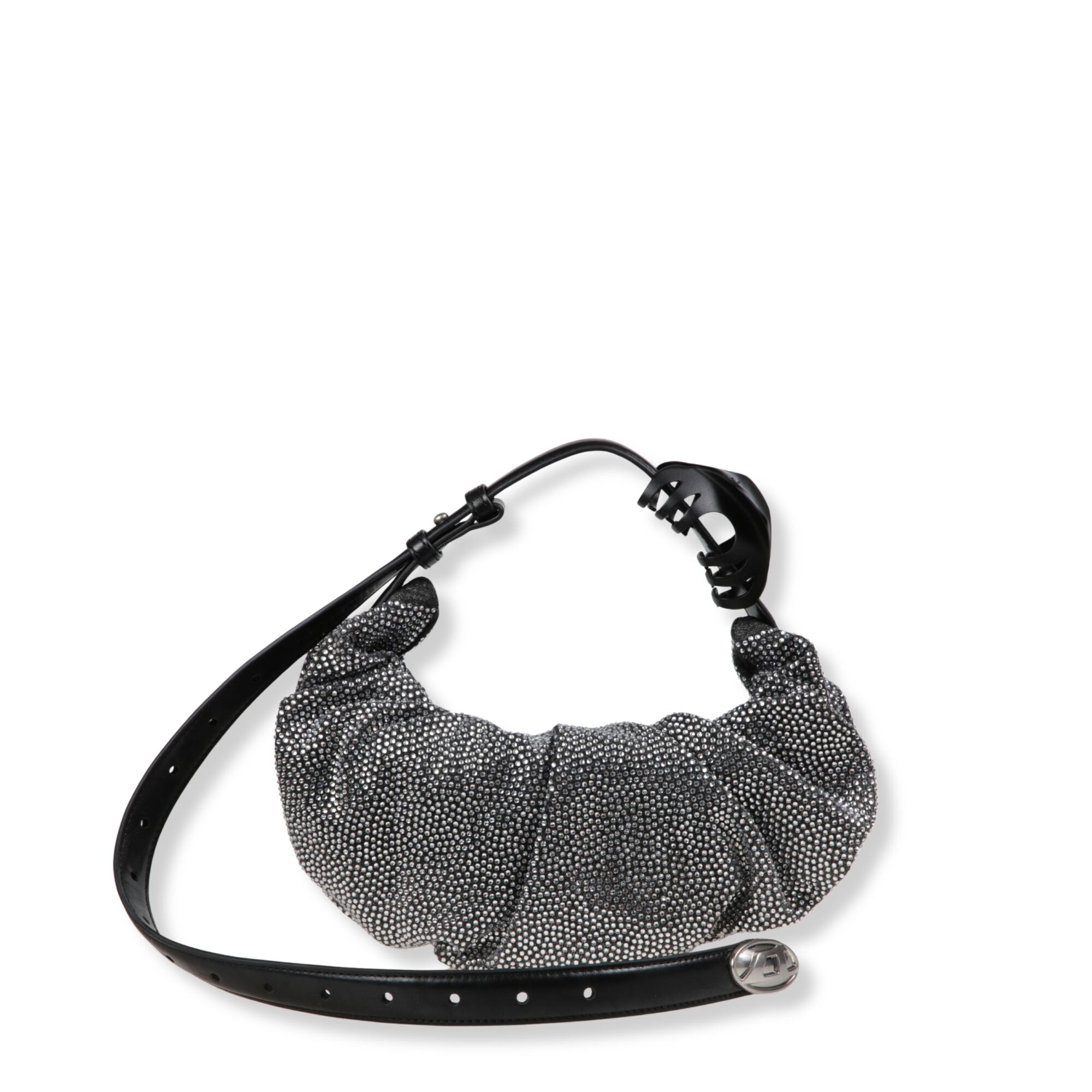 Grab-D Hobo S. Corpo arricciato, decorato con cristalli riflettenti. Manico a cintura con dettaglio pinza per capelli. Estremità del laccio con logo Oval D del brand in resina.
