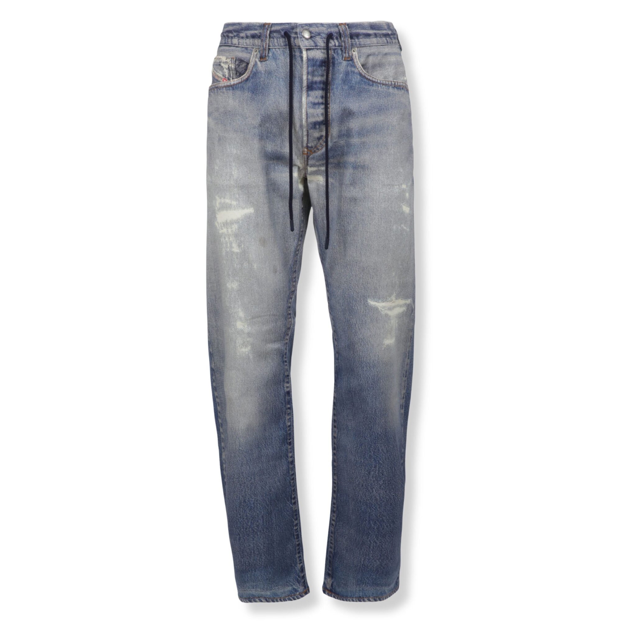 2080 D-Reel Joggjeans 068rx Diesel. Design a vita media, con gamba straight e pulita e coulisse in vita. Trattamenti effetto bleach con stone wash finale e stampa di abrasioni effetto vissuto.