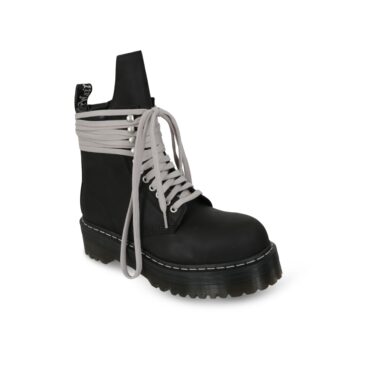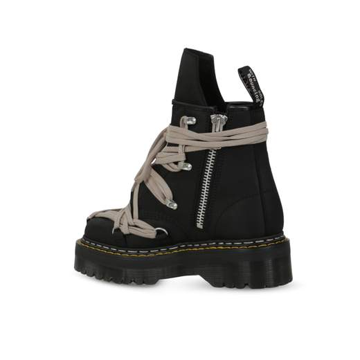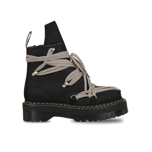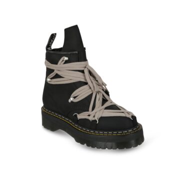 Stivaletti Dr. Martens x Rick Owens. Design in pelle nera, finitura opaca, con suola Quad e caratteristica allacciatura con sistema Megalace.