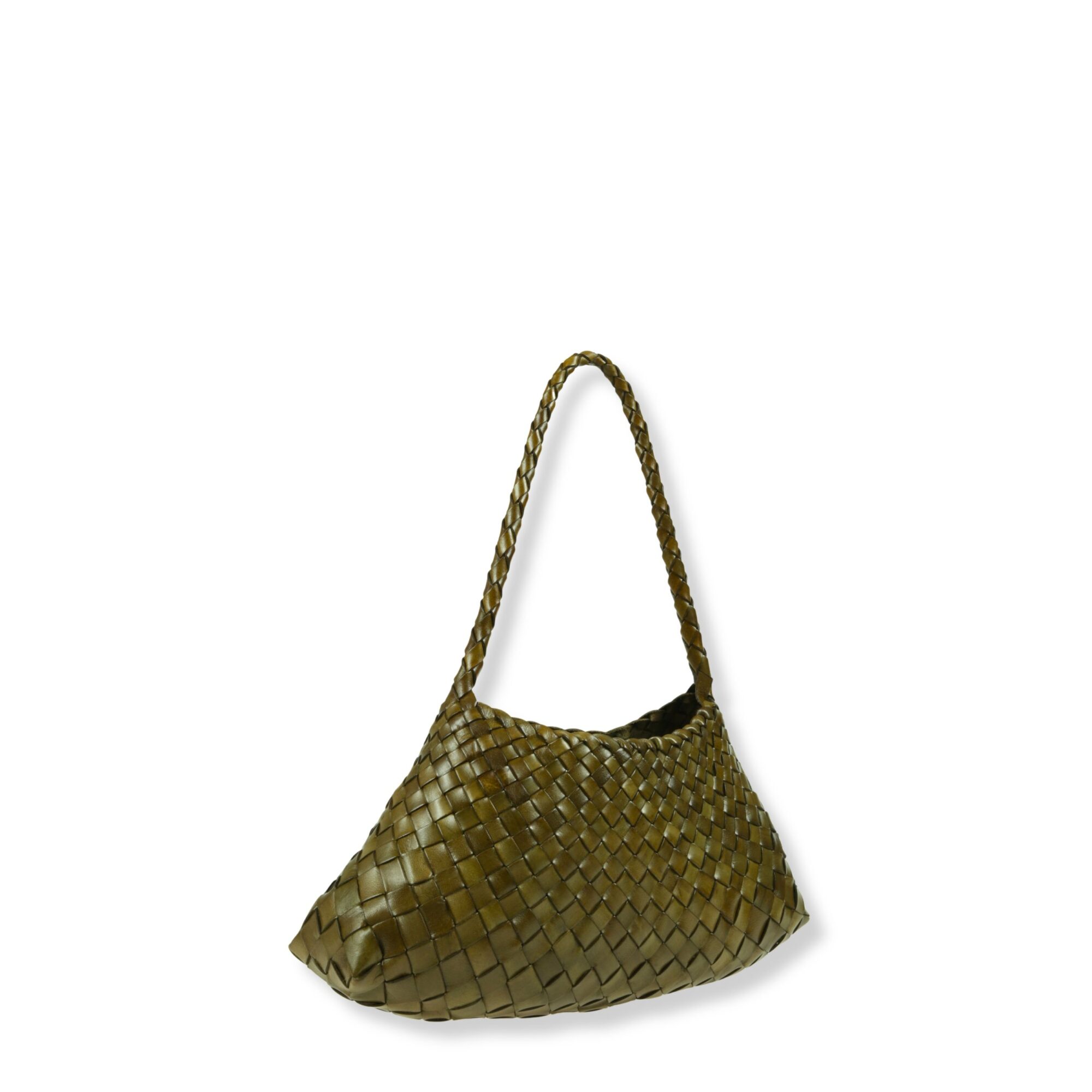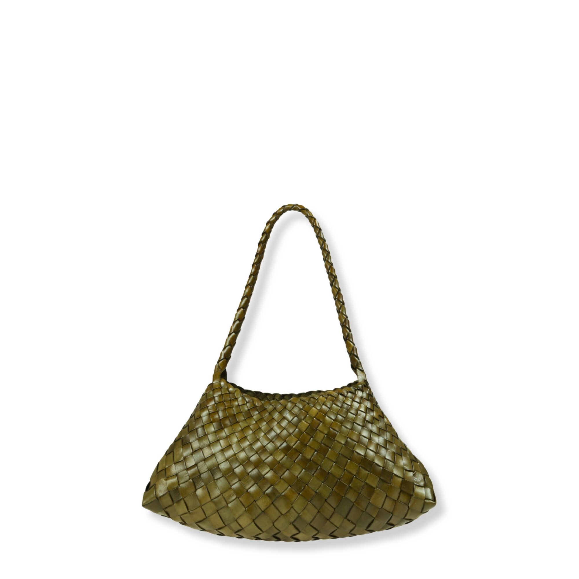 Rosanna Dragon Diffusion. Design con corpo in pelle intrecciata, open-top e singolo manico superiore.
