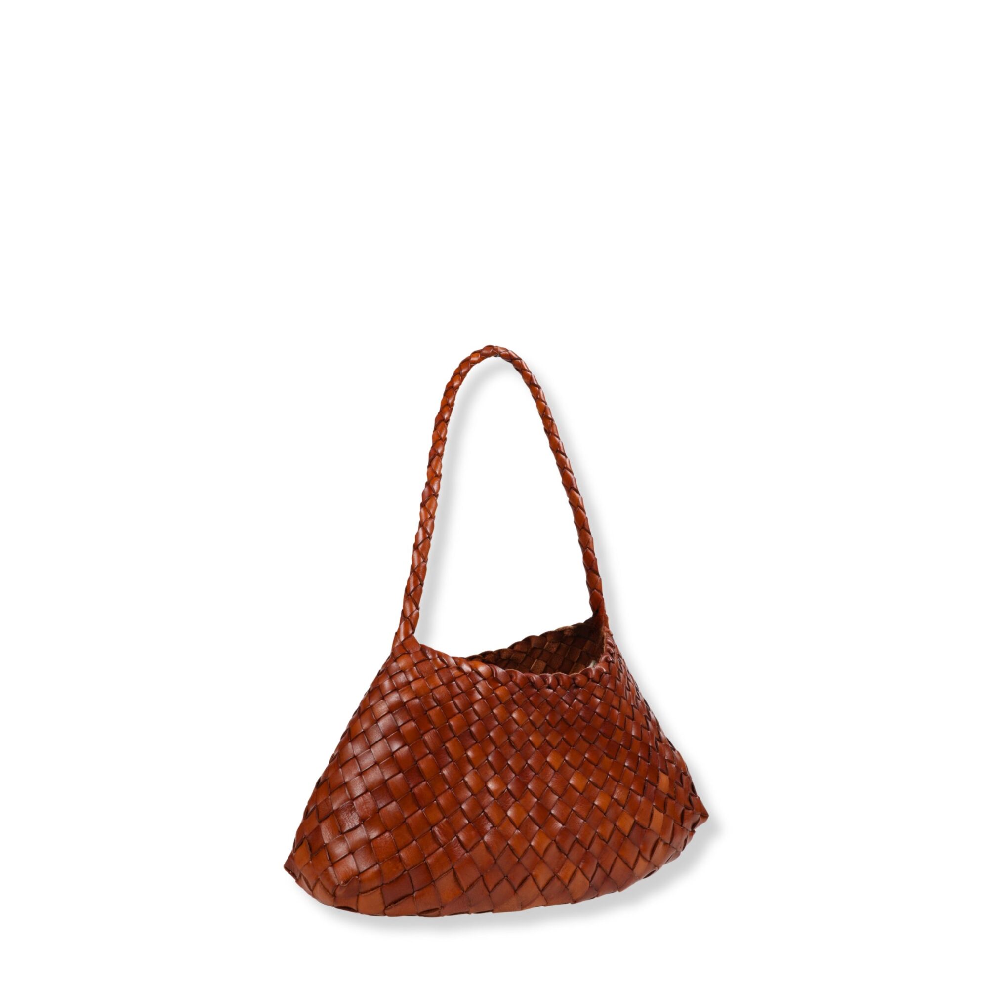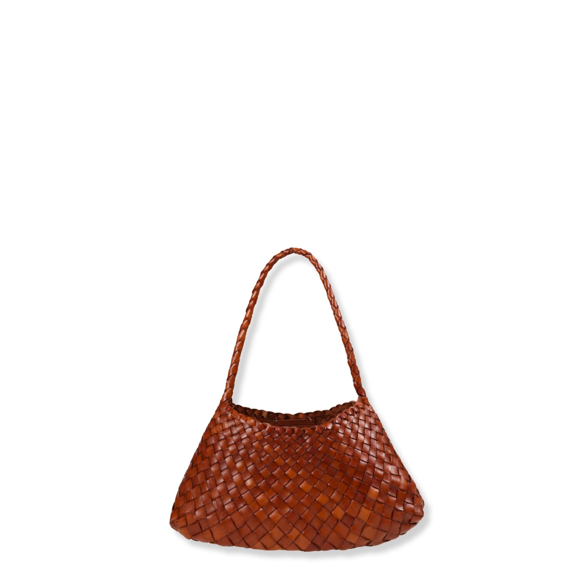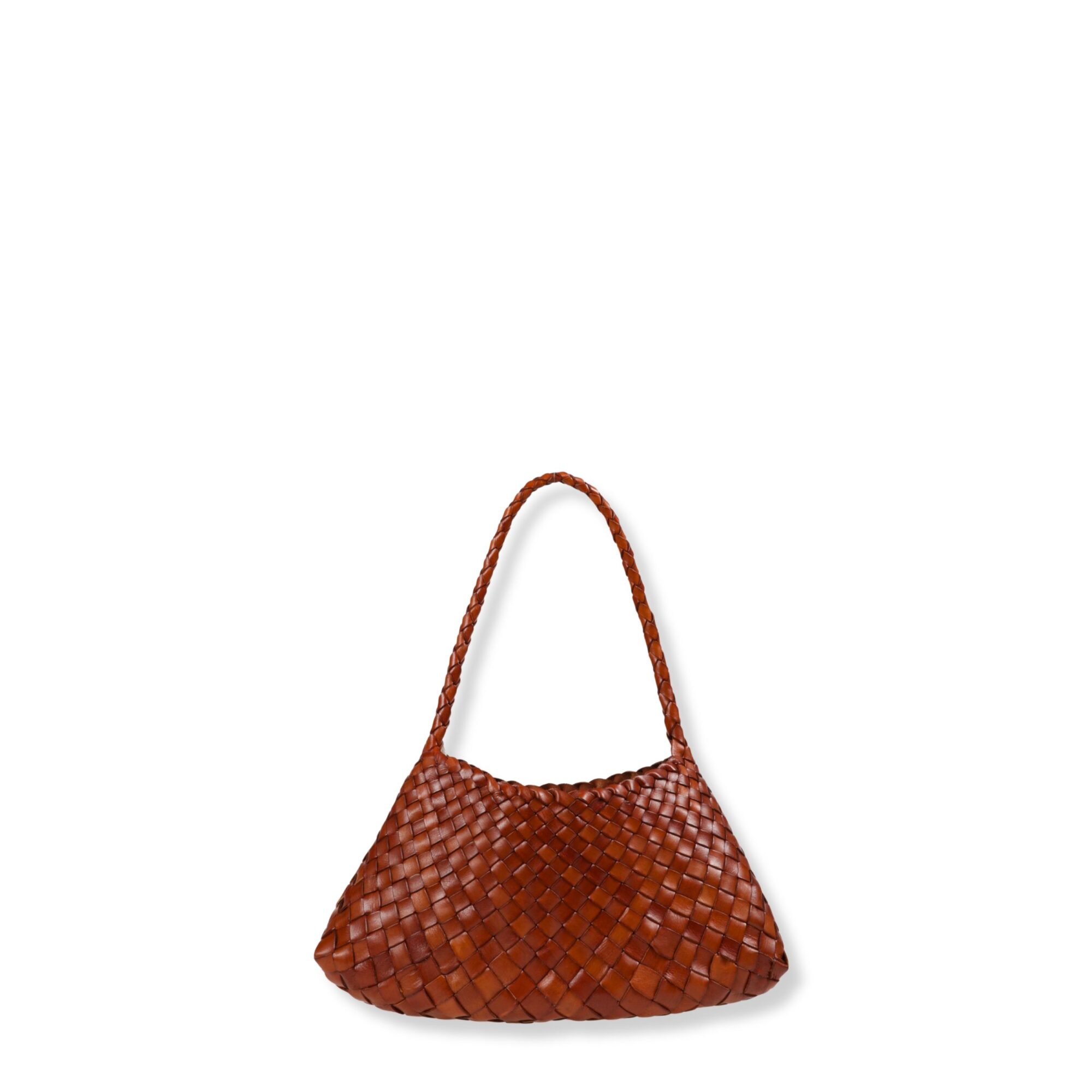 Rosanna Mini di Dragon Diffusion. Borsa a spalla con corpo a baguette. Design in pelle intrecciata a mano. Manici superiori in pelle intrecciata.