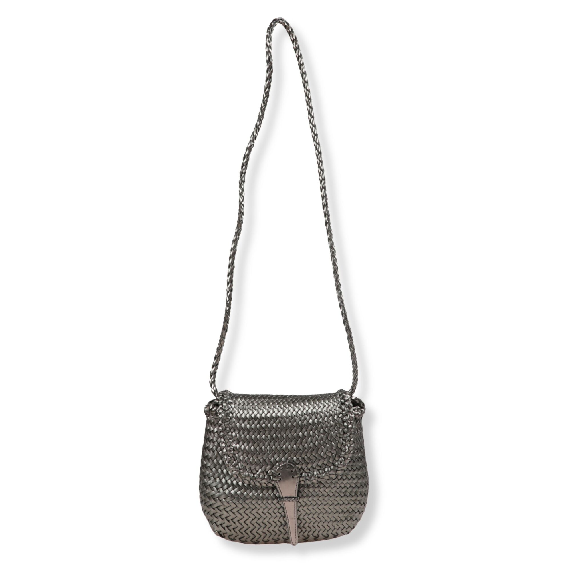 Mini City Bag Dragon Diffusion. Design in pelle intrecciata a mano e chiusura con patta frontale e linguetta passante. Tracolla sottile, anch’essa intrecciata.