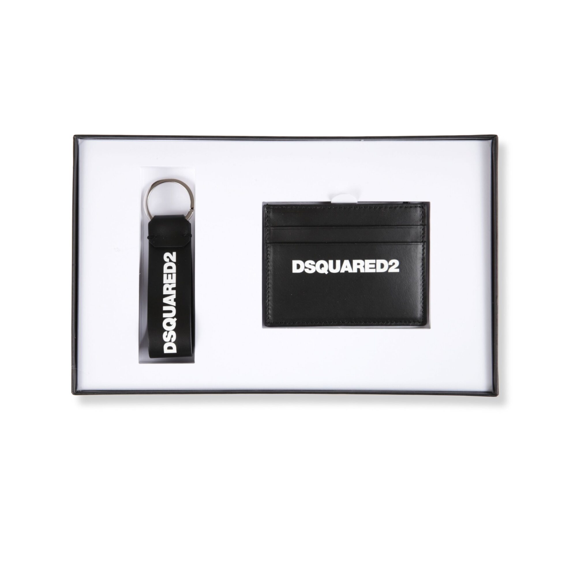 Card Holder Set Dsquared2. Portachiavi in pelle nera e portacarte con scomparti multipli, con logo del brand stampato sul fronte.