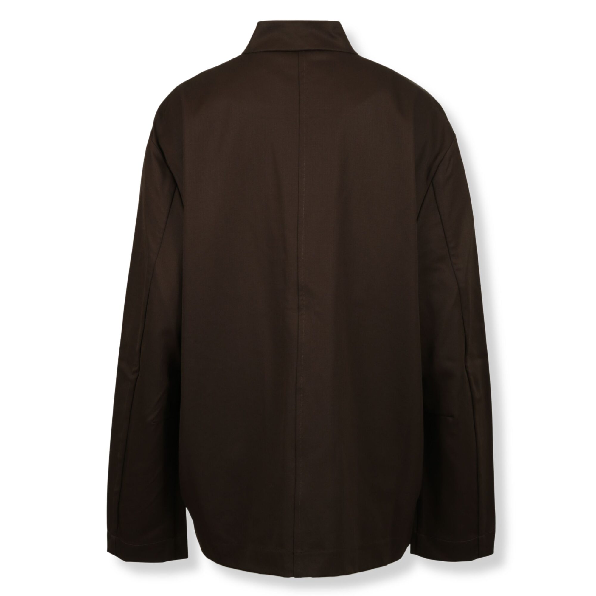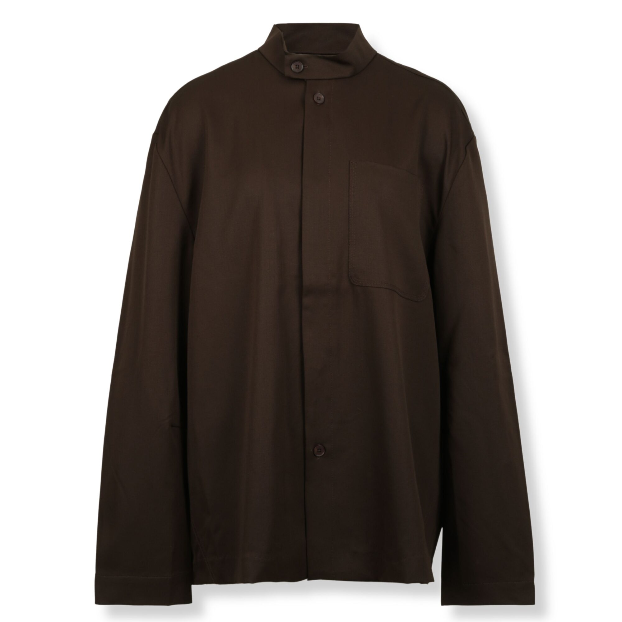 Rosa Shirt Entire Studios. Linea dritta, maniche lunghe ampie, collo alla coreana con bottone e chiusura frontale con due bottoni.