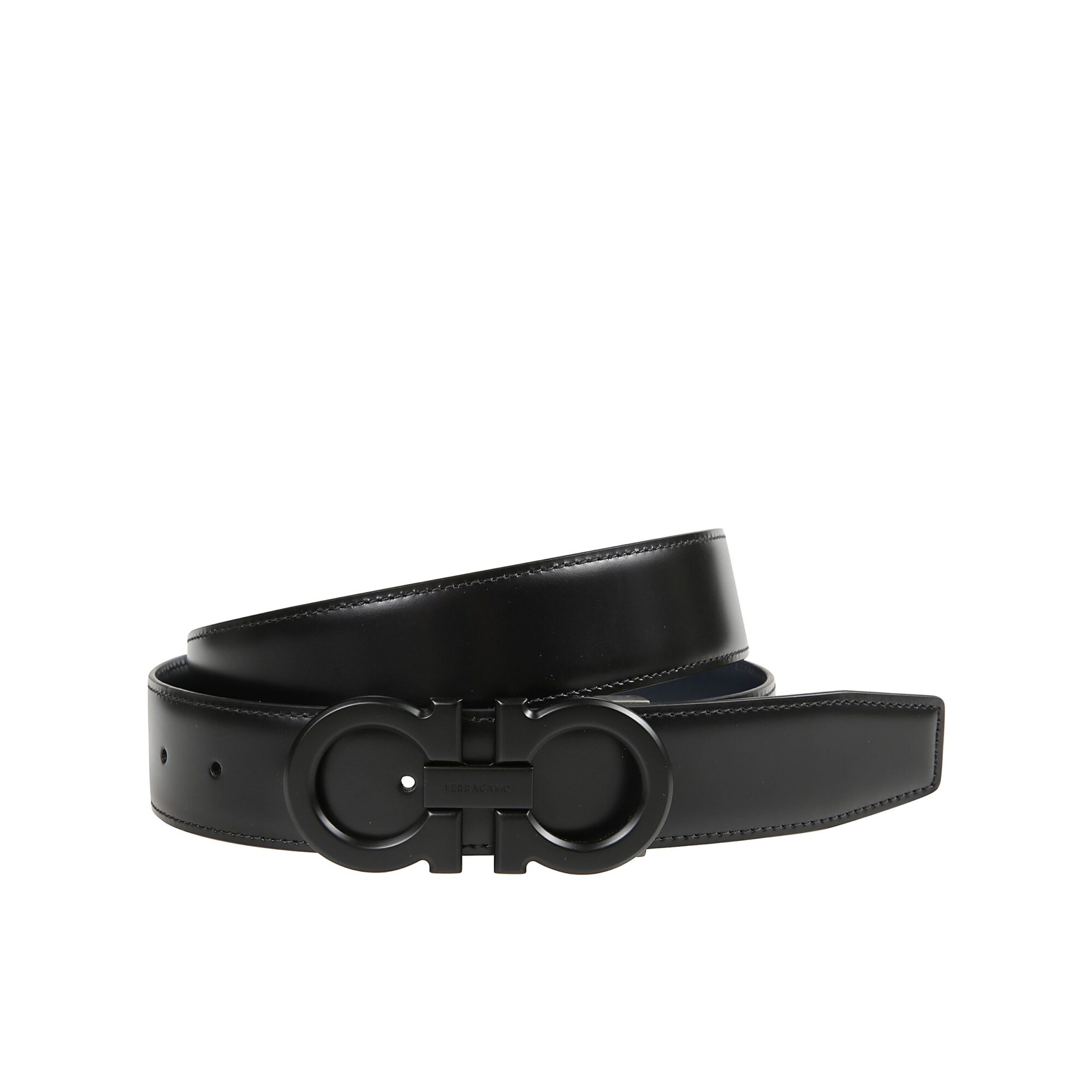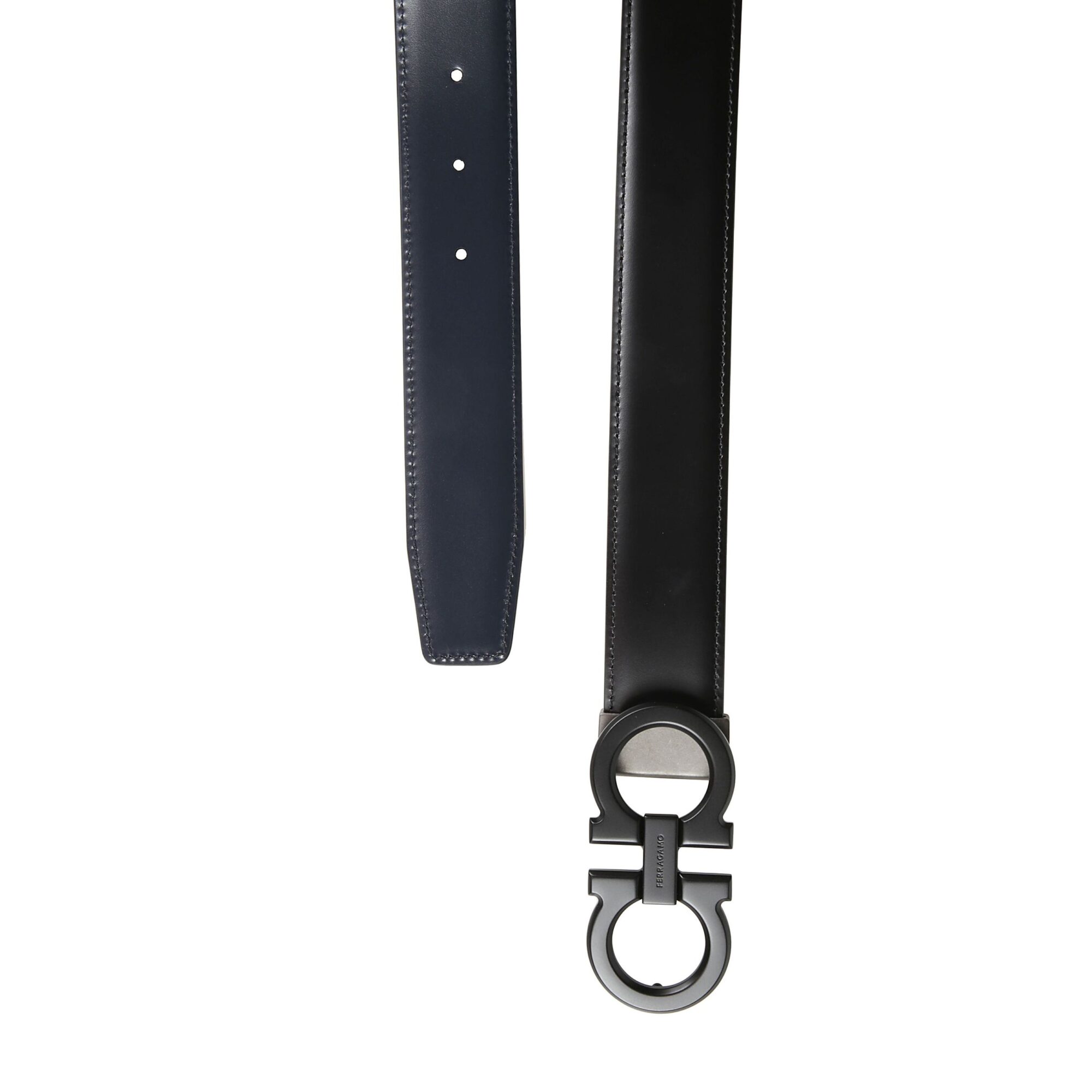 Cintura Gancini reversibile Ferragamo. Design bicolore, con fibbia a doppio logo Gancini con finitura metallizzata effetto opaco.