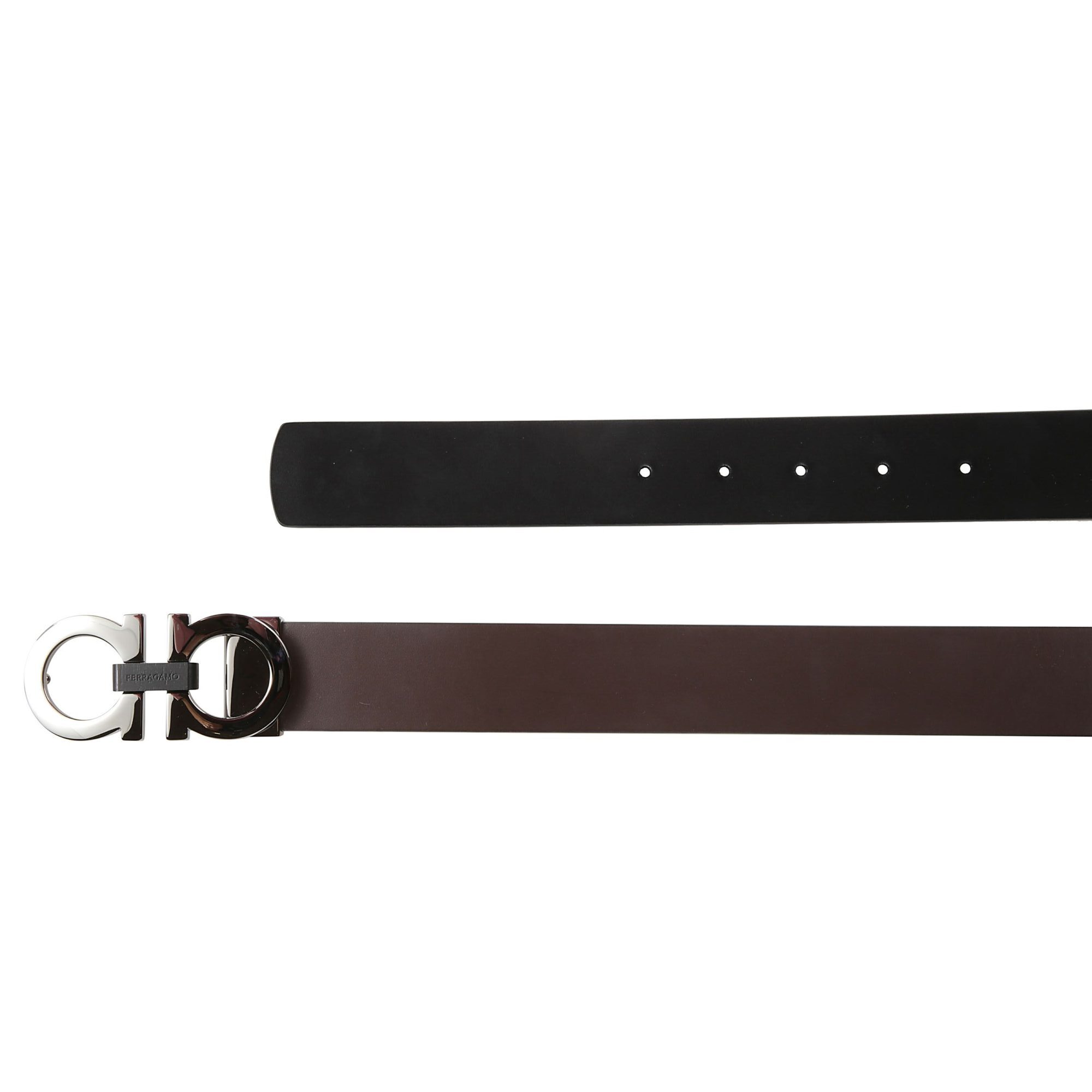 Cintura Gancini reversibile Ferragamo. Design bicolore, con fibbia a doppio logo Gancini con finitura metallizzata.