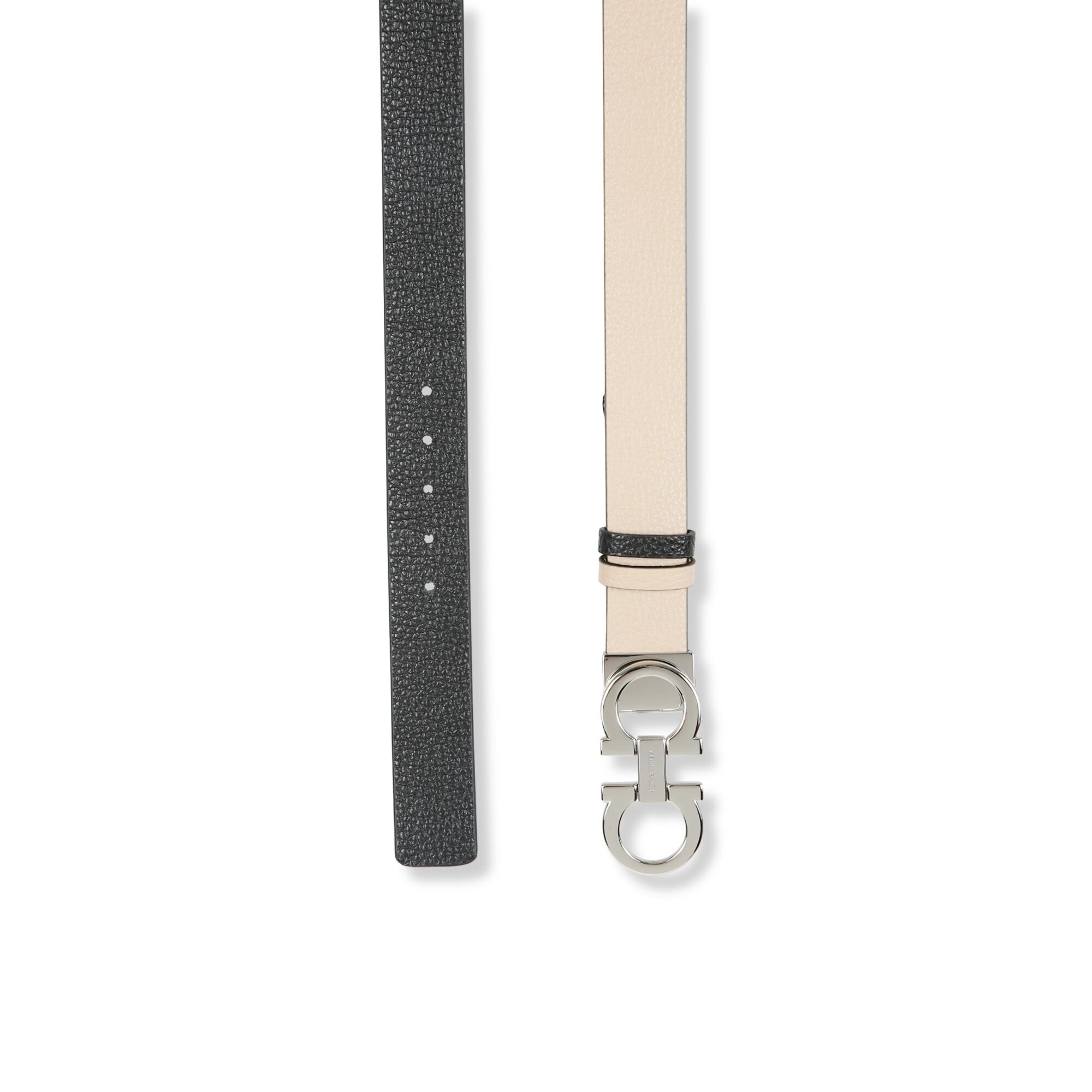 Cintura reversibile Gancini Ferragamo. Design in pelle bicolore, regolabile, fibbia con iconico logo del brand.