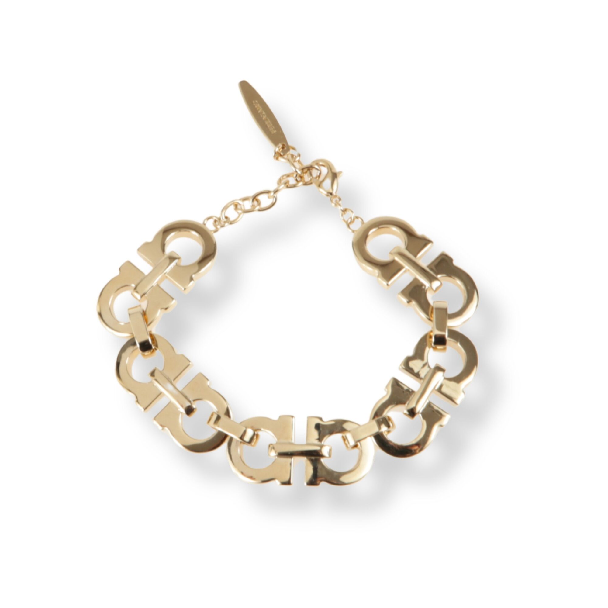 Braccialetto Gancini Ferragamo. Composto da una catena di iconici Gancini dorati, chiusura con catenina sottile dorata.