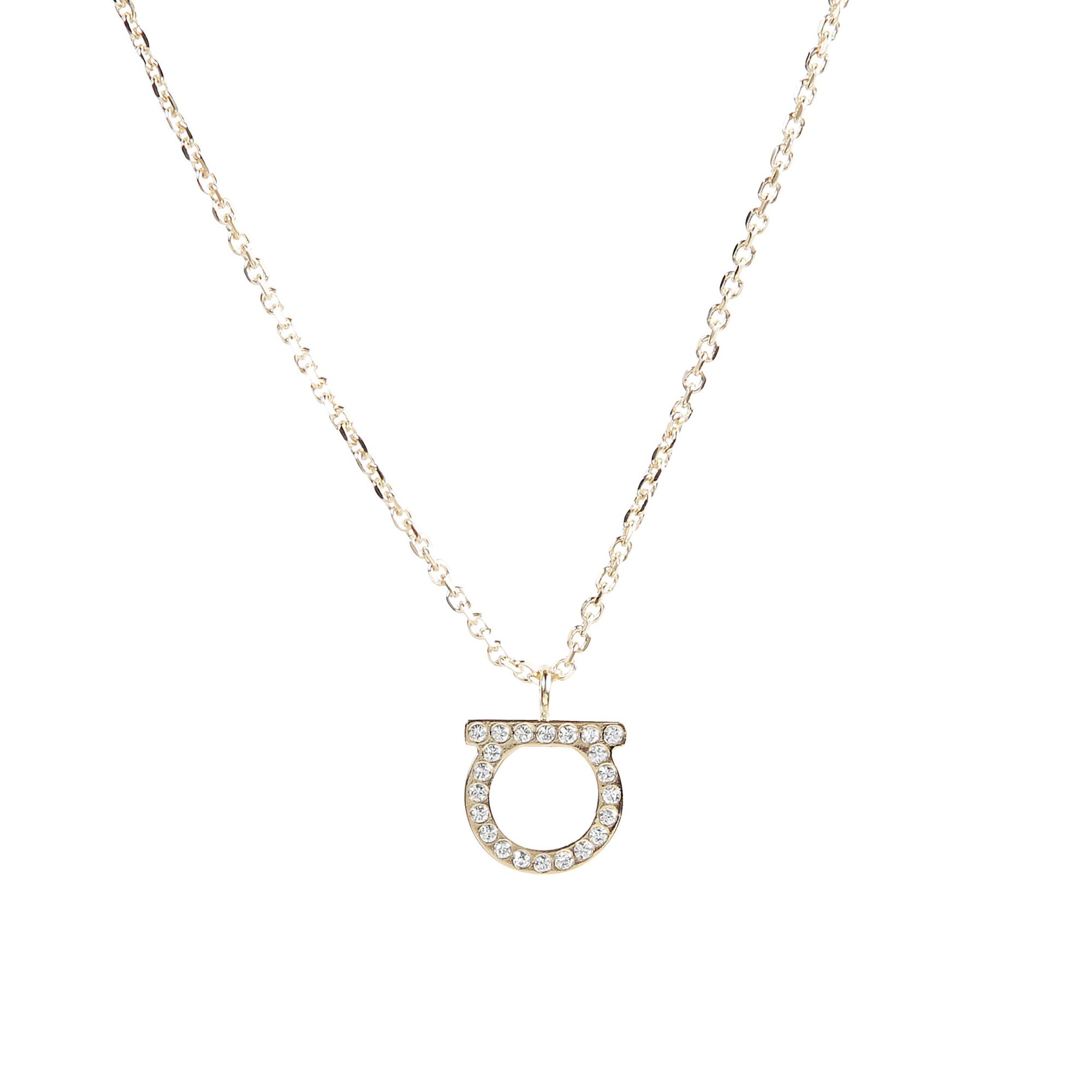 Gancini Crystals Necklace. Collana in ottone con finitura dorata, con iconico logo del brand pendente impreziosito da mini cristalli.