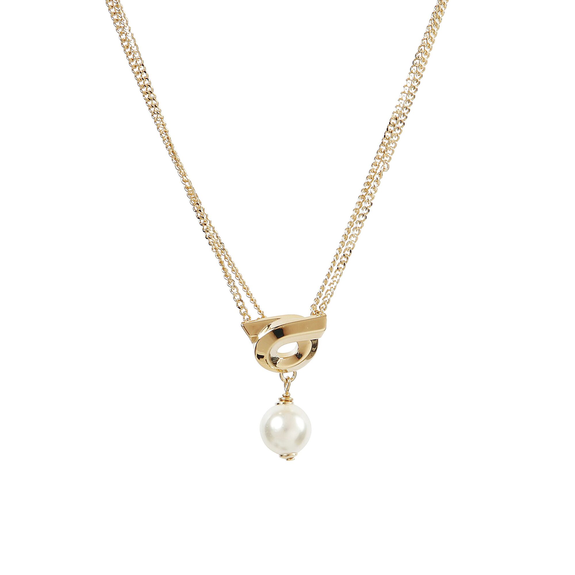 Gancini Necklace with Pearl. Design doppio filo in catenina sottile, con pendente logo Gancini del brand e perla.