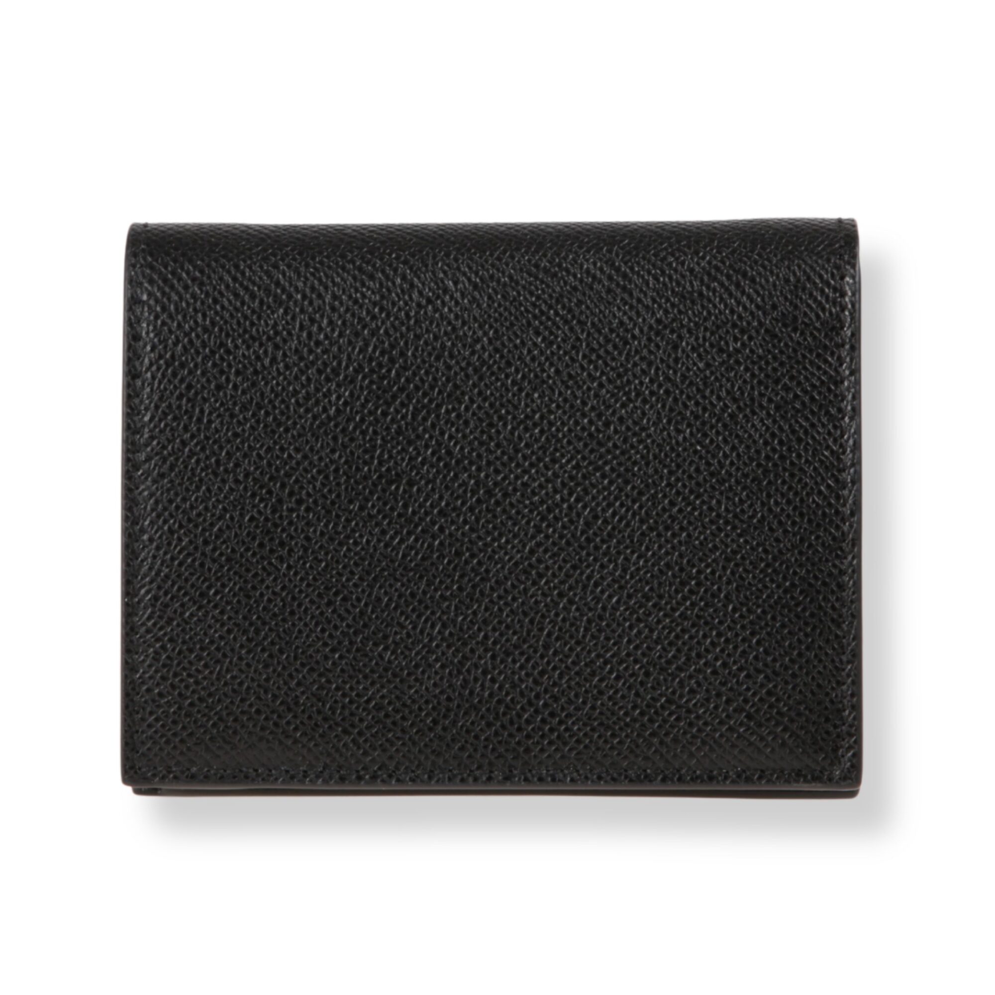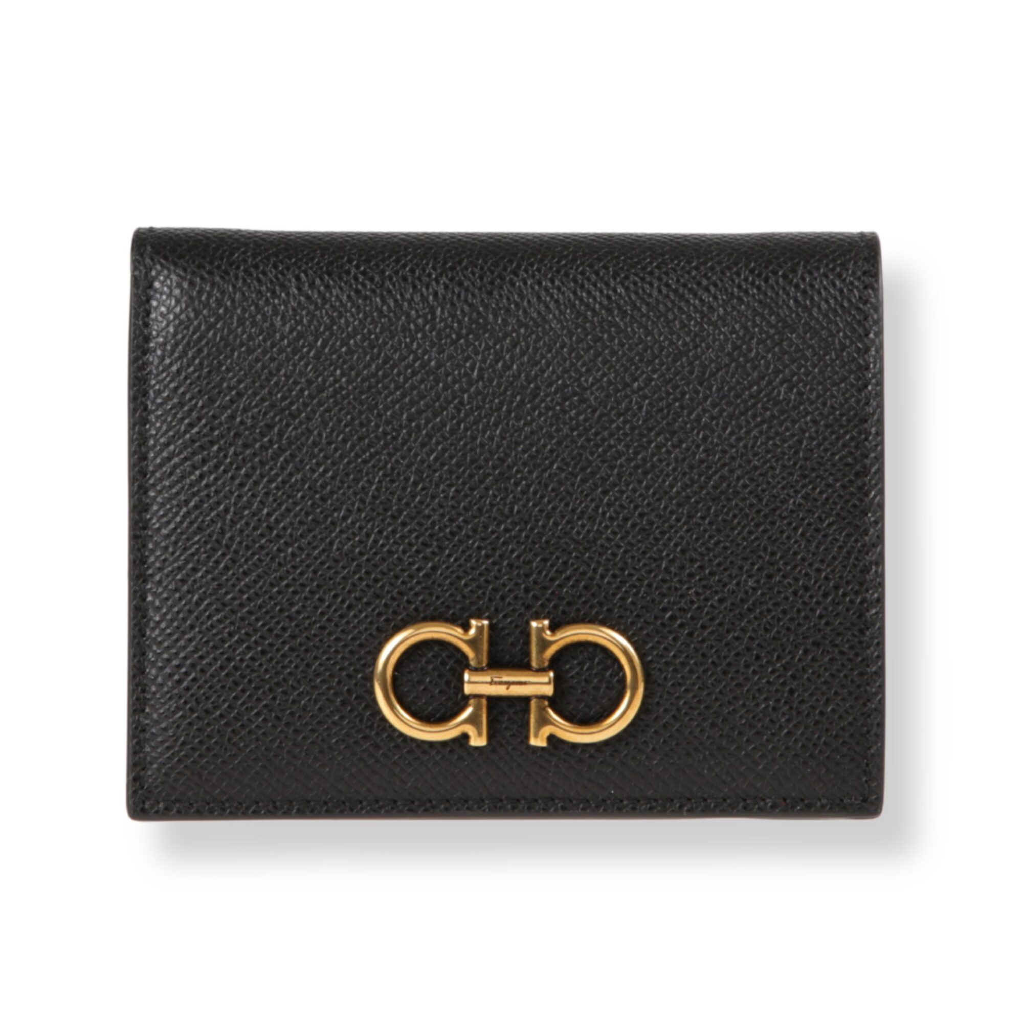 Portafoglio Gancini Ferragamo. Bi-fold, in pelle con finitura effetto granulato, con chiusura a bottone a pressione. Iconica fibbia Gancini in metallo dorato sul davanti.