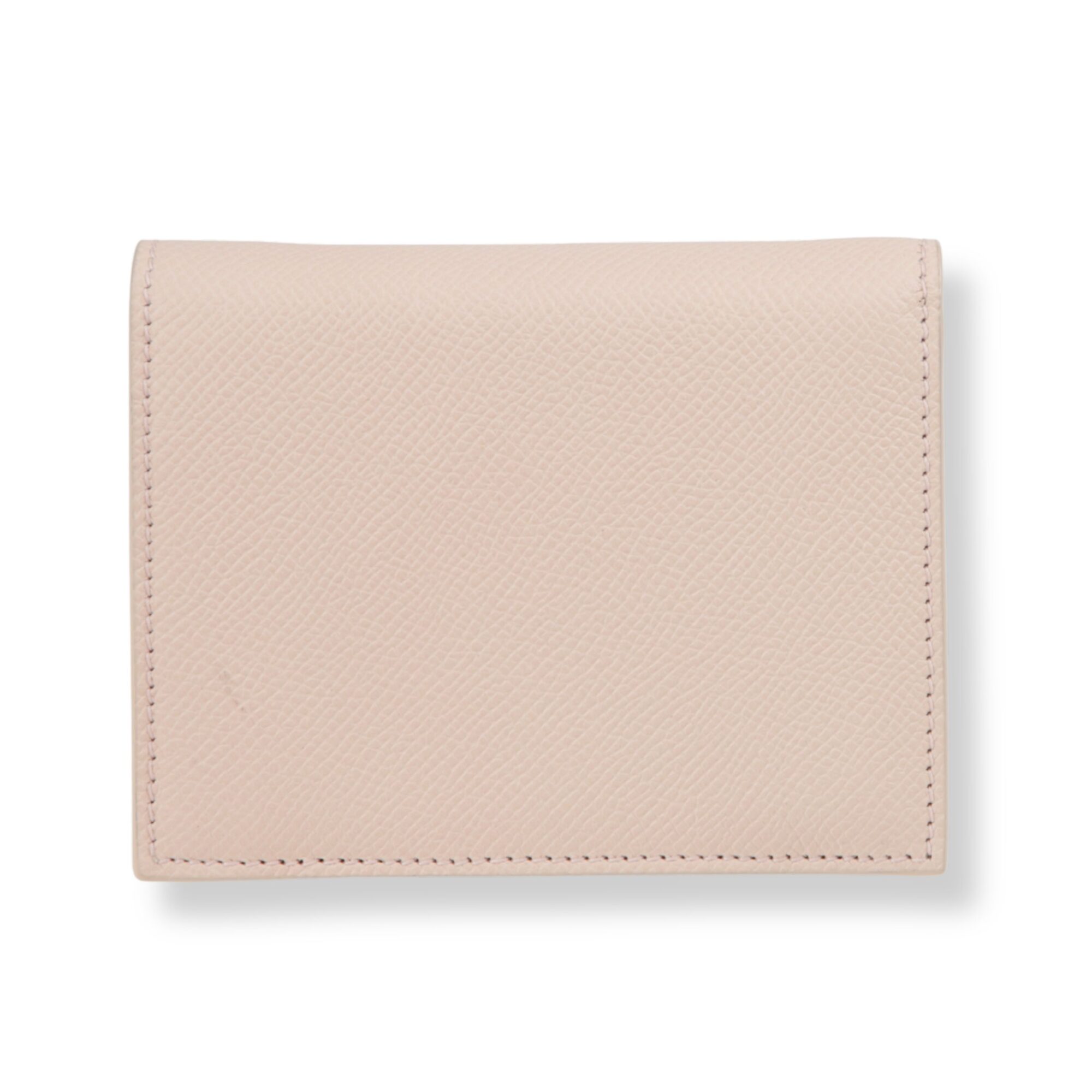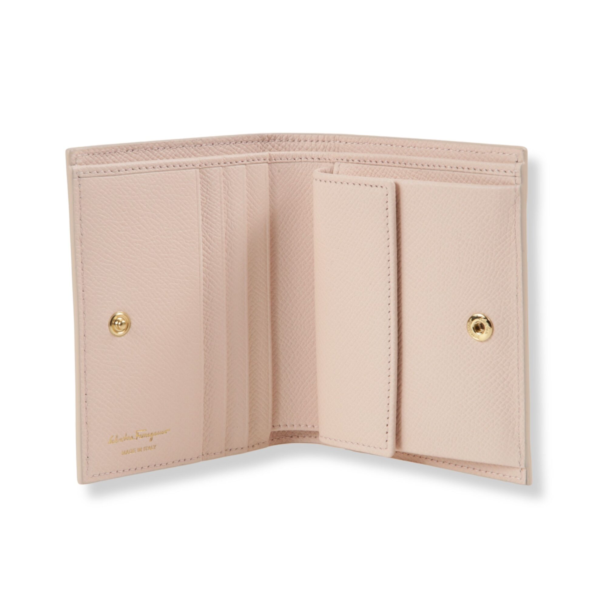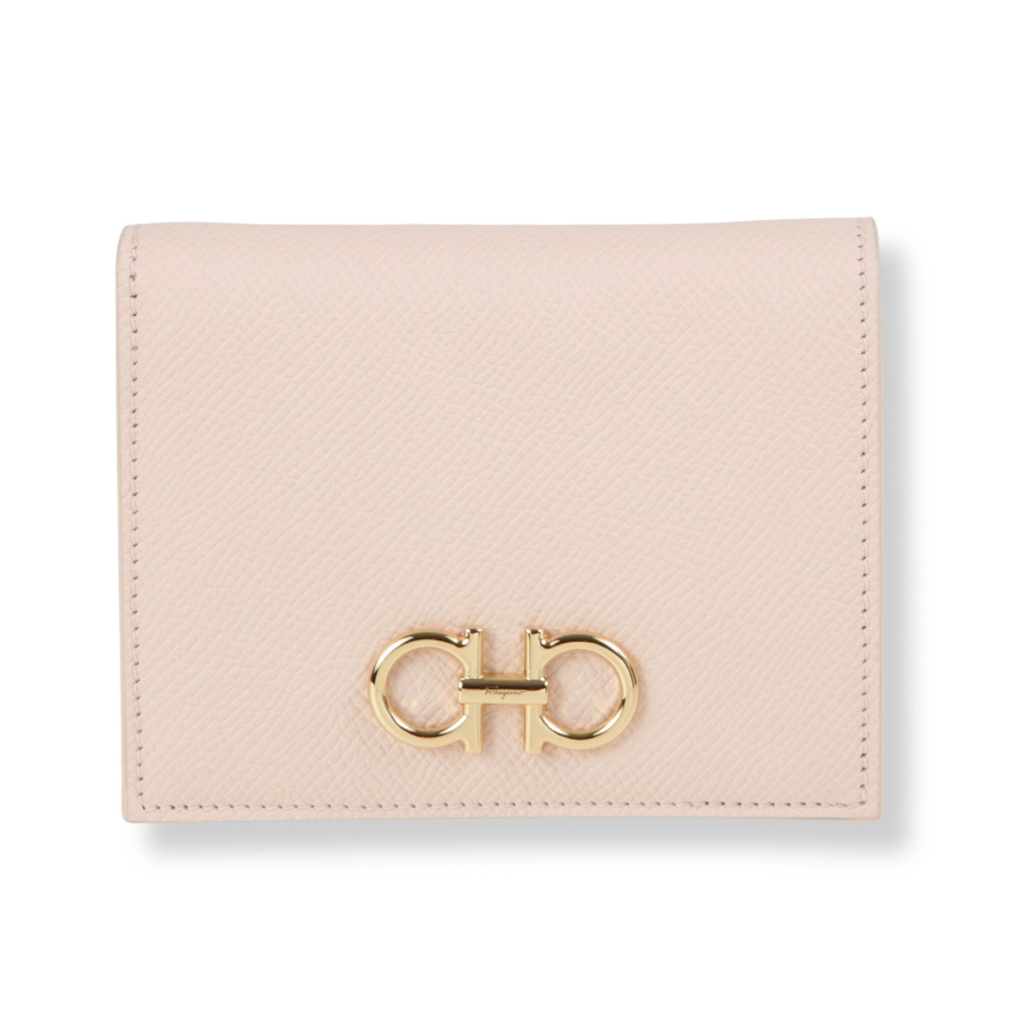 Portafoglio Gancini Ferragamo. Bi-fold, in pelle con finitura effetto granulato, con chiusura a bottone a pressione. Iconica fibbia Gancini in metallo dorato sul davanti.