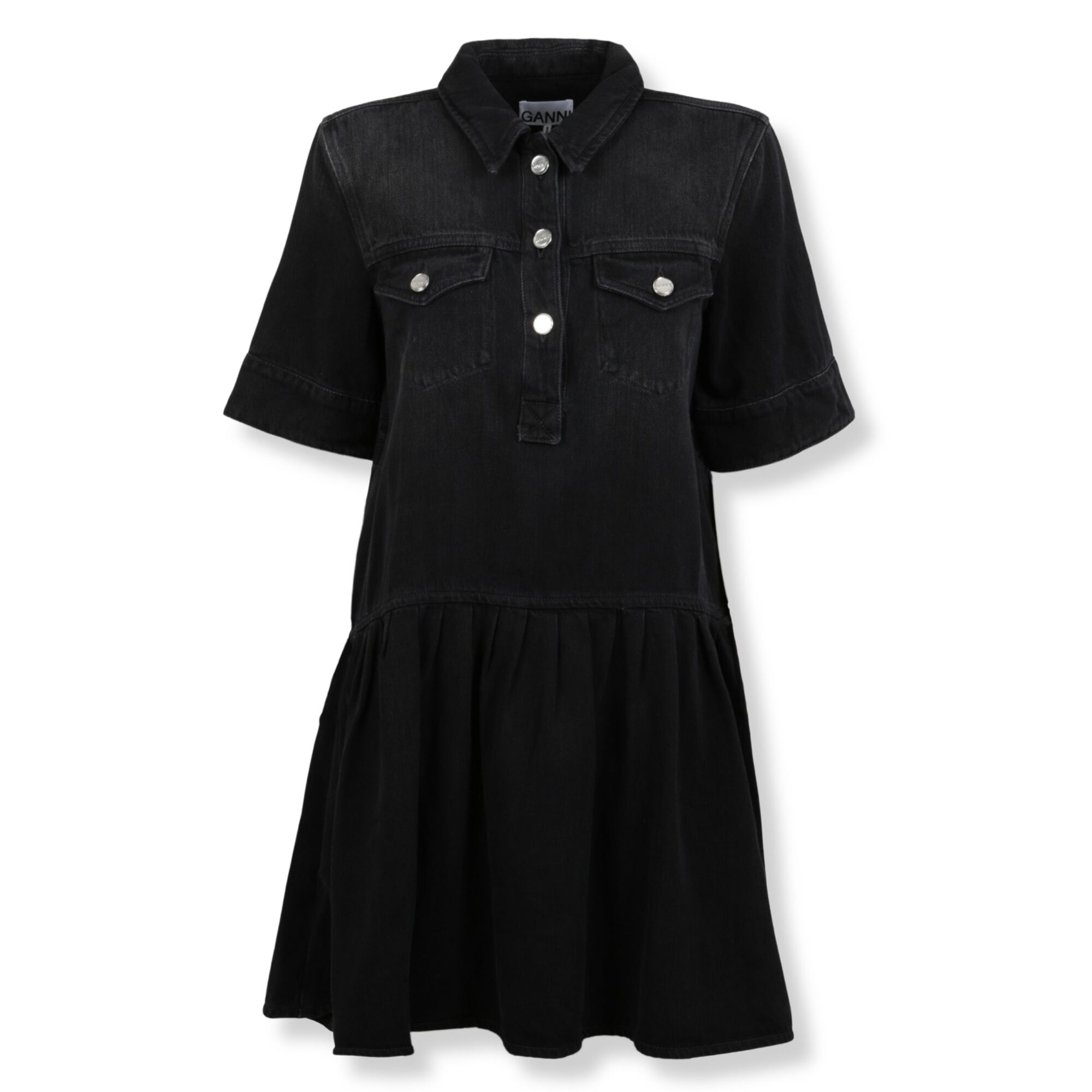 Soft Rigid Denim Mini Dress Ganni. Design in denim con finitura lavata nera. Maniche corte, colletto classico e chiusura con bottoni, con due tasche sul petto con patta. Gonna mini a pieghe.