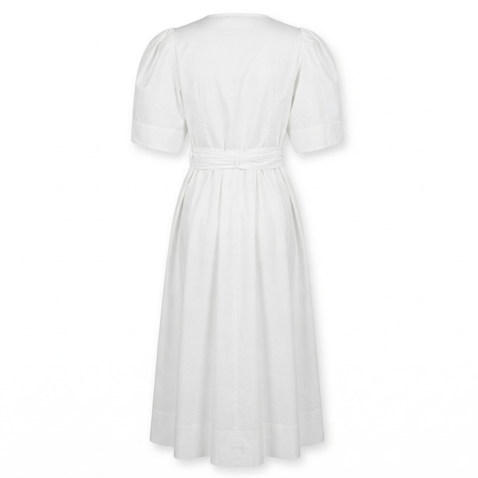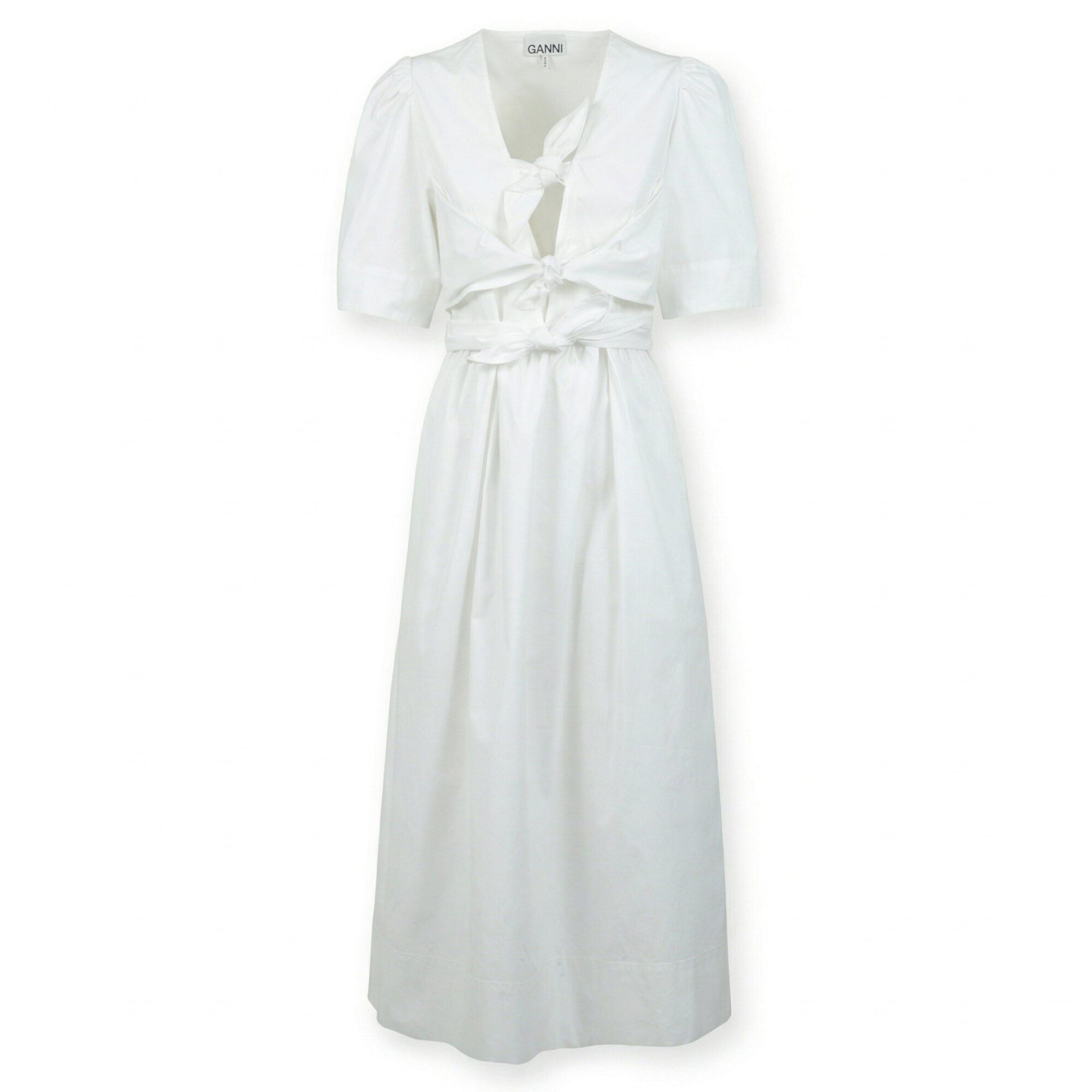 Abito Chemisier Ganni. Scollo a V con tre fiocchi sul davanti, maniche a sbuffo, gonna svasata.