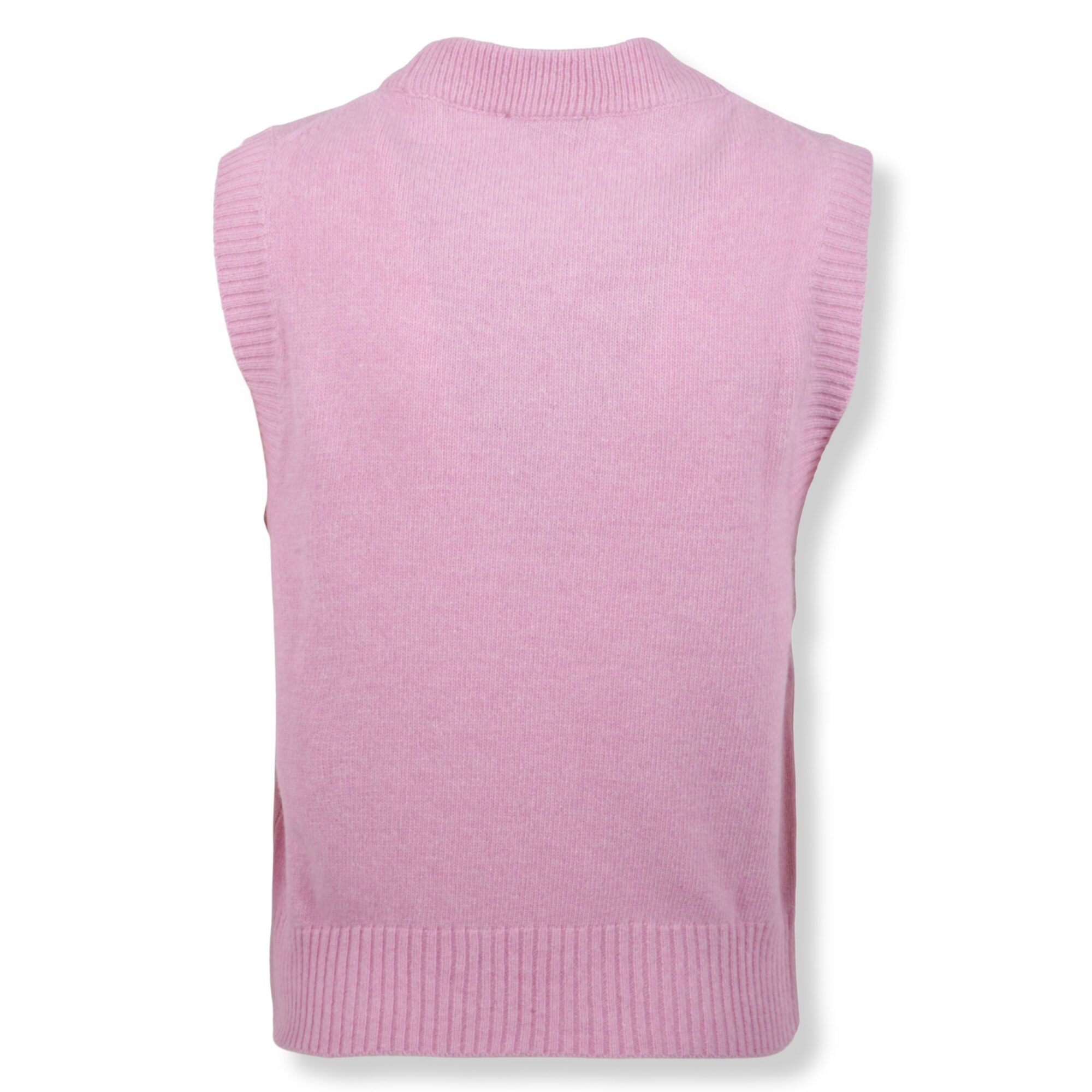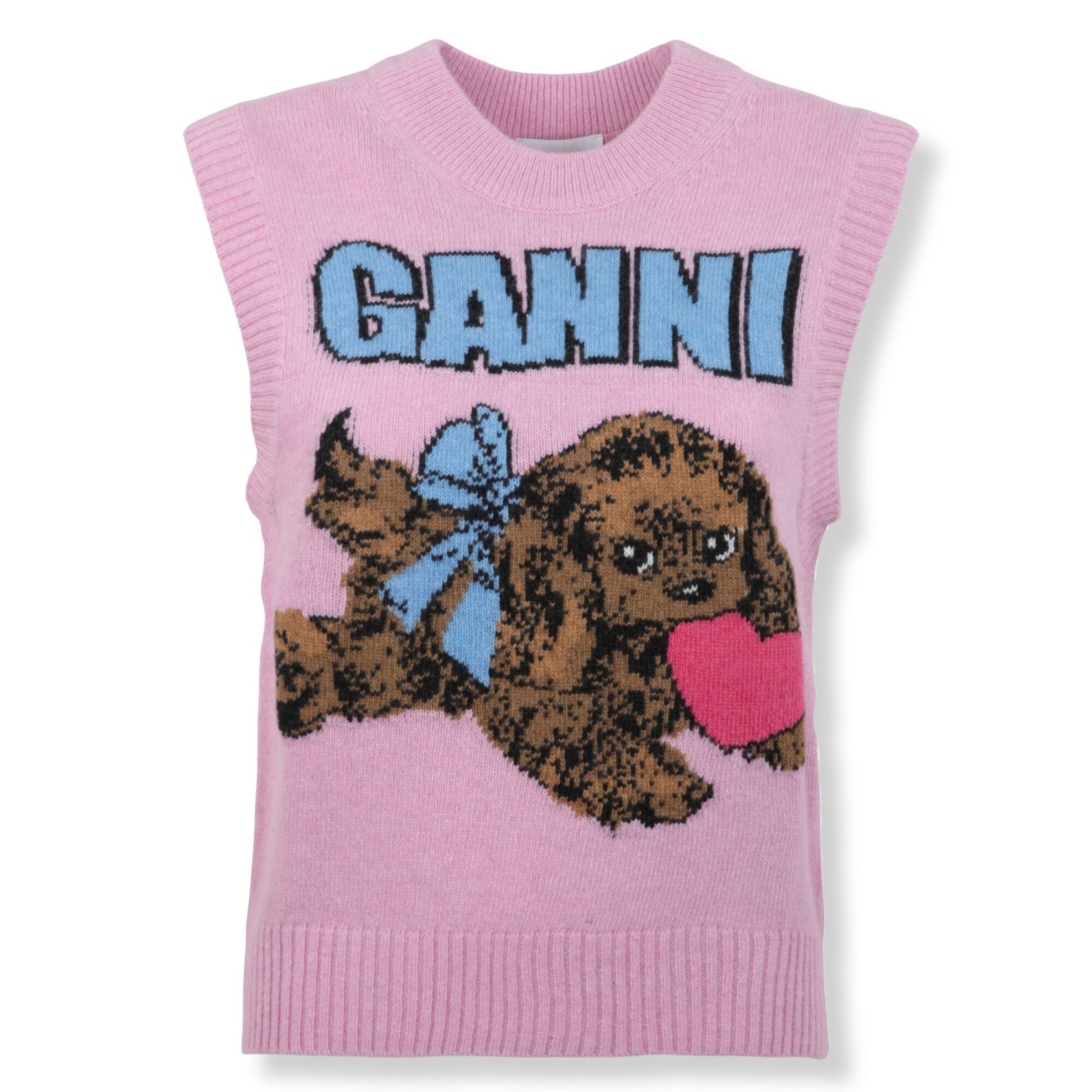 Gilet Ganni. Smanicato, girocollo e orli a costine, stampa e logo del brand sul davanti.