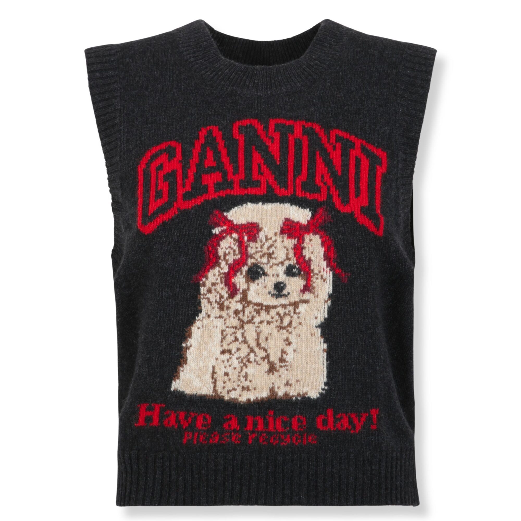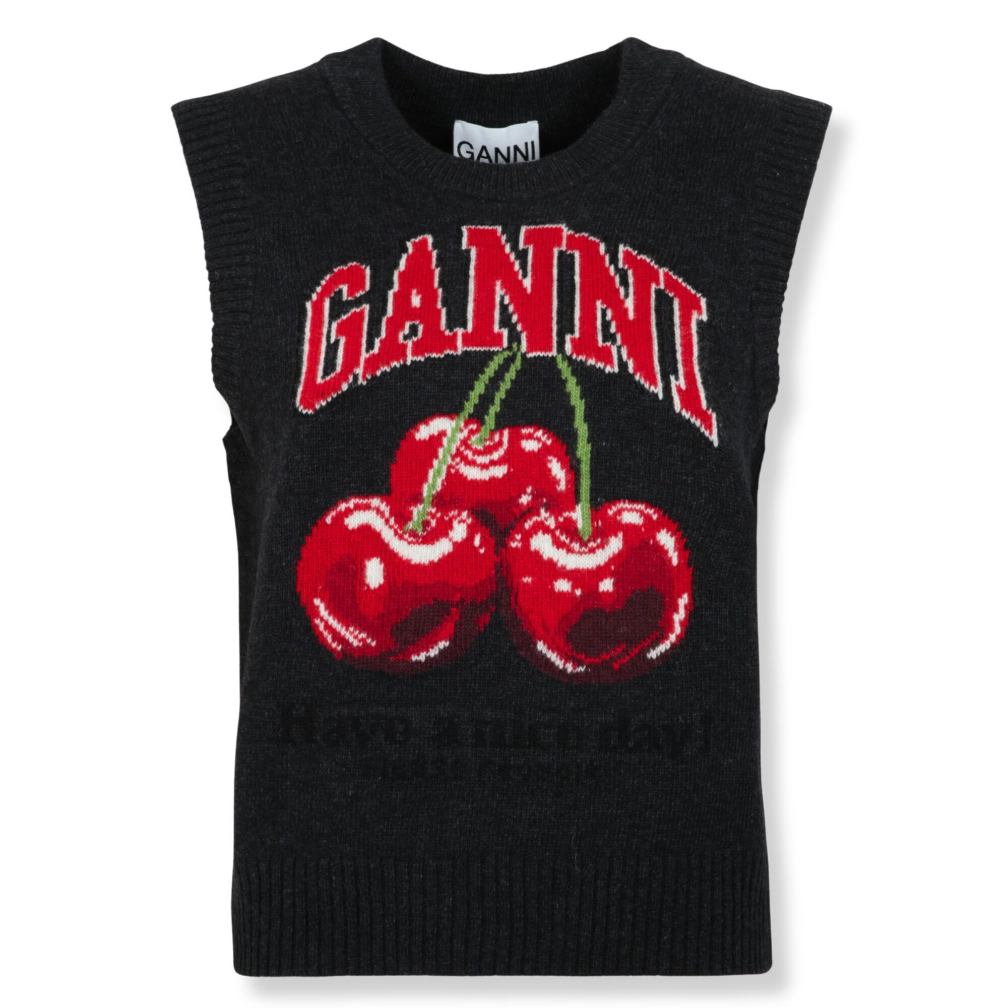 Graphic Wool Vest Ganni. Scollo rotondo, bordi a costine e stampa grafica con logo del brand sul davanti.