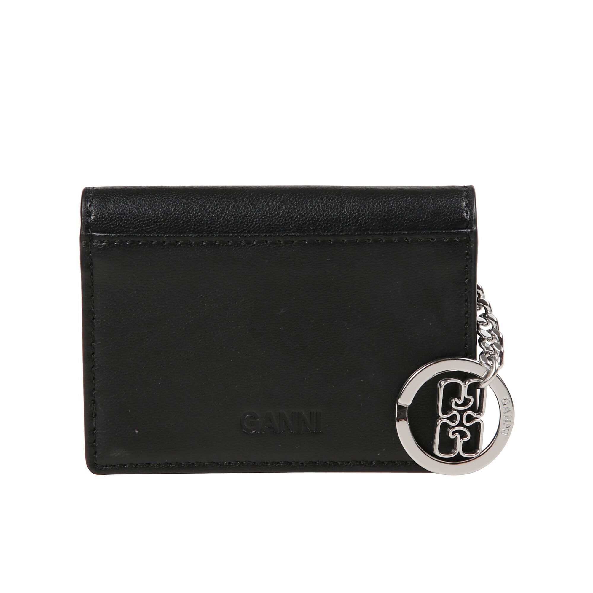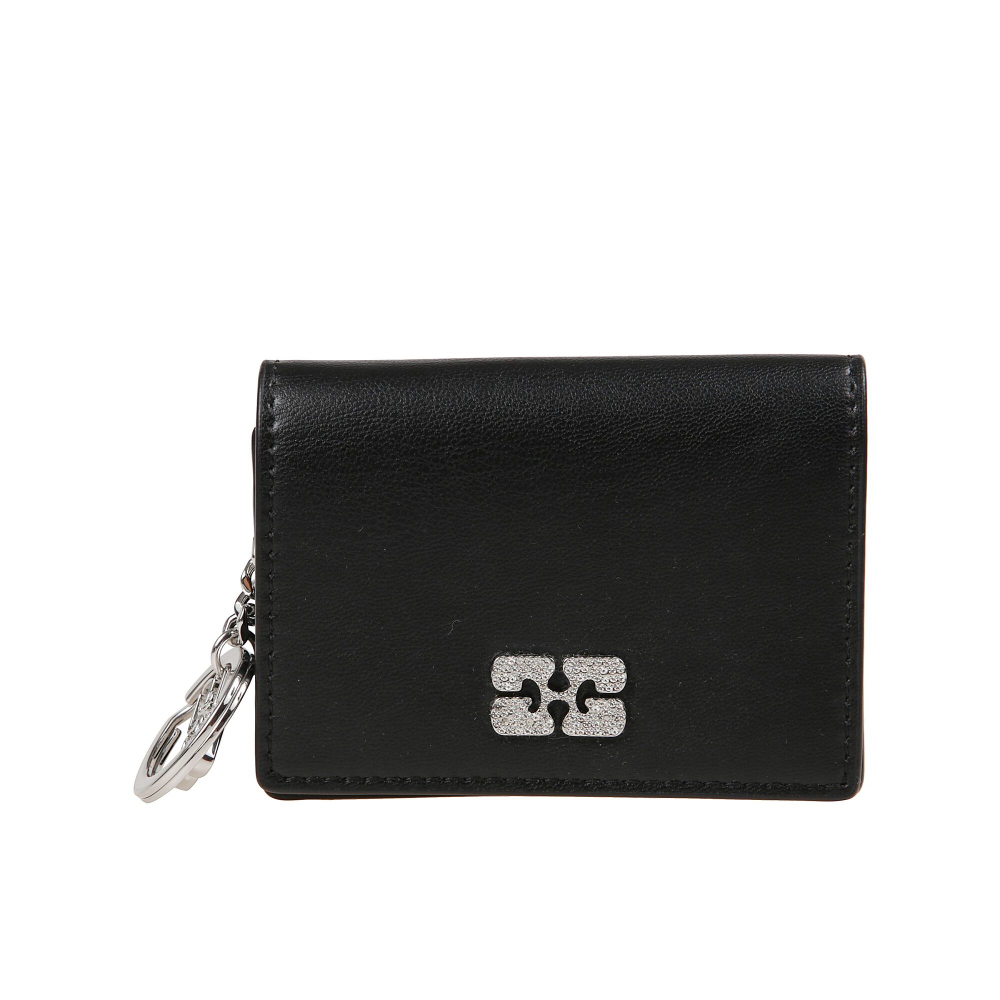 Portacarte Ganni in pelle. Chiusura a patta integrale frontale e logo del brand decorato con strass argentati. Include portachiavi metallico con logo del brand.