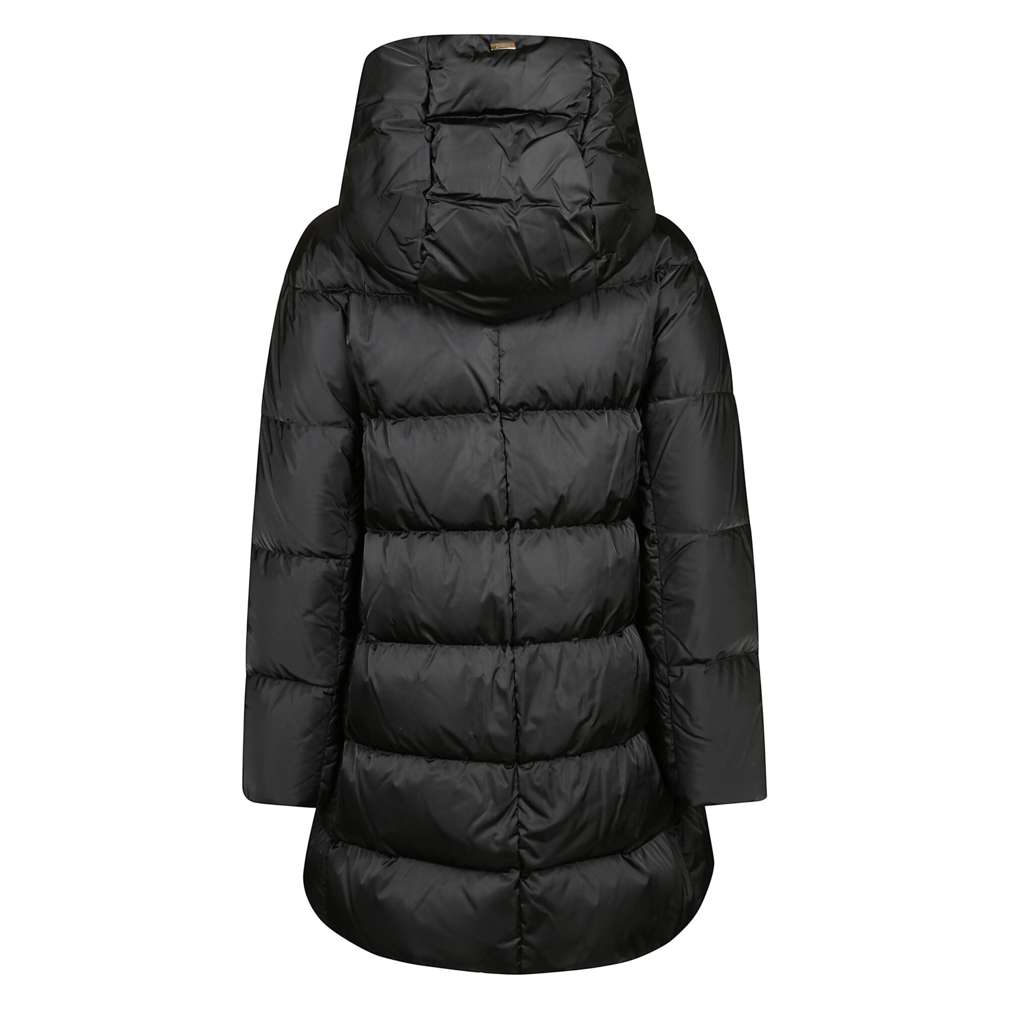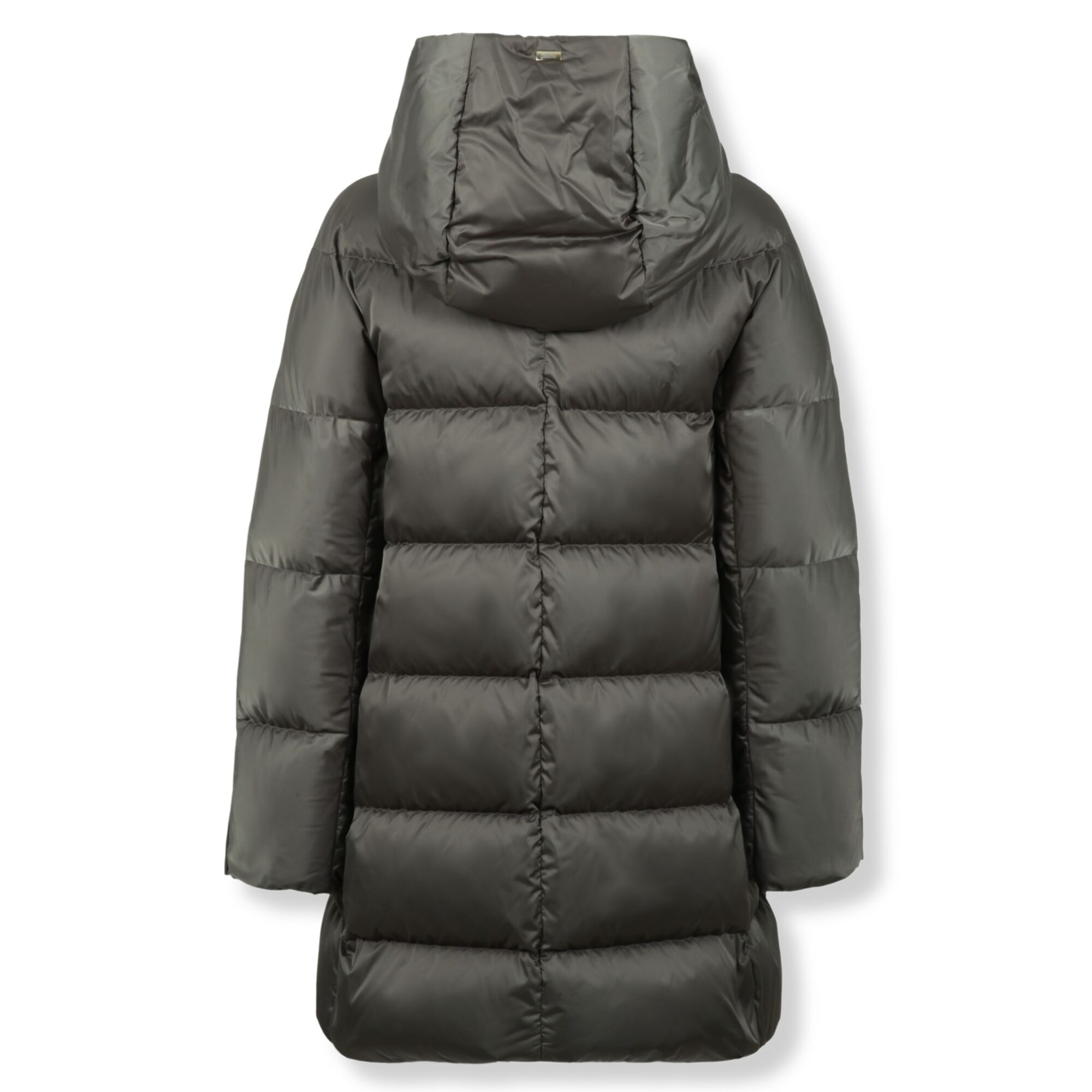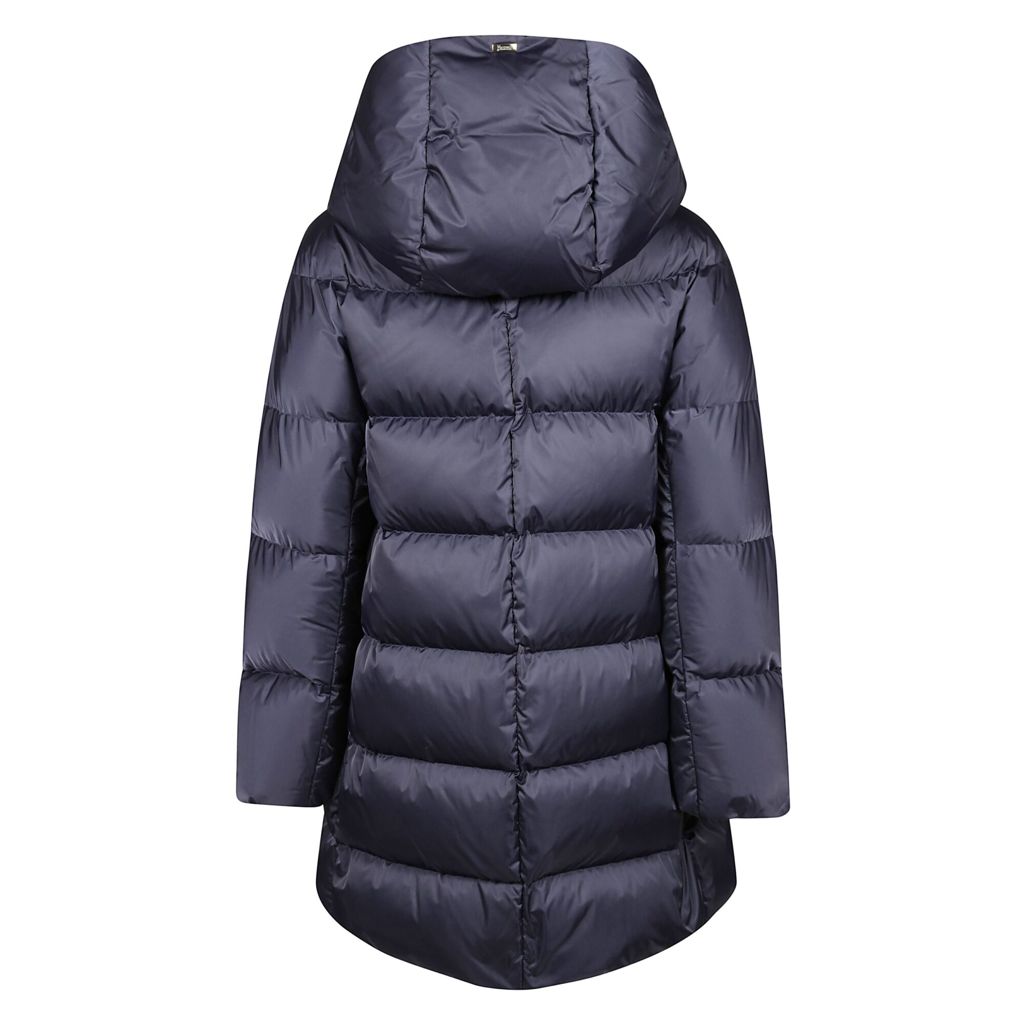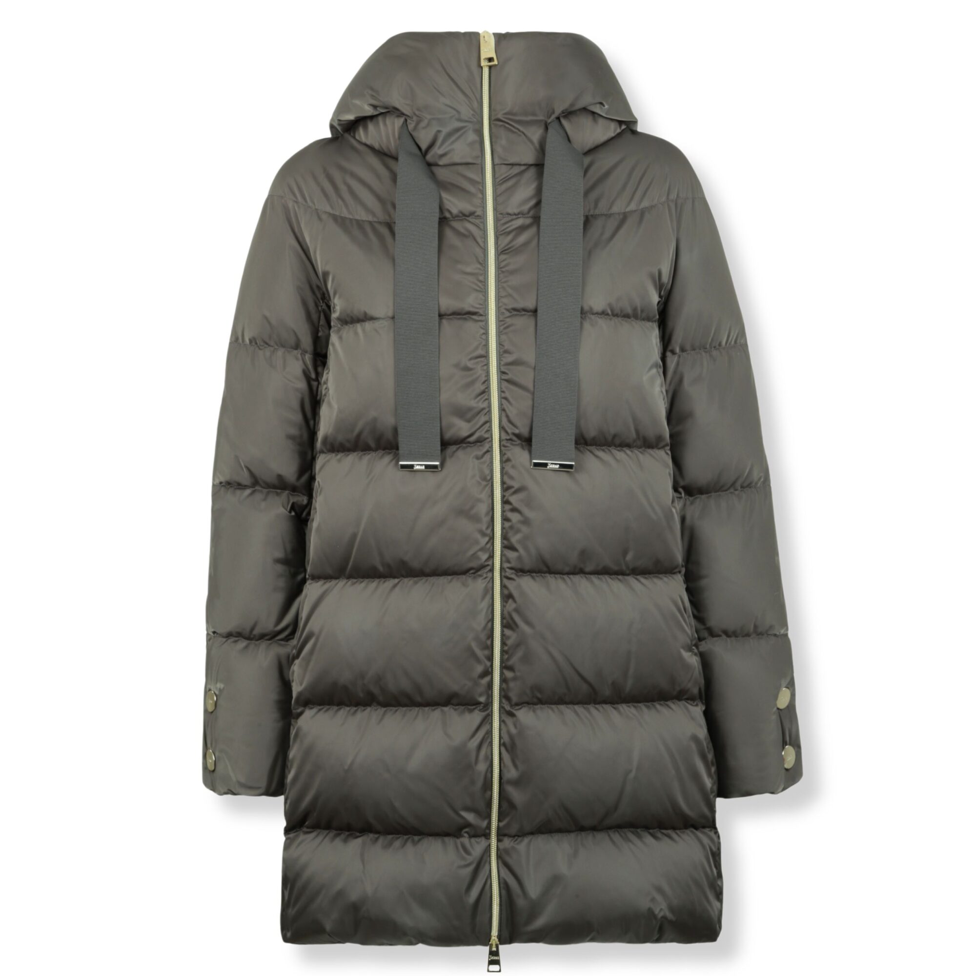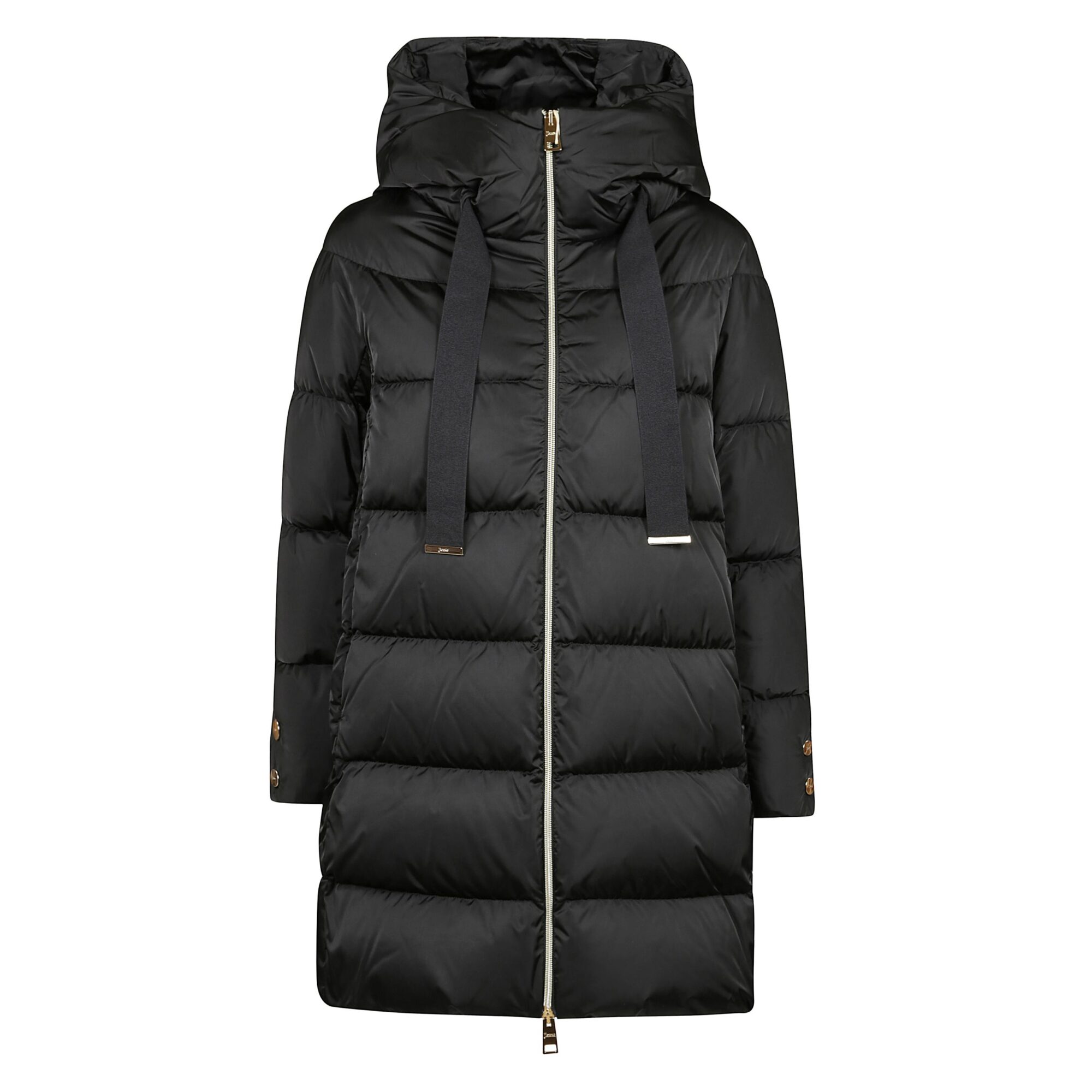 Piumino in Raso con Cappuccio Herno. Larghi lacci decorativi al cappuccio e chiusura zip doppio cursore. Tasche laterali e bottoni sui polsi.