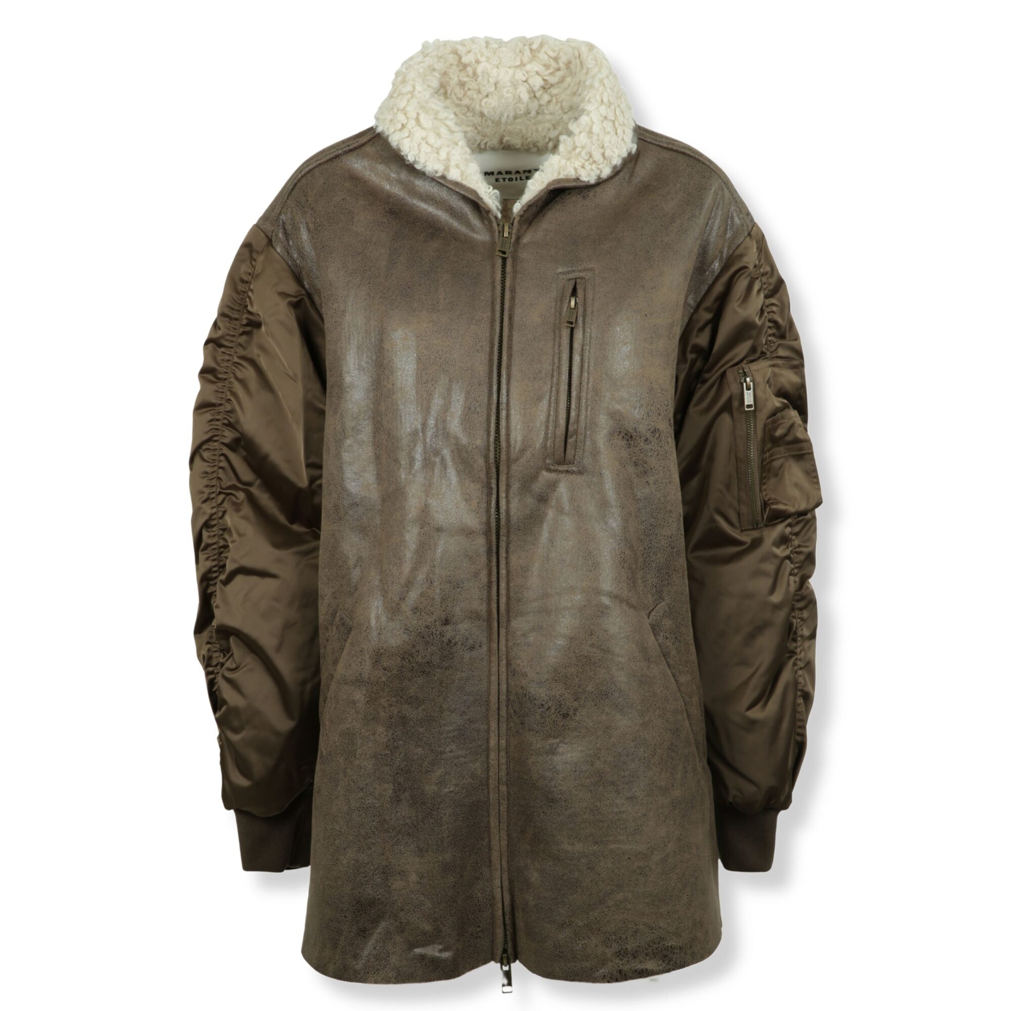 Cappotto Evina Isabel Marant. In ecopelle effetto vintage con maniche in nylon satinato, taglio dritto. Collo con inserti effetto montone, una tasca con zip verticale sul petto e due tasche a filetto oblique sul davanti.