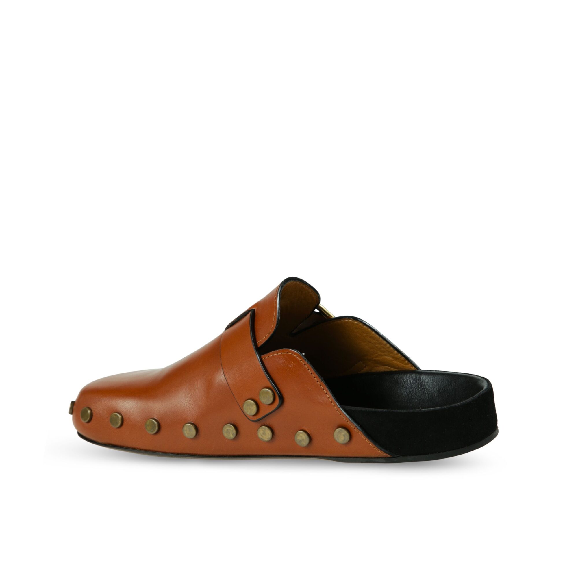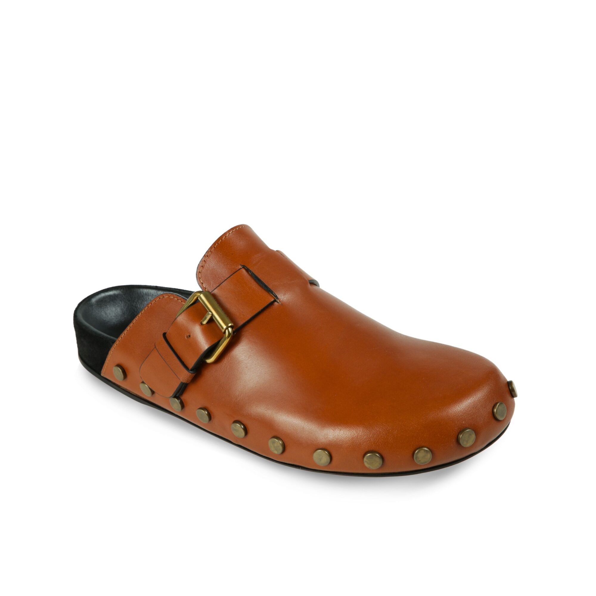 Mirvin Slides Isabel Marant. Design in pelle liscia, tacco aperto e punta arrotondata. Cinturino superiore in pelle con fibbia e borchie rotonde lungo il bordo suola.