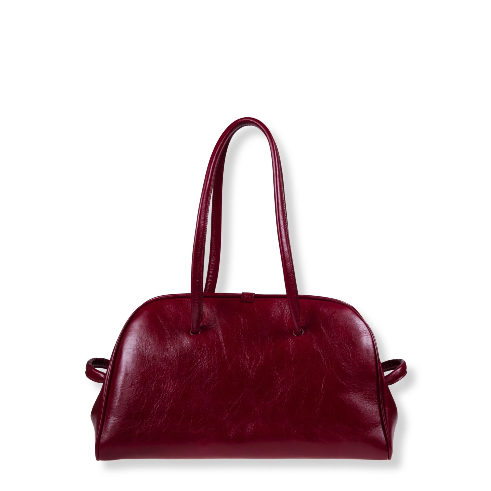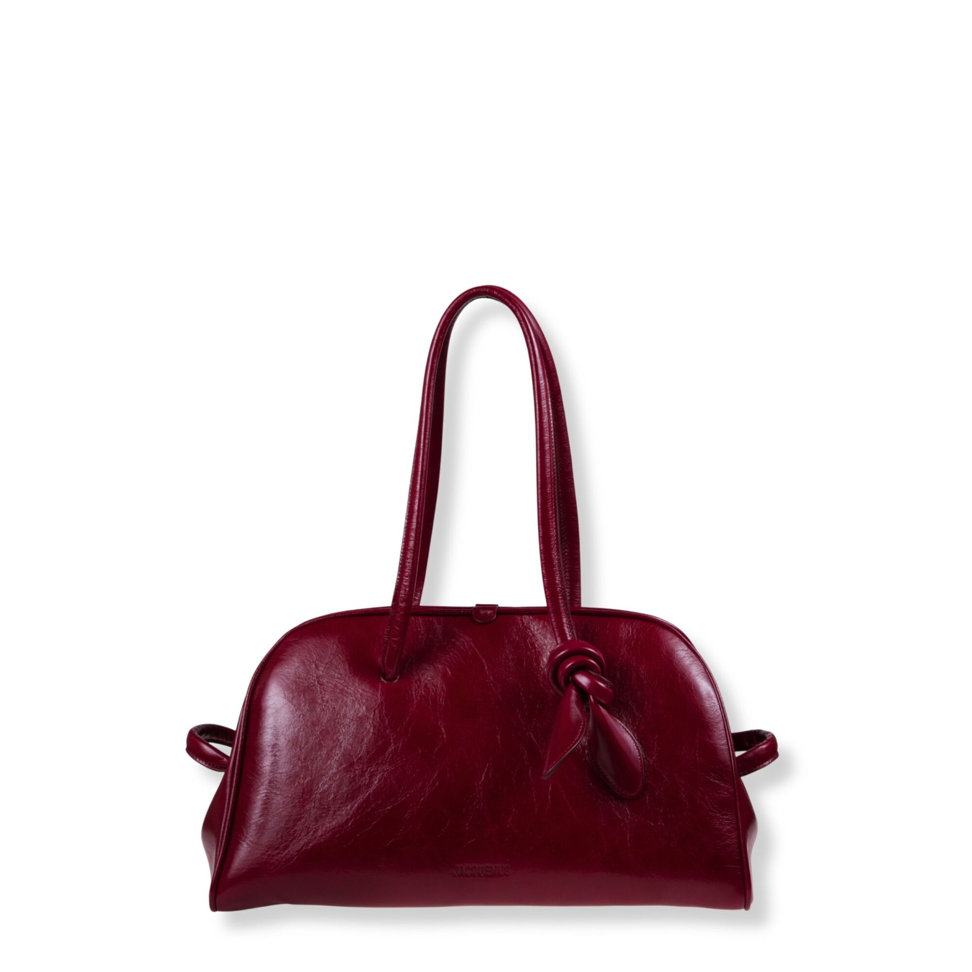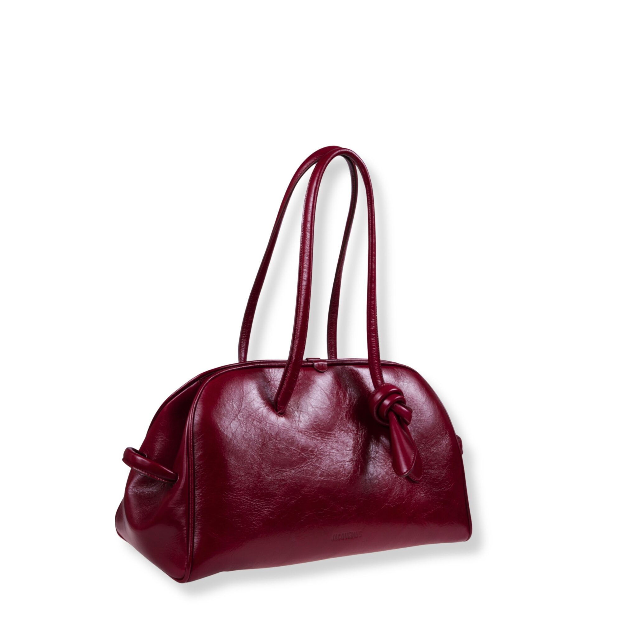 Turismo Jacquemus. Modello bowling, in pelle lucida con finitura vintage. Manici doppi coordinati con dettaglio annodato sull’estremità inferiore e chiusura a zip superiore.