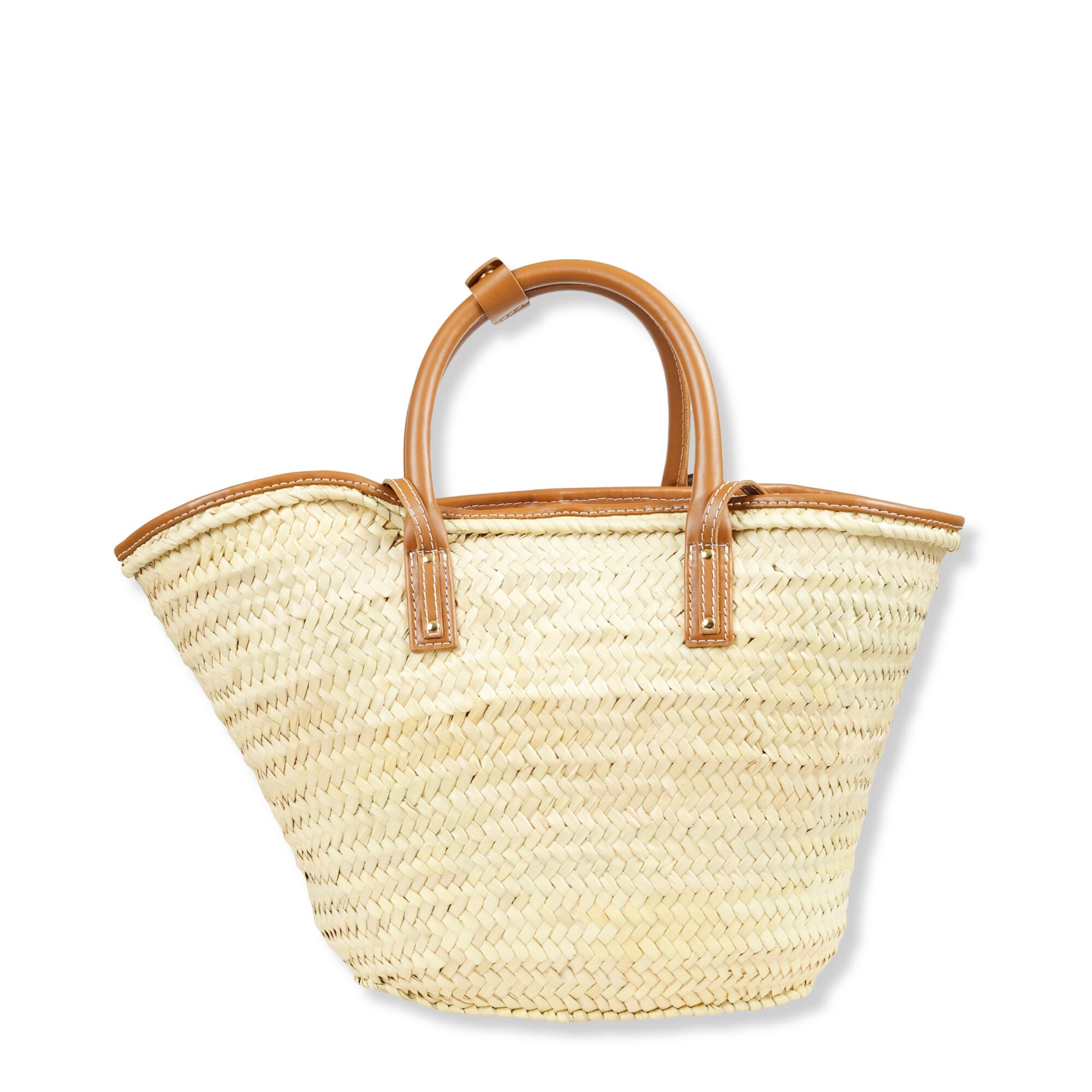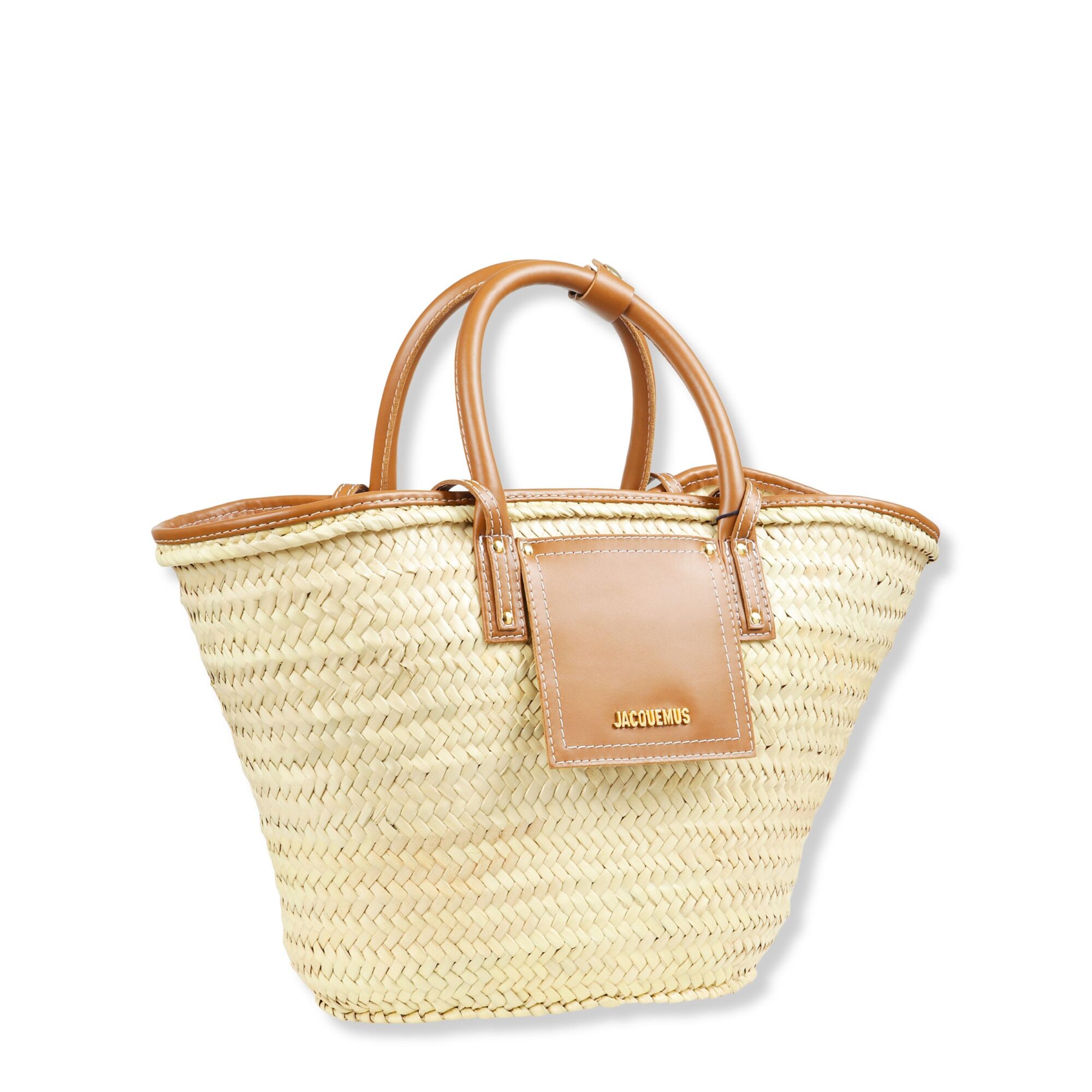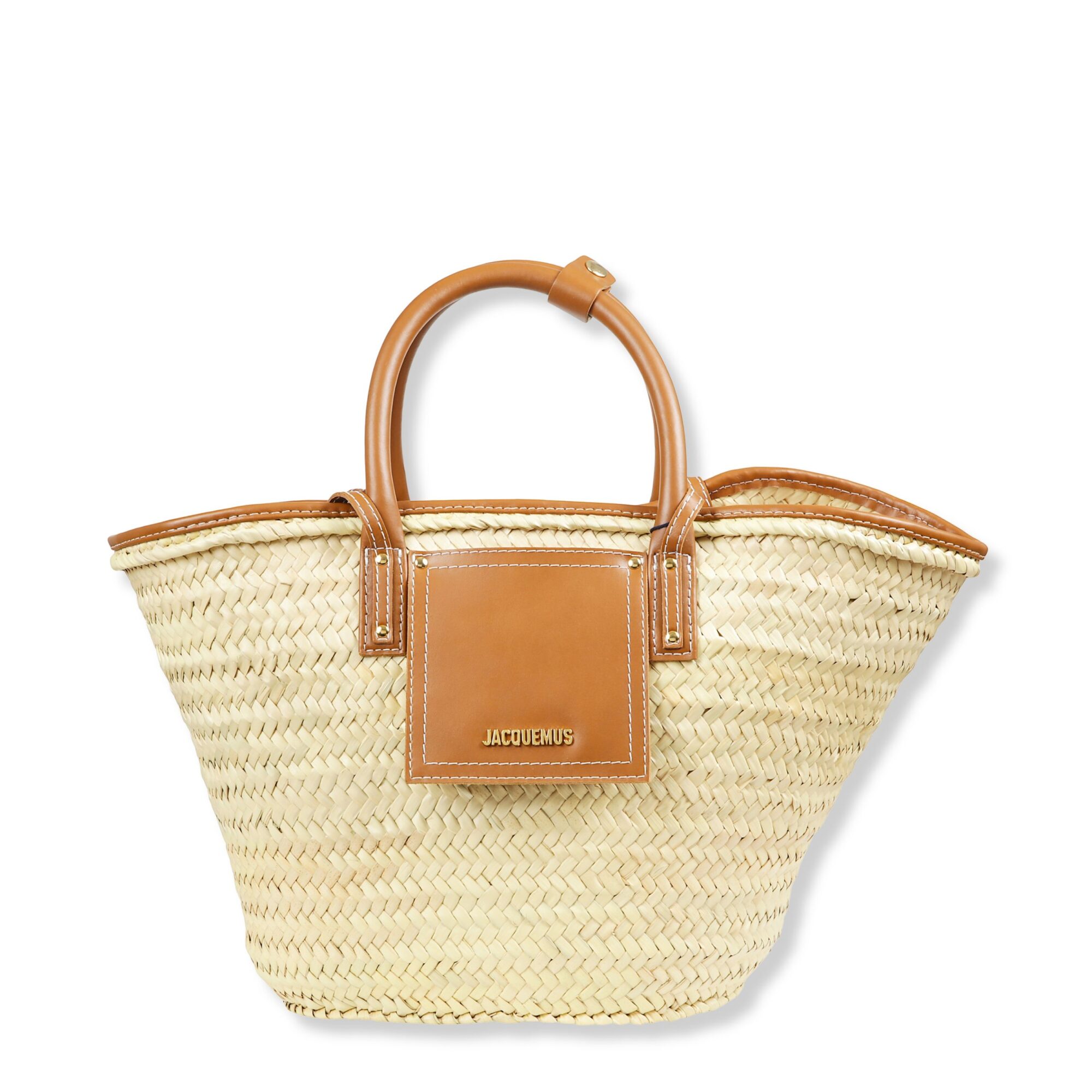 Le Panier Soli Jacquemus. Struttura morbida in paglia intrecciata con dettagli in pelle liscia. Doppio manico superiore e patta frontale con logo del brand.