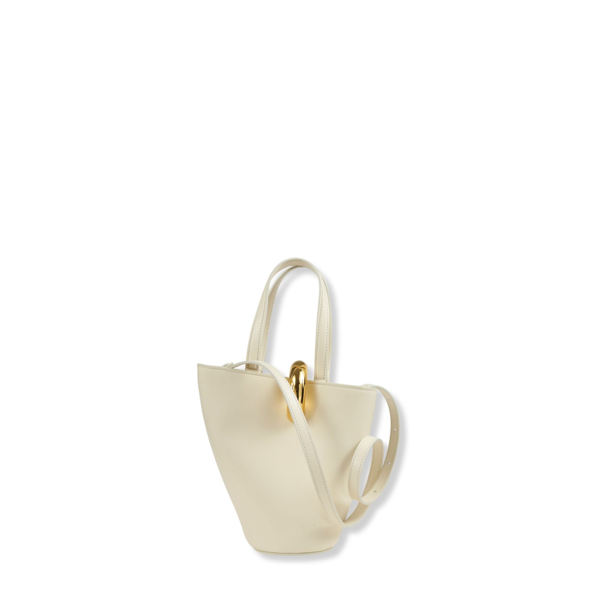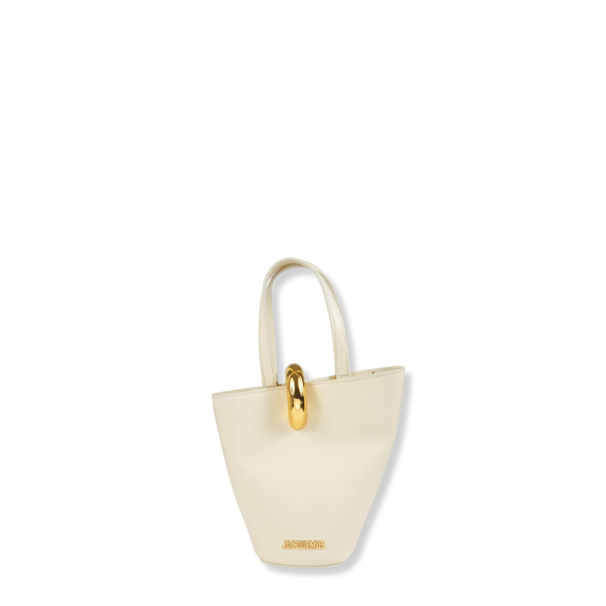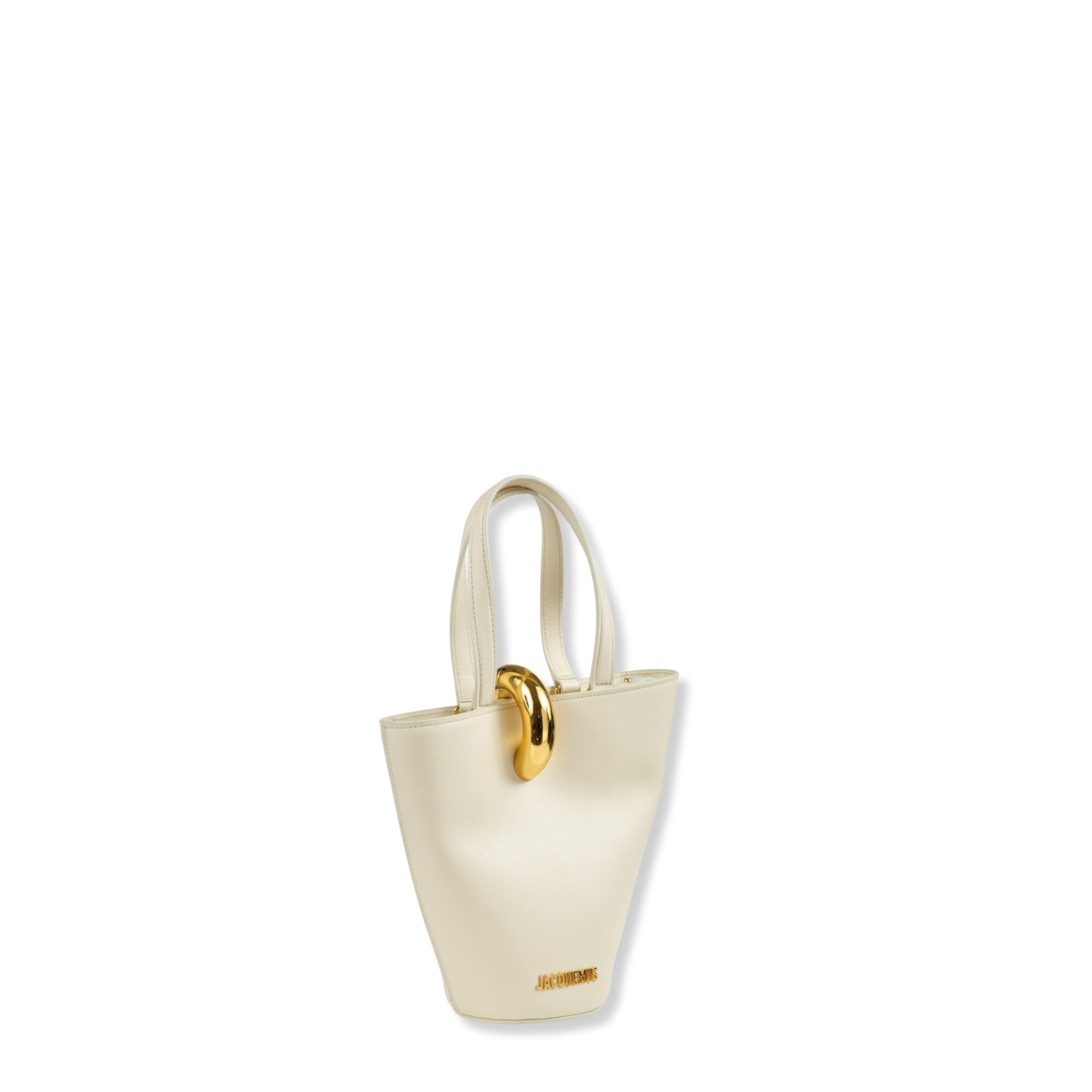 Le Petit Bambola Jacquemus. Modello bucket con orlo superiore asimmetrico e chiusura con anello decorativo. Doppio manico superiore e tracolla removibile.