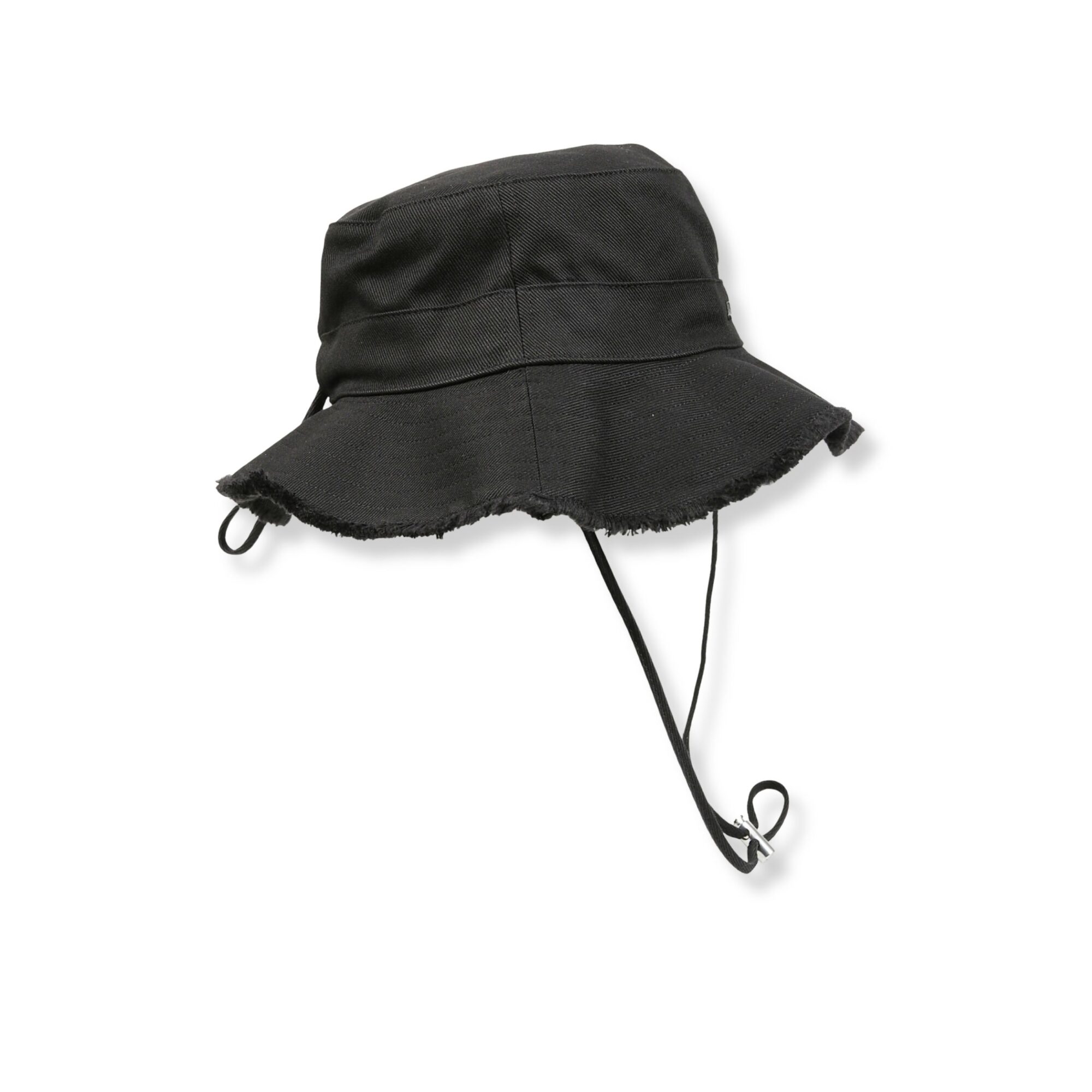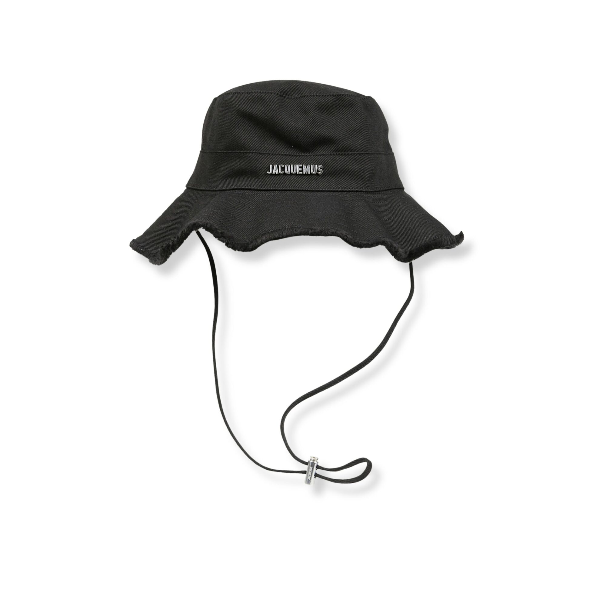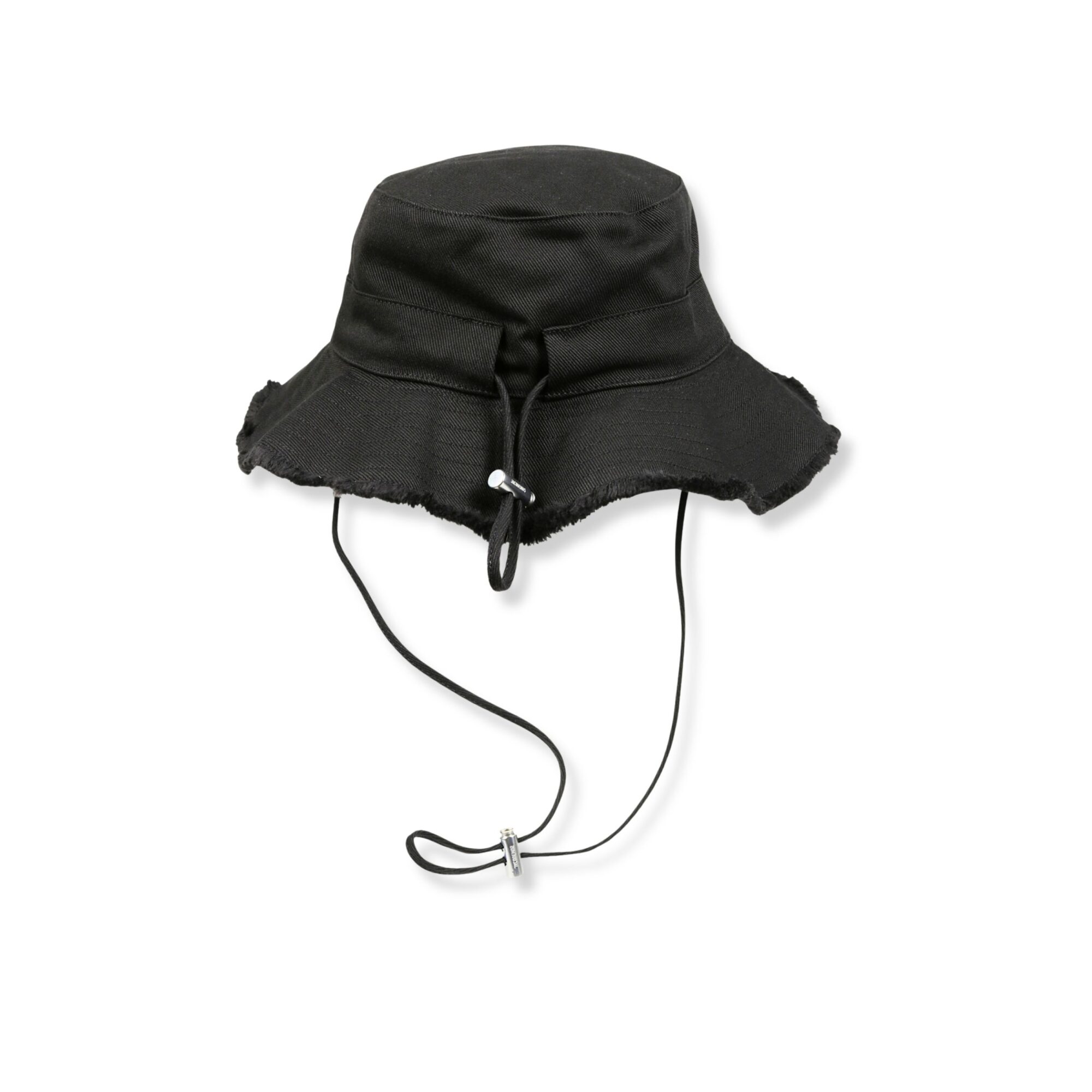 Le bob Artichaut Jacquemus. Modello da esploratore in cotone con lungo cordoncino regolabile, tesa con bordi sfrangiati e logo del brand sul davanti.