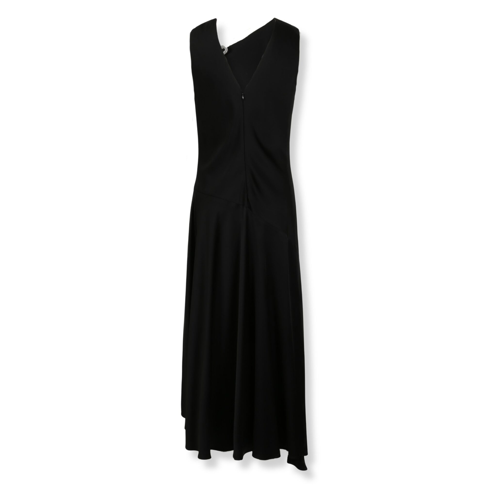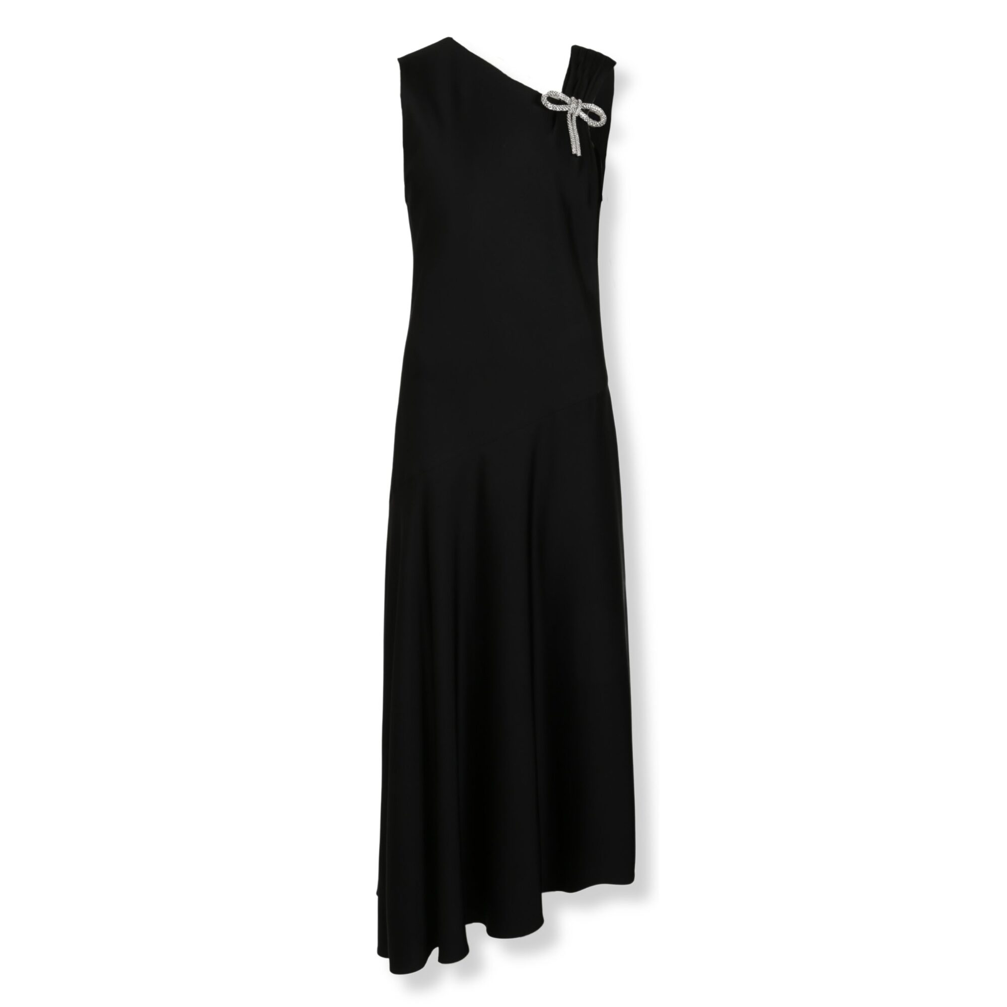 Abito da sera Jil Sander in envers satin. Silhouette lineare, spallina sinistra arricciata con fiocco decorativo, retro con ampio scollo a V e zip a scomparsa, gonna con fondo svasato.