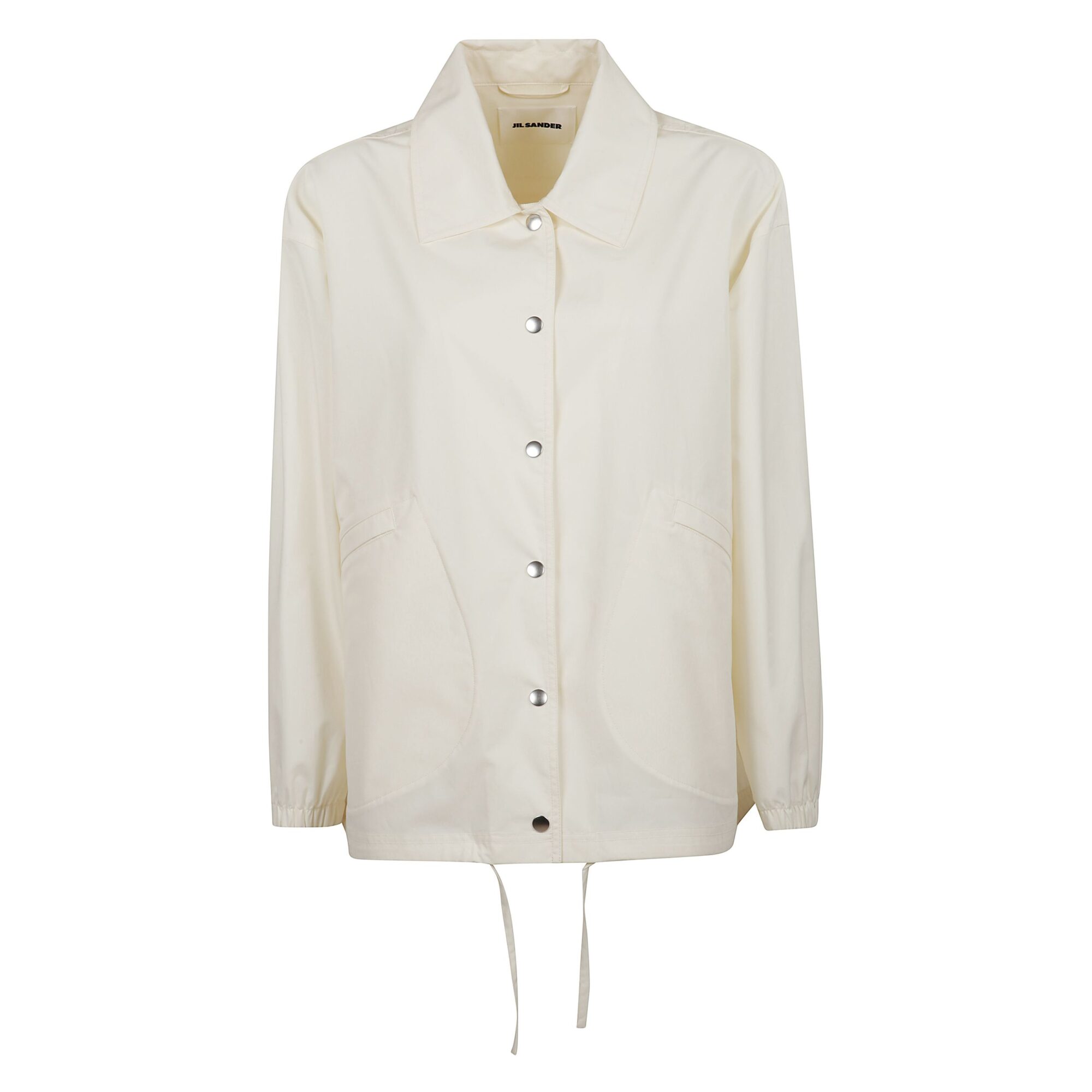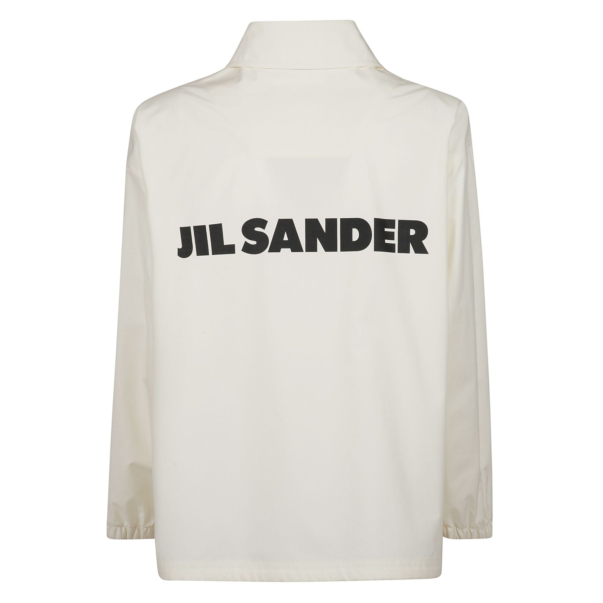 Giacca in cotone Jil Sander. Collo a camicia e chiusura con bottoni a pressione. Polsini elasticizzati. Logo del brand stampato sul retro. Fondo con coulisse.