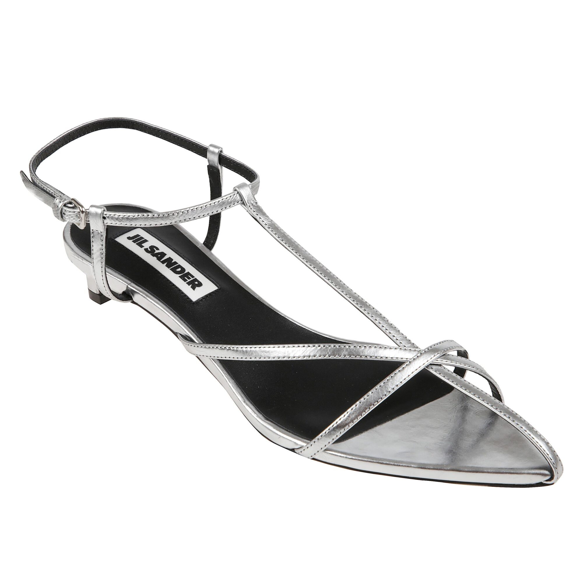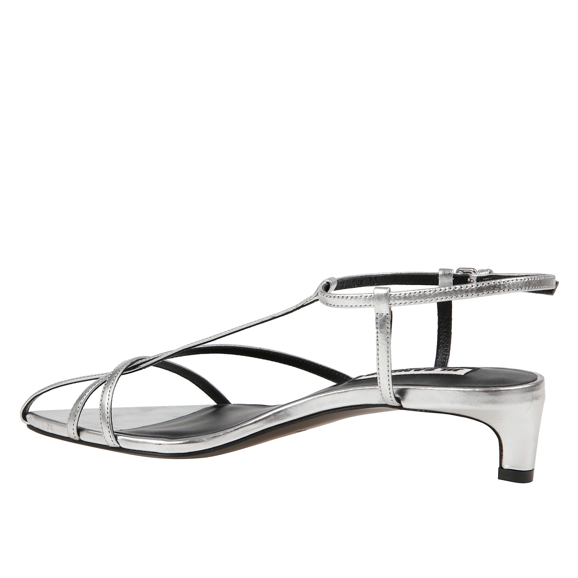 Sandali in pelle argentata. Struttura delicata a sottili cinturini con chiusura regolabile. Tacco kitten basso. Punta affusolata.