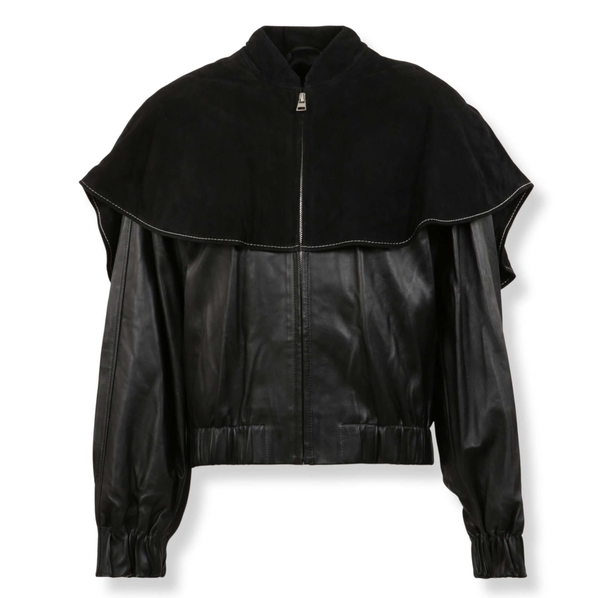 Giacca in pelle JW Anderson, con carré superiore in suede effetto mantella. Chiusura frontale a zip e collo alto. Cuciture a contrasto sul bordo del carré. Orlo e polsini elasticizzati. Zip decorativa sul retro.