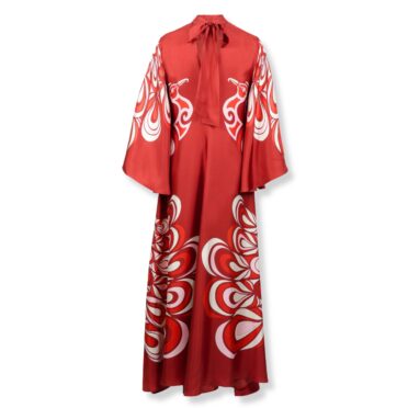 Swing Dress La Double J. Design in twill di seta con fantasia Phoenix. Girocollo, taglio semplice, con orlo inferiore con frange.